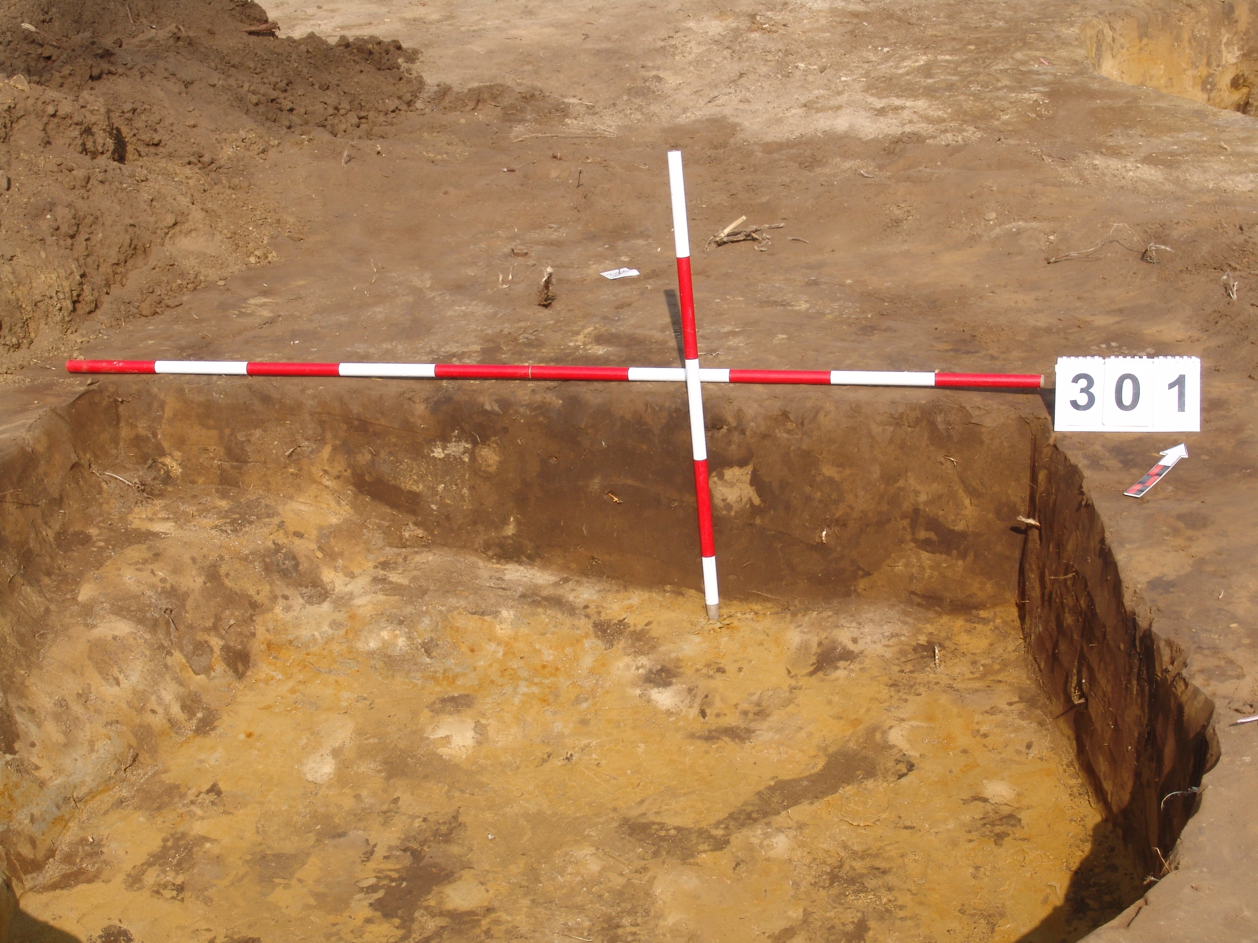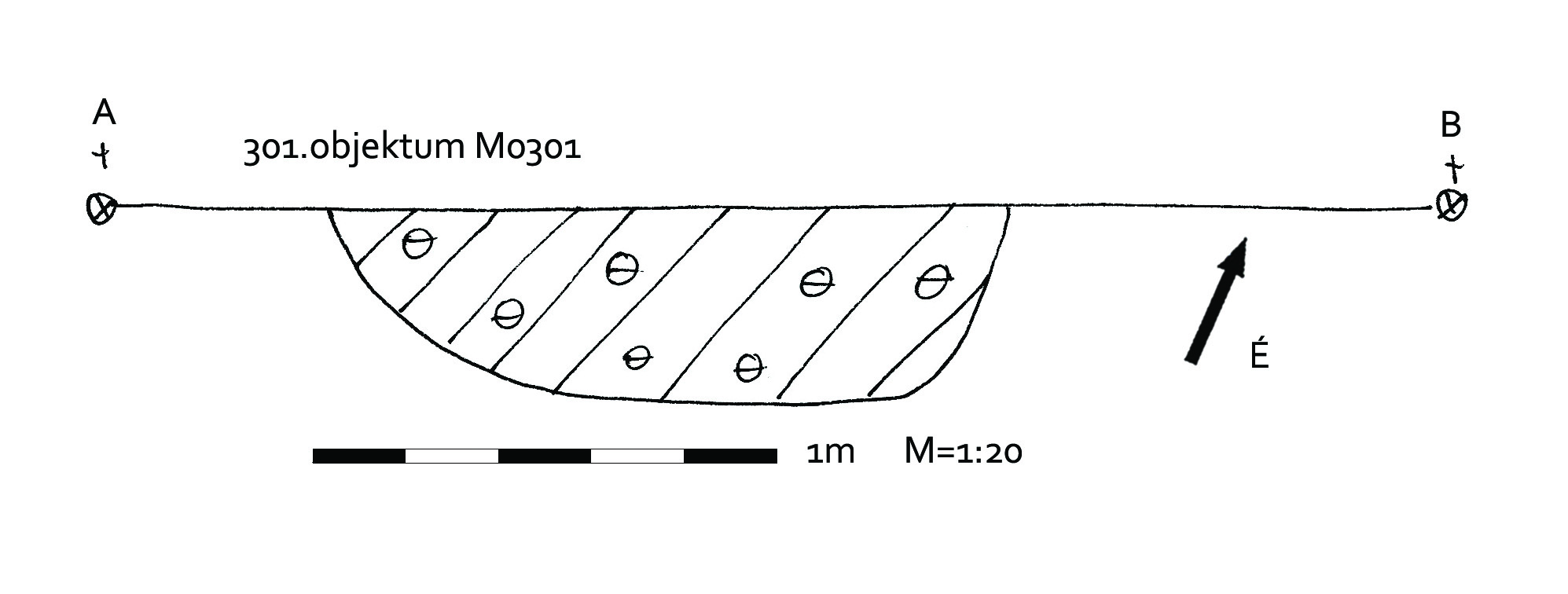 A 277. obj. É-i oldalán bontás közben rajzolódott halványan egy kerek folt. Ívelt oldalú, egyenes aljú, kör alaprajzú gödör. Betöltése egynemű barnásszürke.