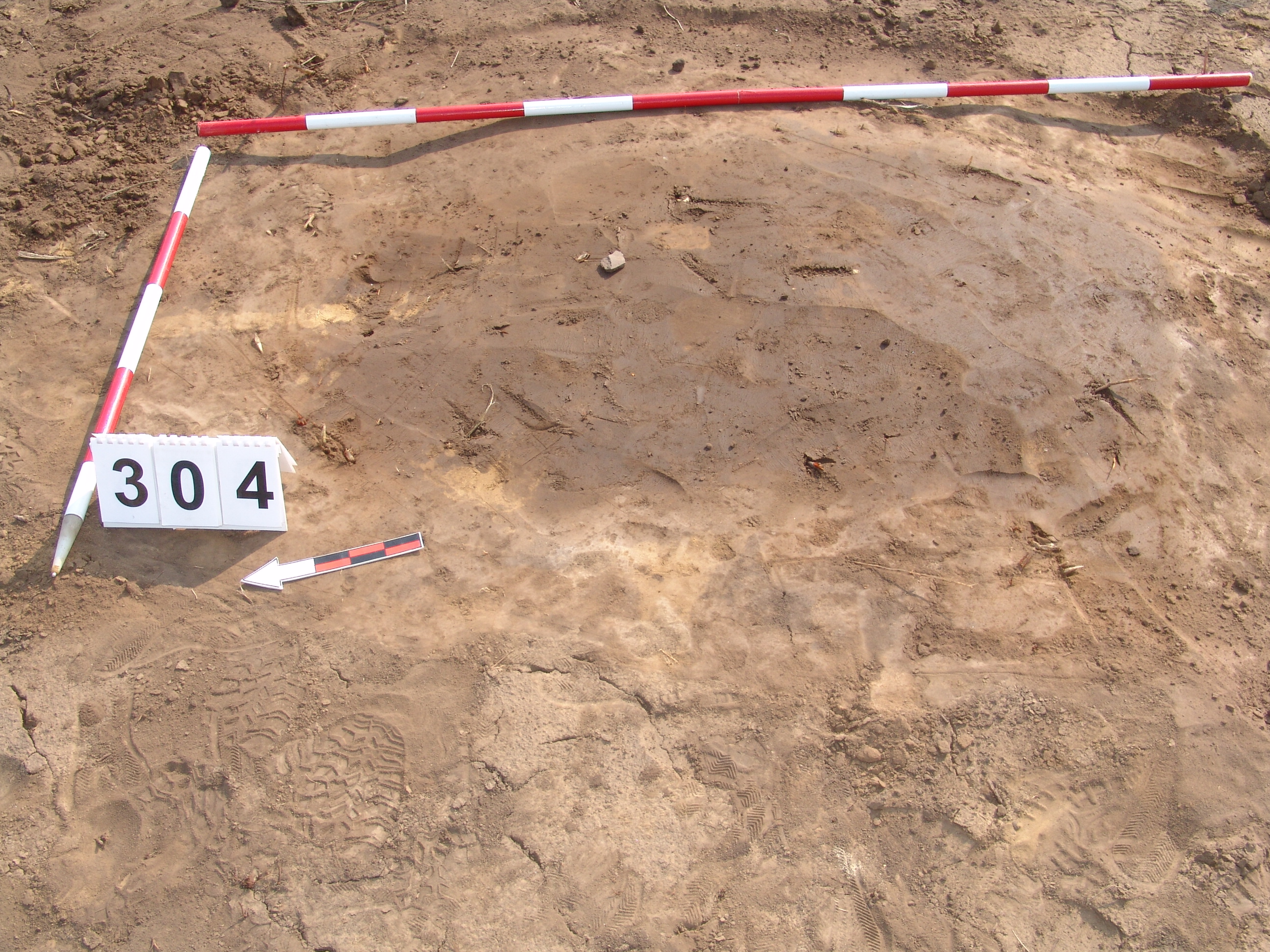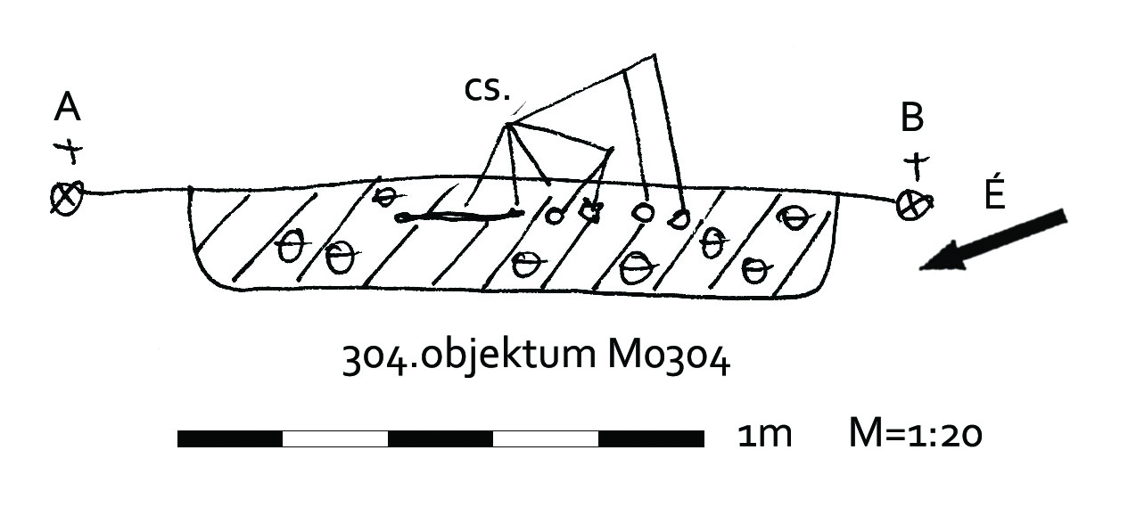 A 303. obj.-tól keleti irányban, 3 m-re jelentkező szürkésbarna ovális folt. Meredek falú, talán lekerekített négyszög alaprajzú, egyenes aljú gödör. Betöltése sötét barnásszürke.