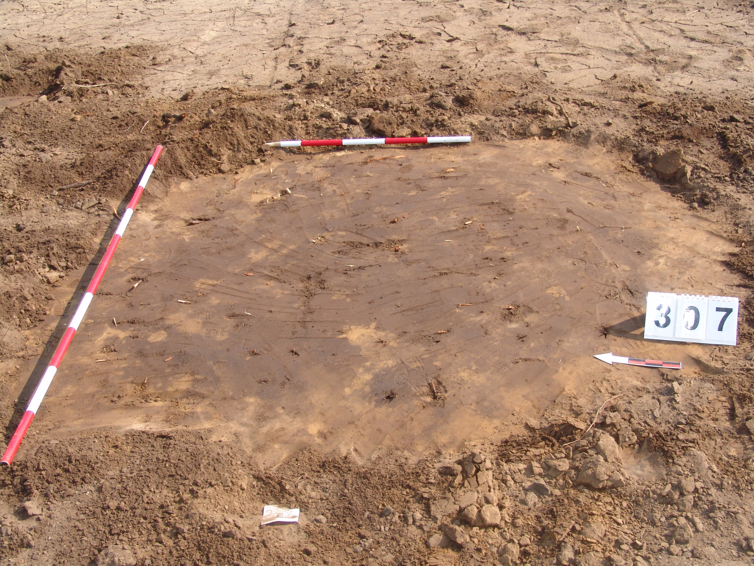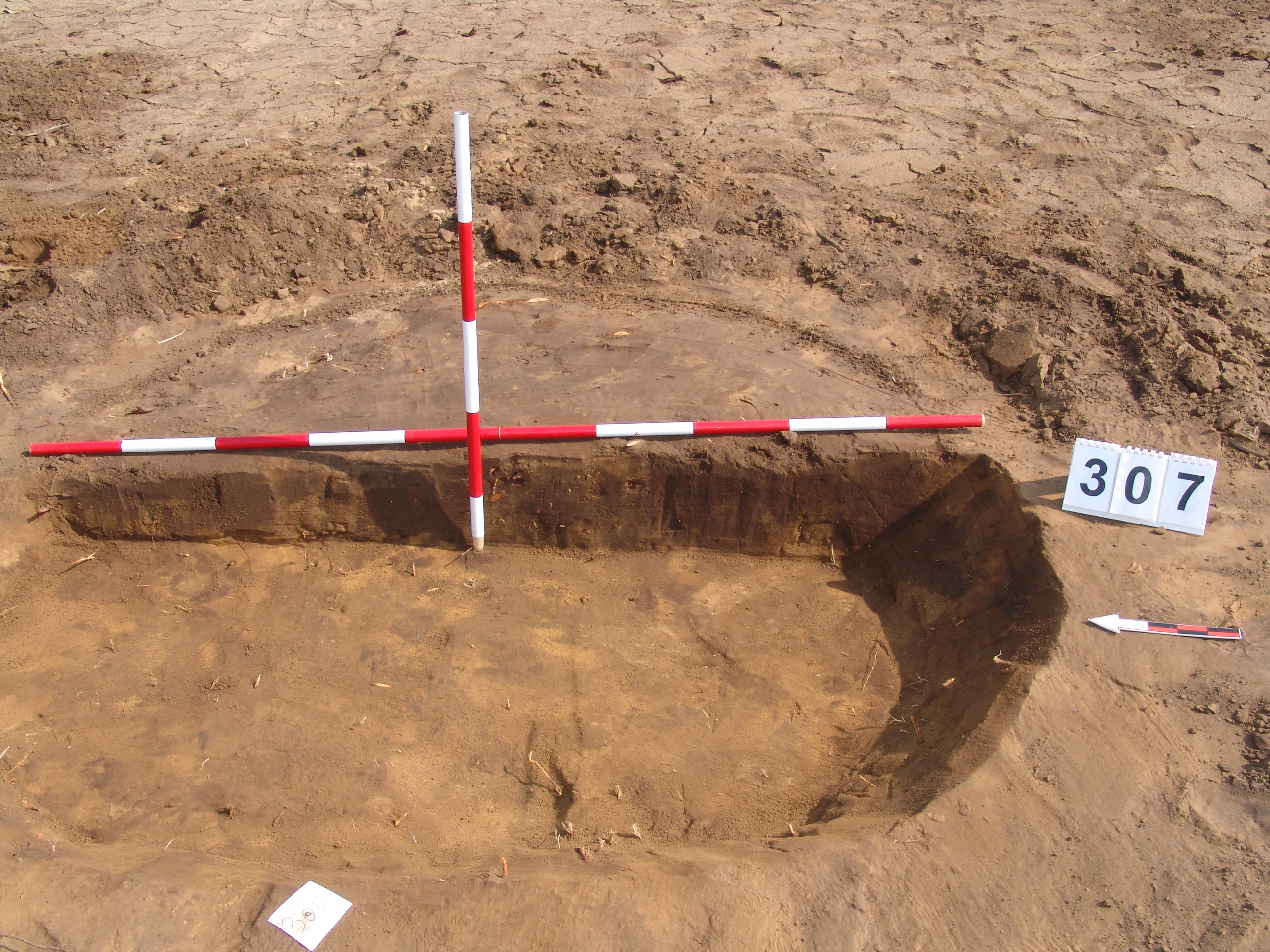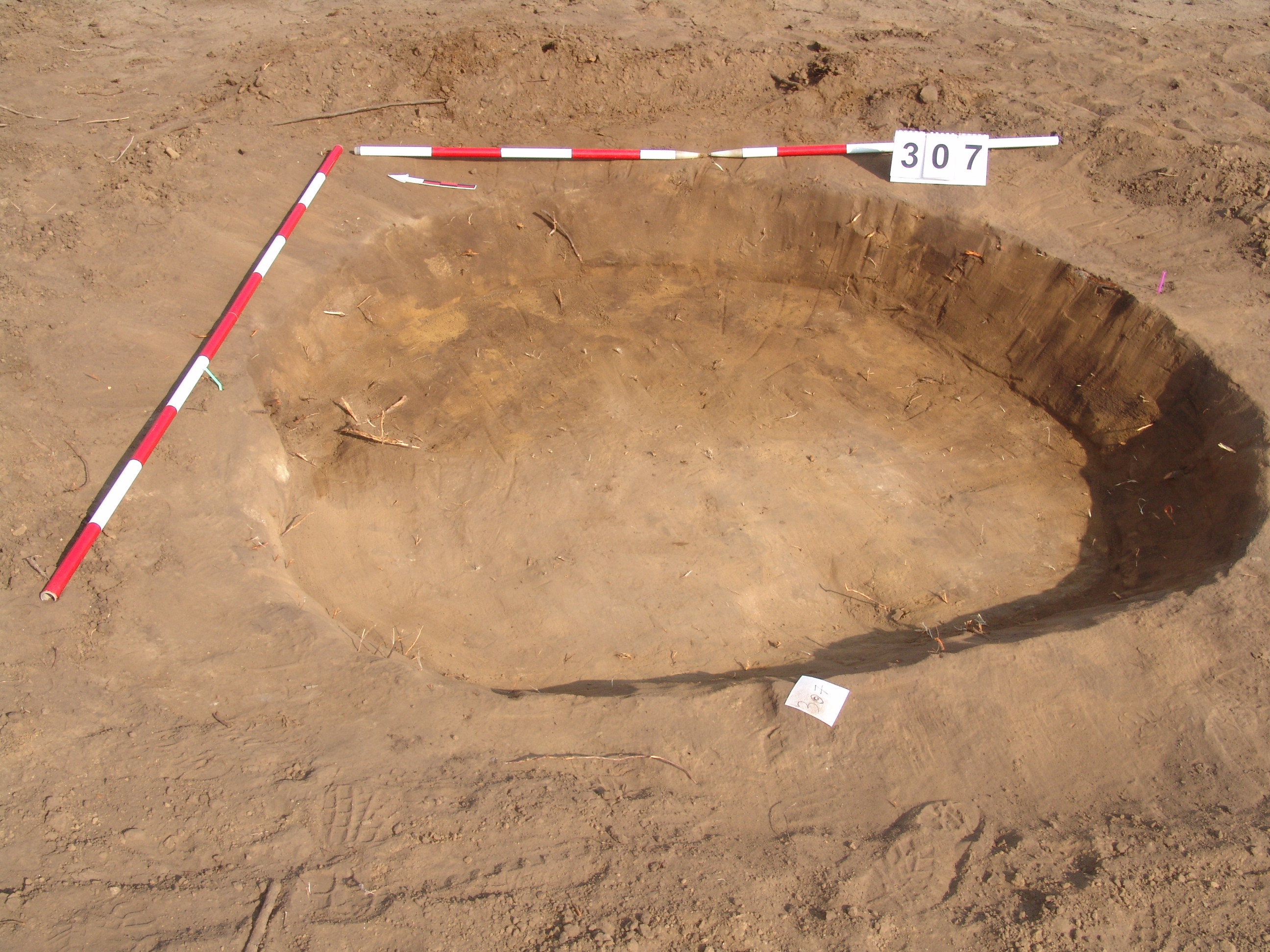 A 3816. karóról É-i irányban 2m-re jelentkező kerek szürkésbarna folt. Meredek falú, egyenes aljú, kör alaprajzú gödör. Betöltése egynemű, barnásszürke. Átm. Fent: É-D:200 Ny-K:190 lent:É-D:175 Ny-K:160 M:24 cm
