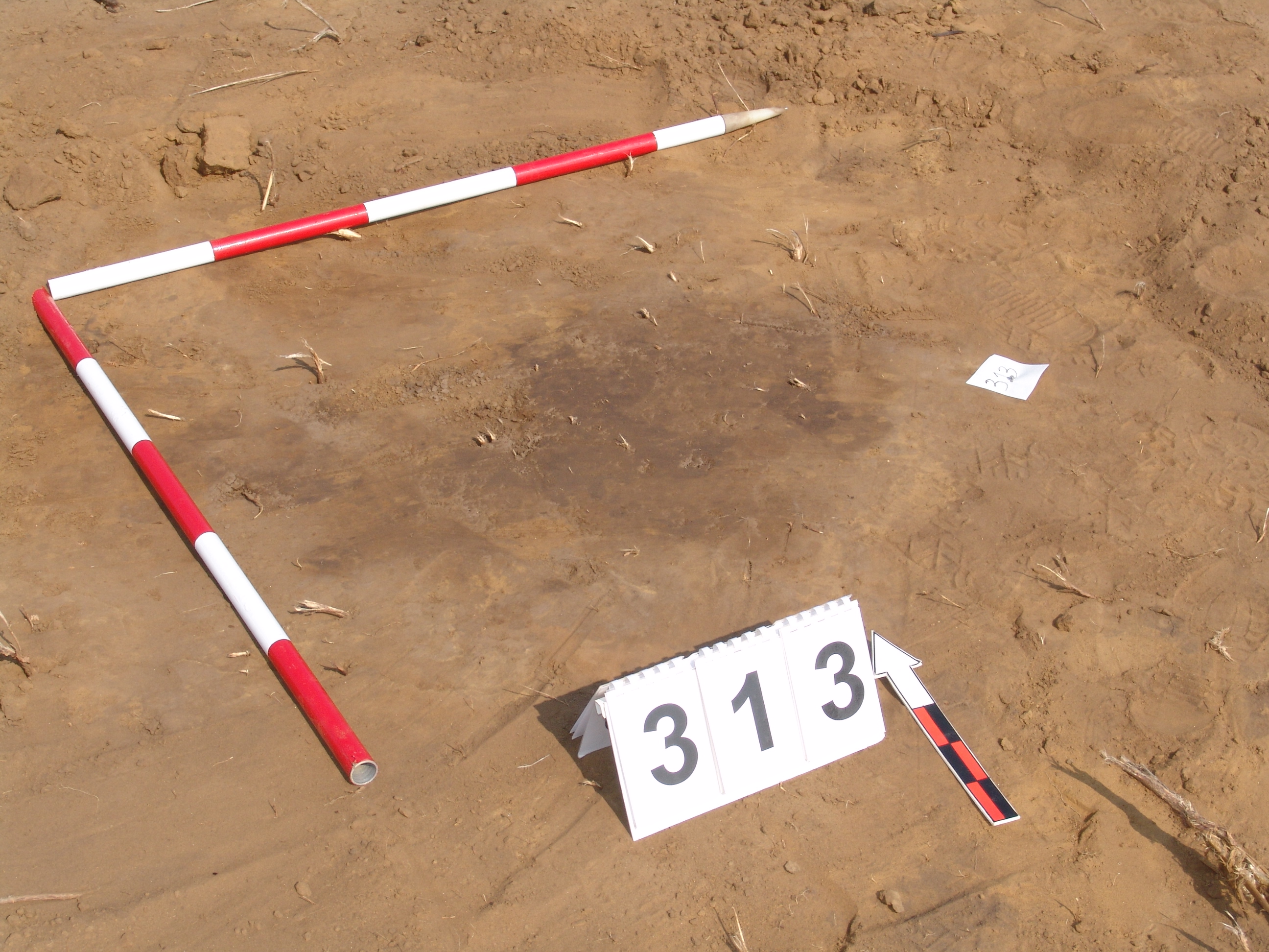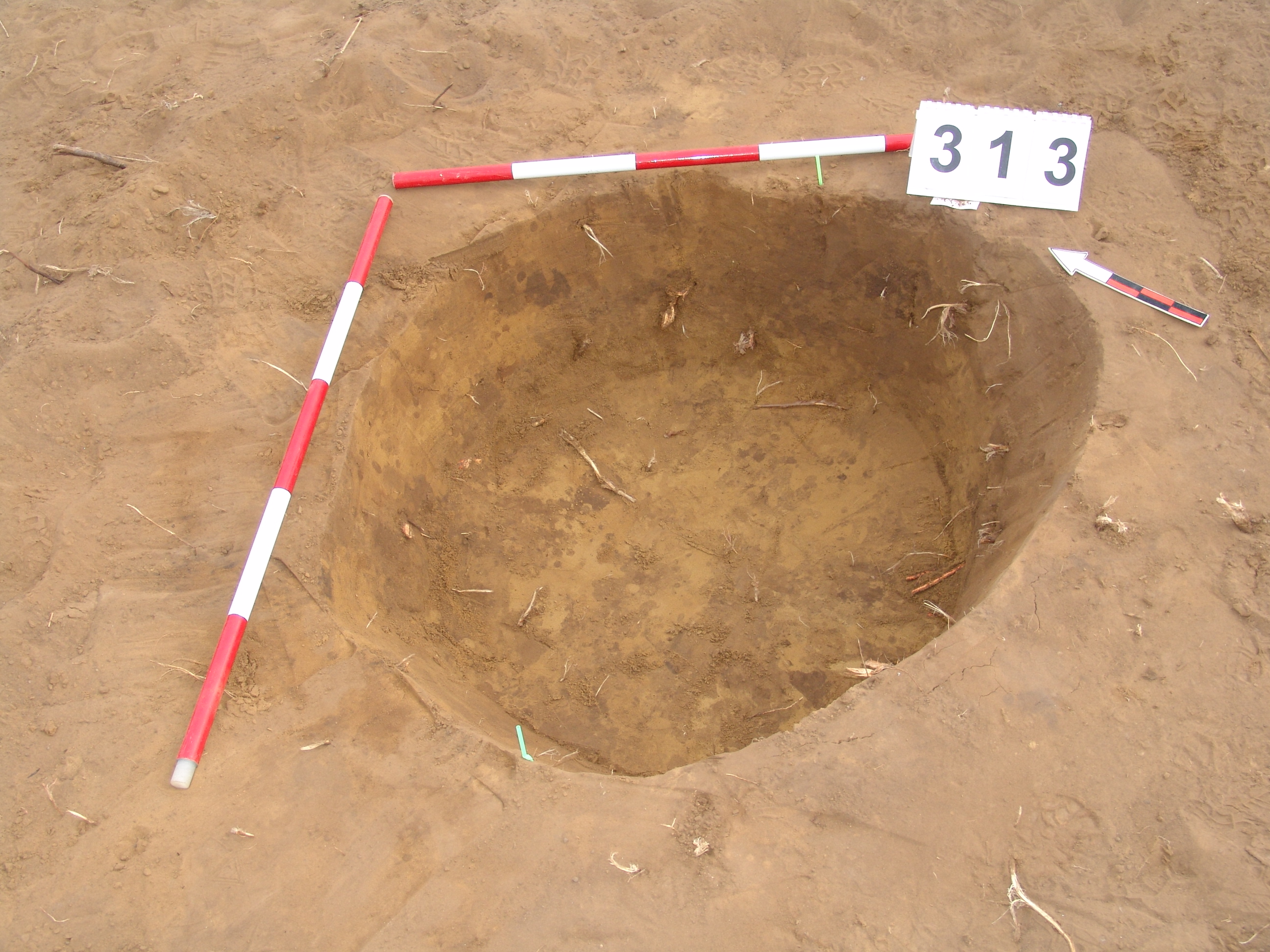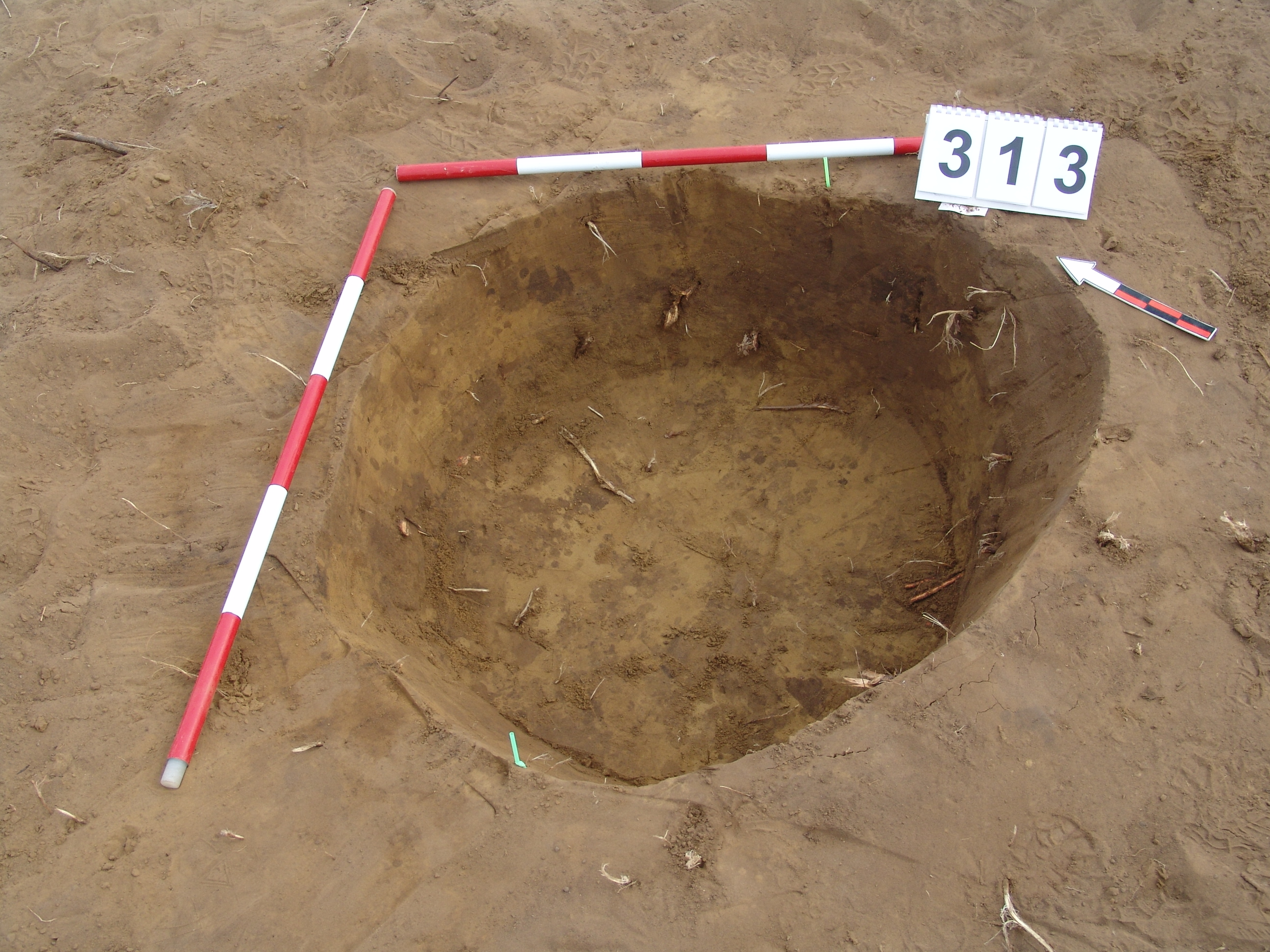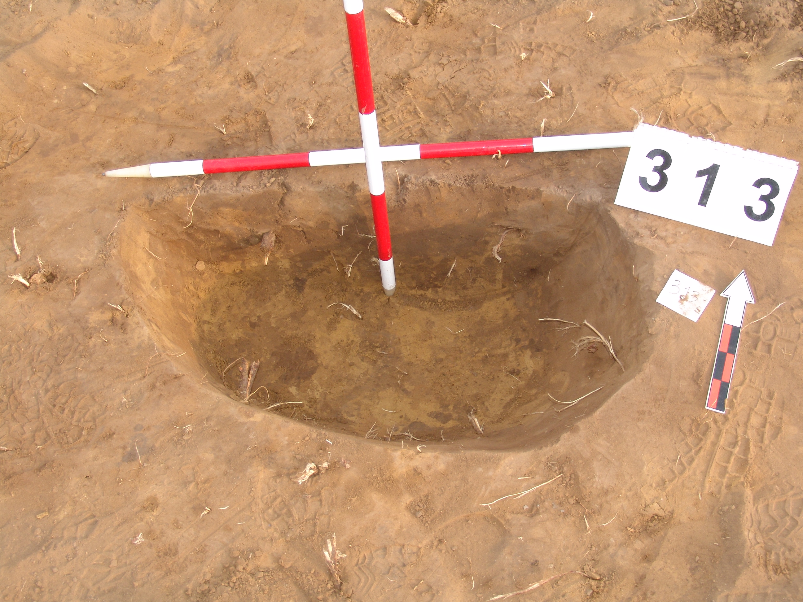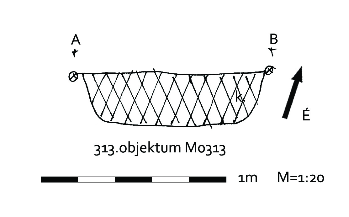 A 310. objektumtól É-ra elúszó kerek folttal jelentkező gödör. Ívelt oldalú, egyenes aljú kis gödör. Betöltése: egynemű barnásszürke. Átm. Fent: É-D:95 Ny-K:100 lent:É-D:75 Ny-K:80 M:28-38