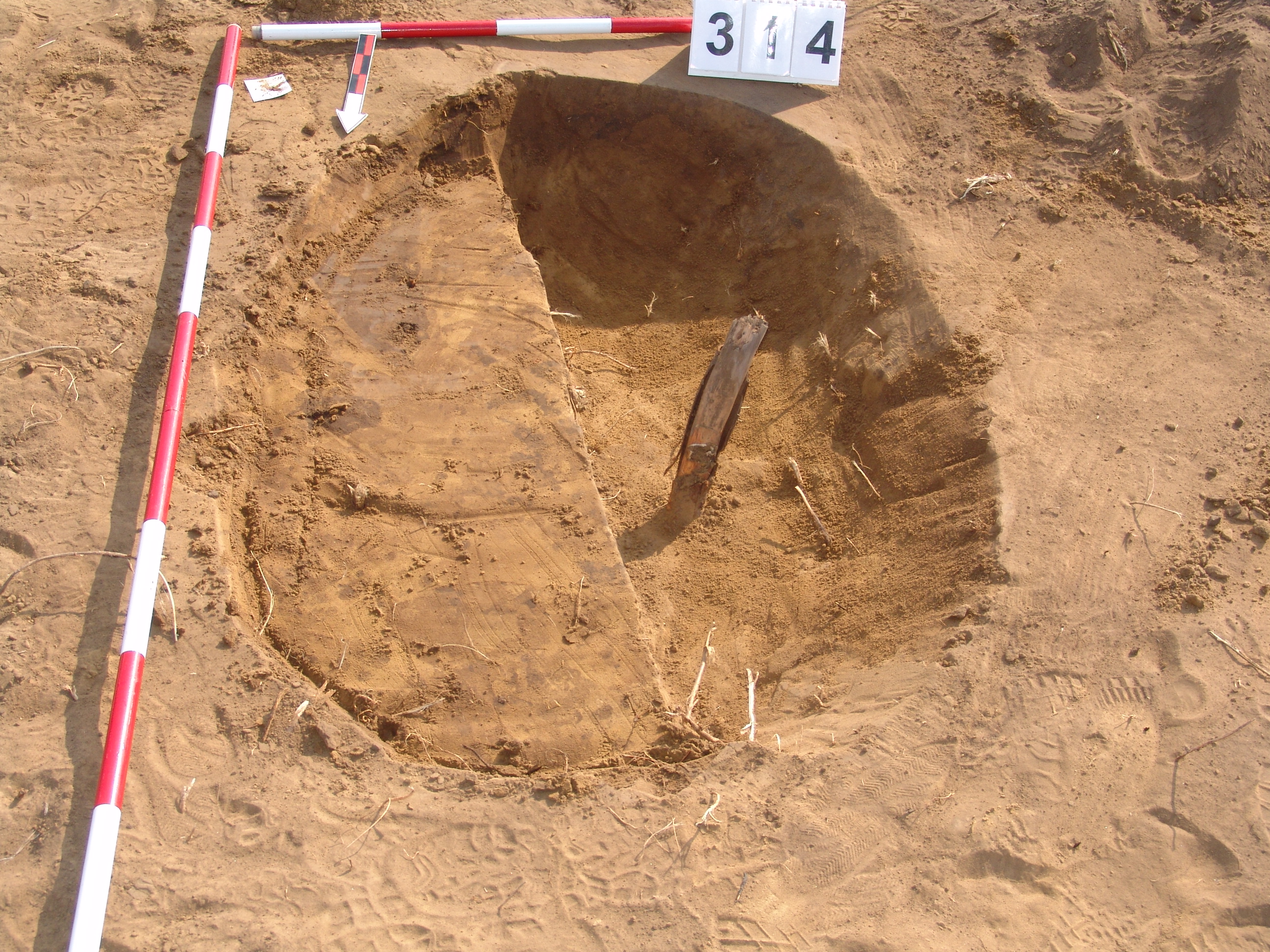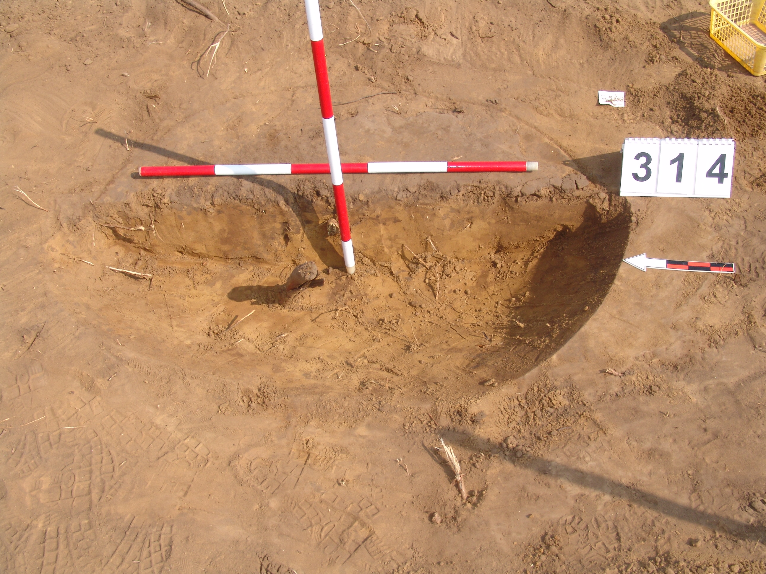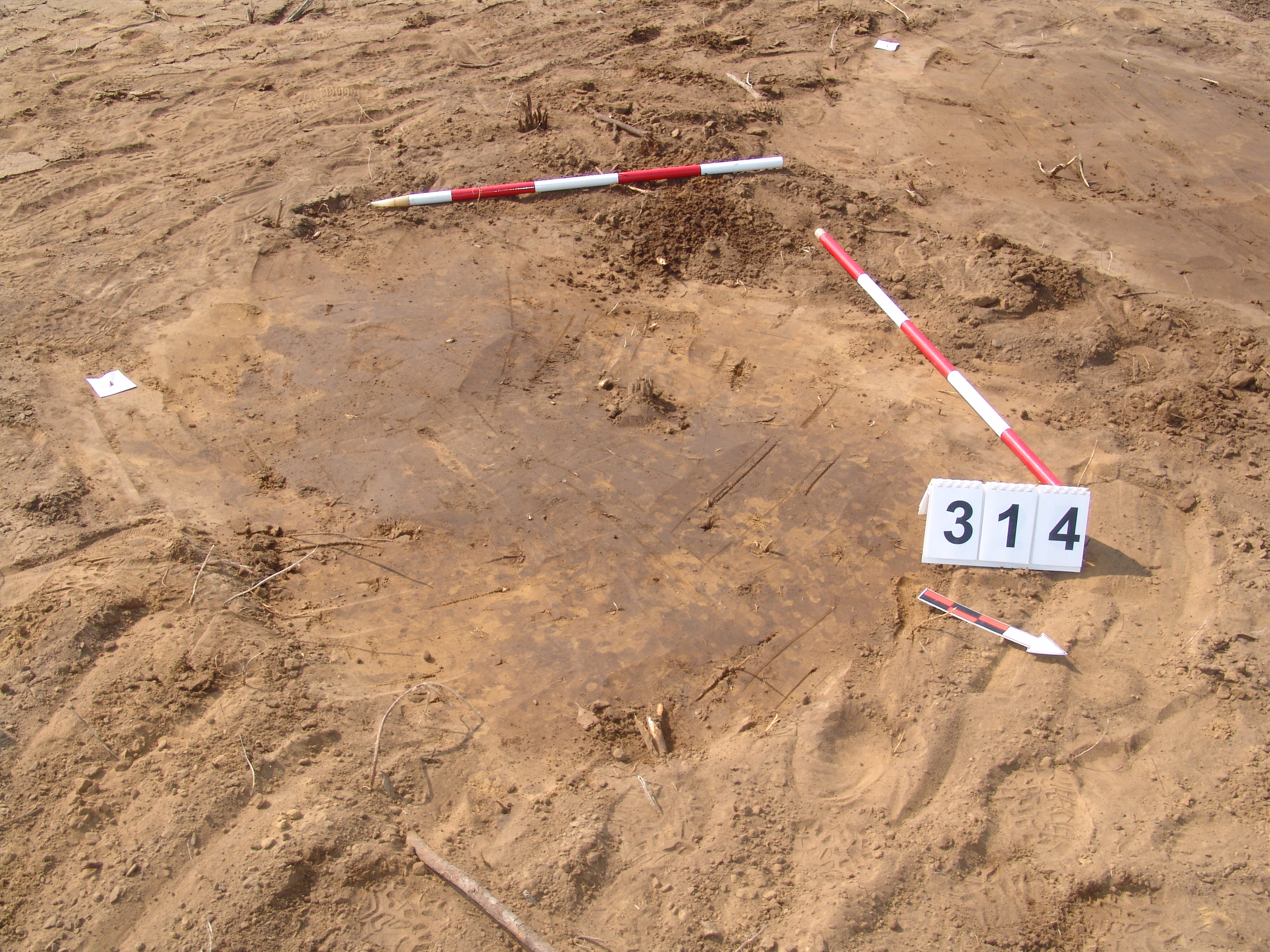 A 4113 karóról ÉK-re ½ m-re kissé elúszó, kerek folt jelentkezett sok gyökérrel. Egy kör alaprajzú gödör aljának 2-3 cm vastag rétegben megmaradt legalja. Betöltése egynemű barnásszürke. A Ny-i oldalát túlbontottuk az alján.