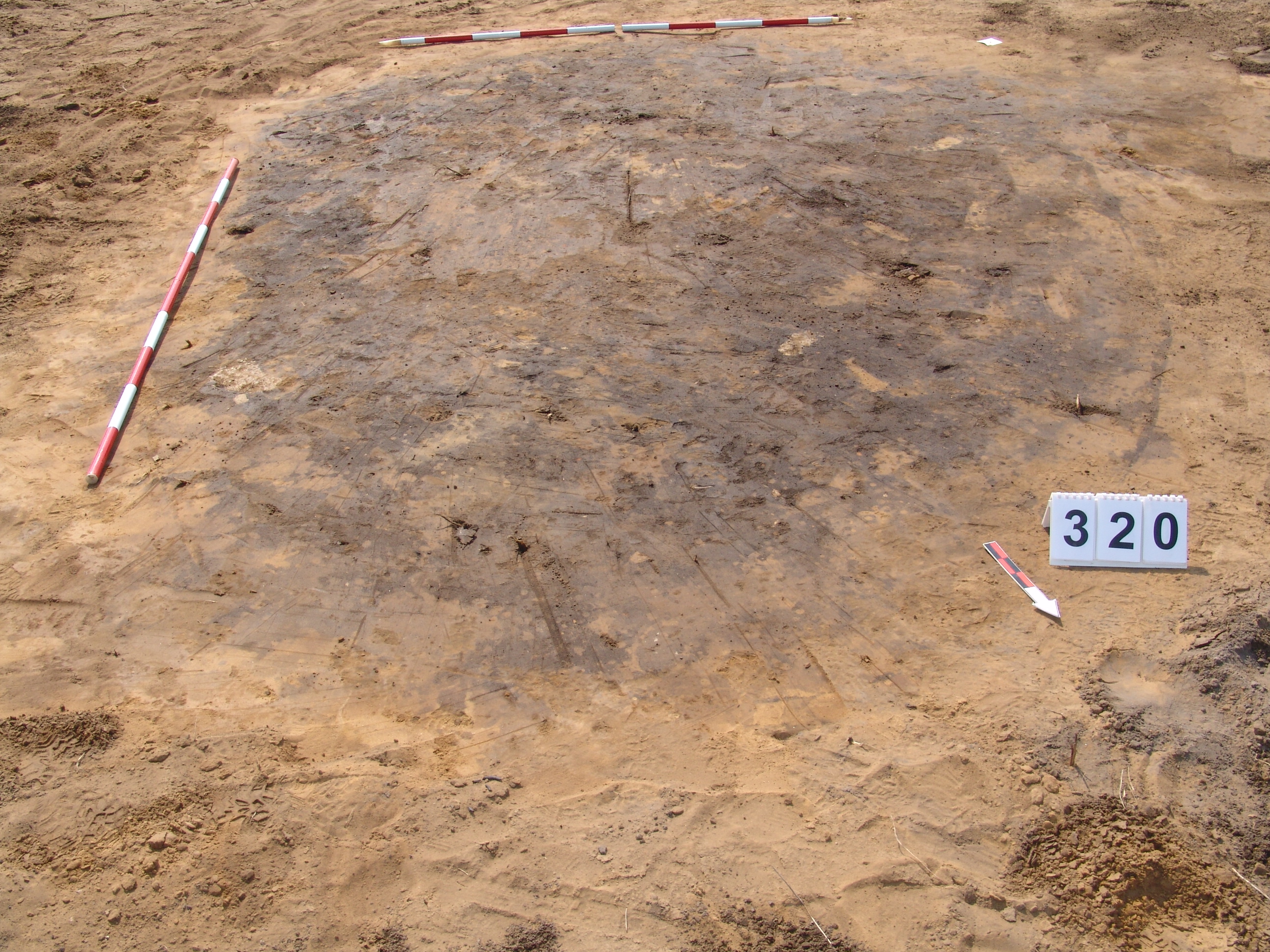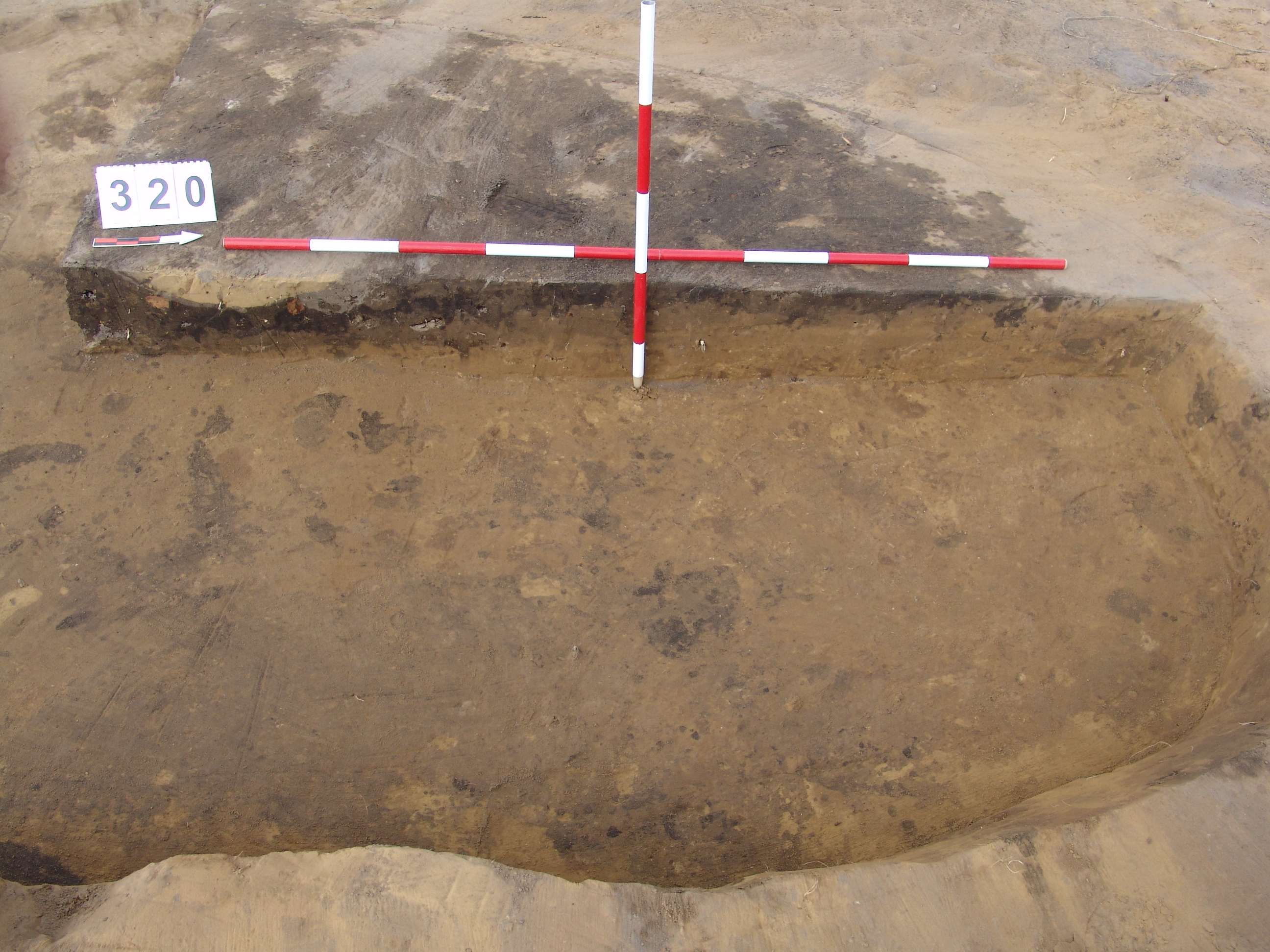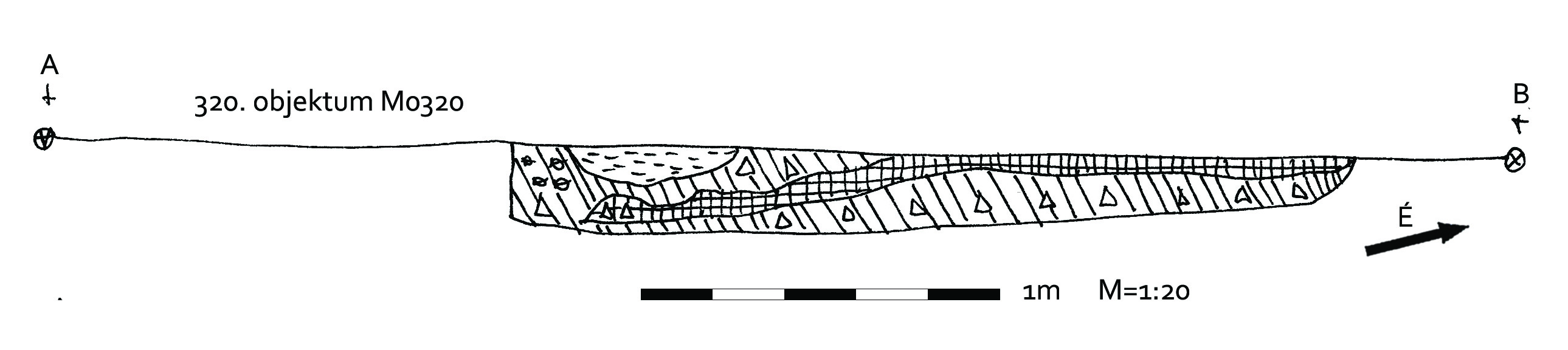 Alját és oldalát erősen túlbontották a K-i felében. H:É-D:330 SZ:Ny-K:280 M:É:2cm D:25 cm É-felé erősen „felkap”. A DNy-i „sarkánál” kis kiugró folt jelentkezett /326. obj./ alatta.