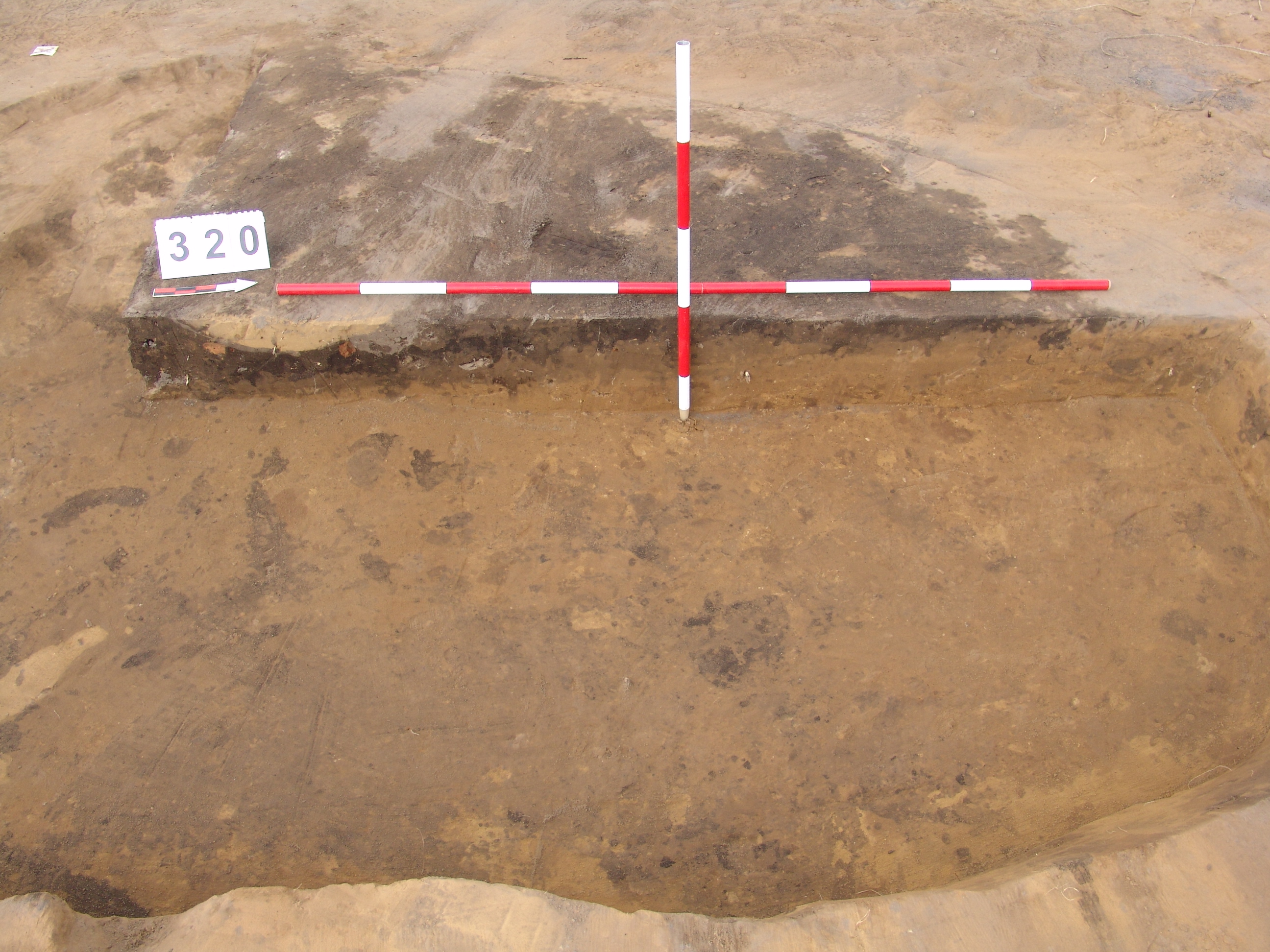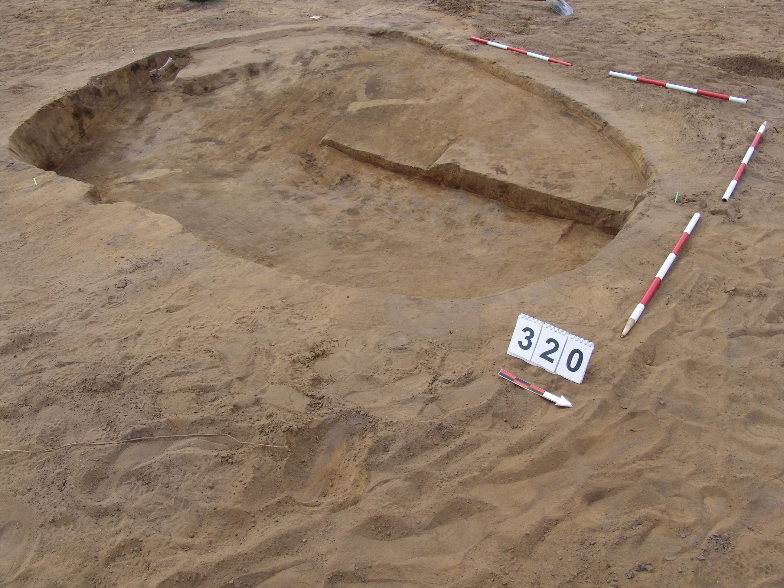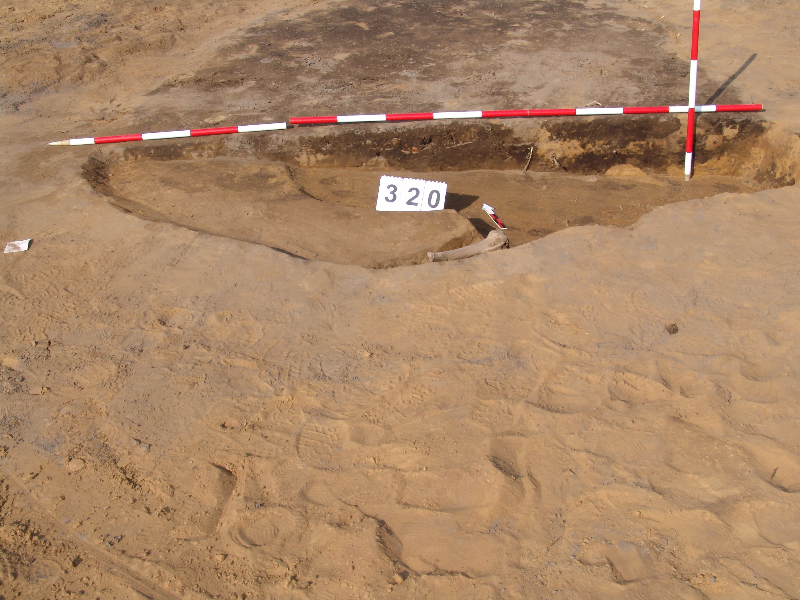 Alját és oldalát erősen túlbontották a K-i felében. H:É-D:330 SZ:Ny-K:280 M:É:2cm D:25 cm É-felé erősen „felkap”. A DNy-i „sarkánál” kis kiugró folt jelentkezett /326. obj./ alatta.