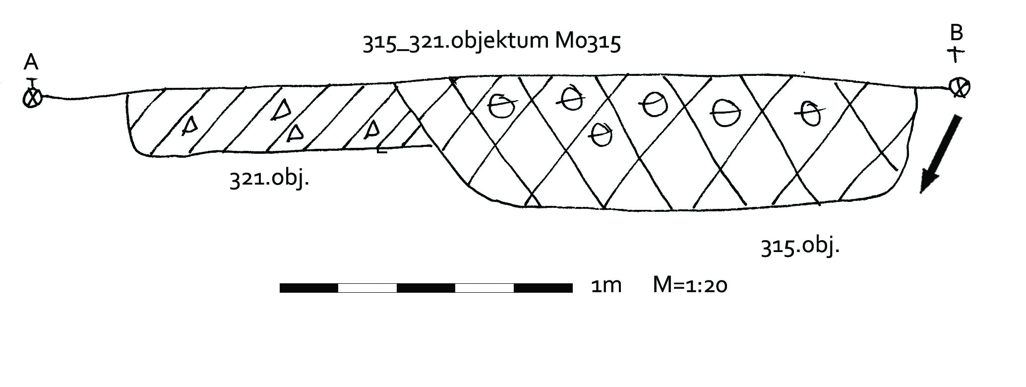 A 315 objektum ÉK-i széle alatt kisebb kerek folttal jelentkezett. Fala csaknem függőleges, alja egyenes. Szélét K-re túlbontották, ahogyan az alját is az É-i felében.