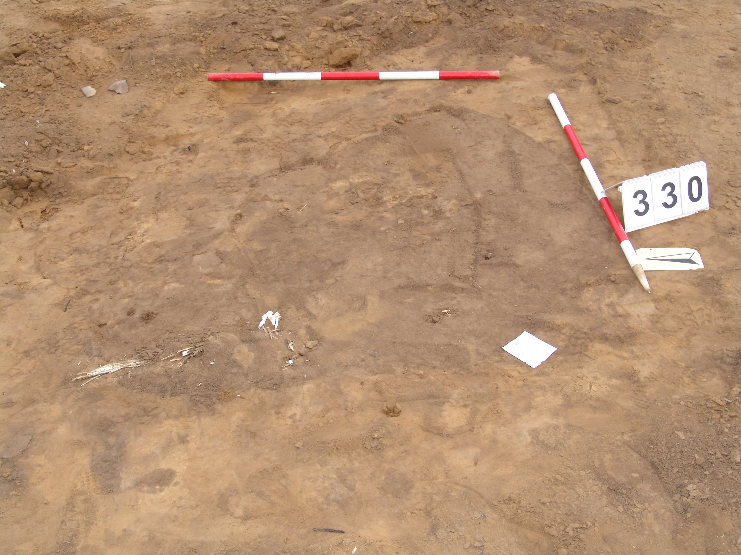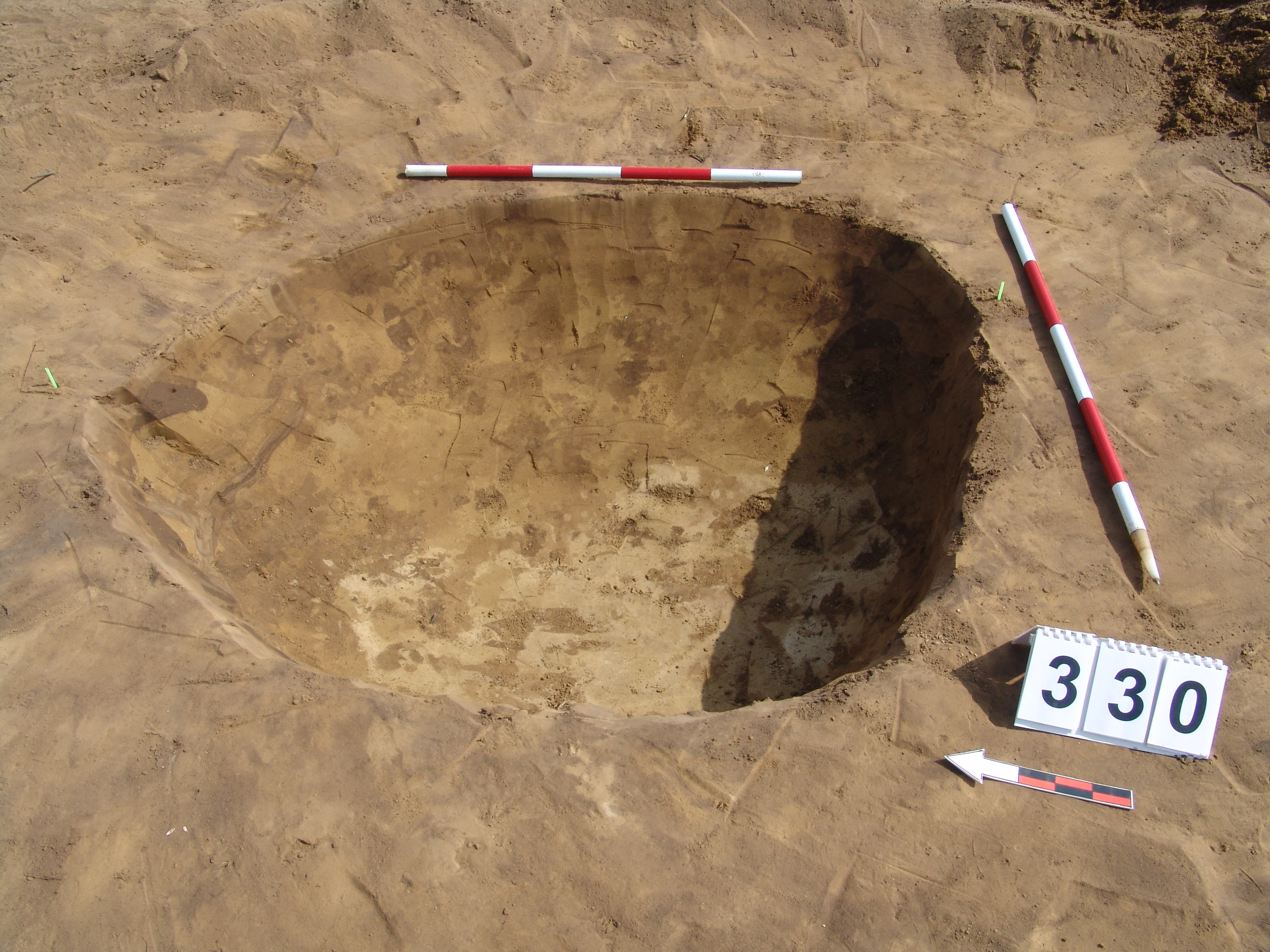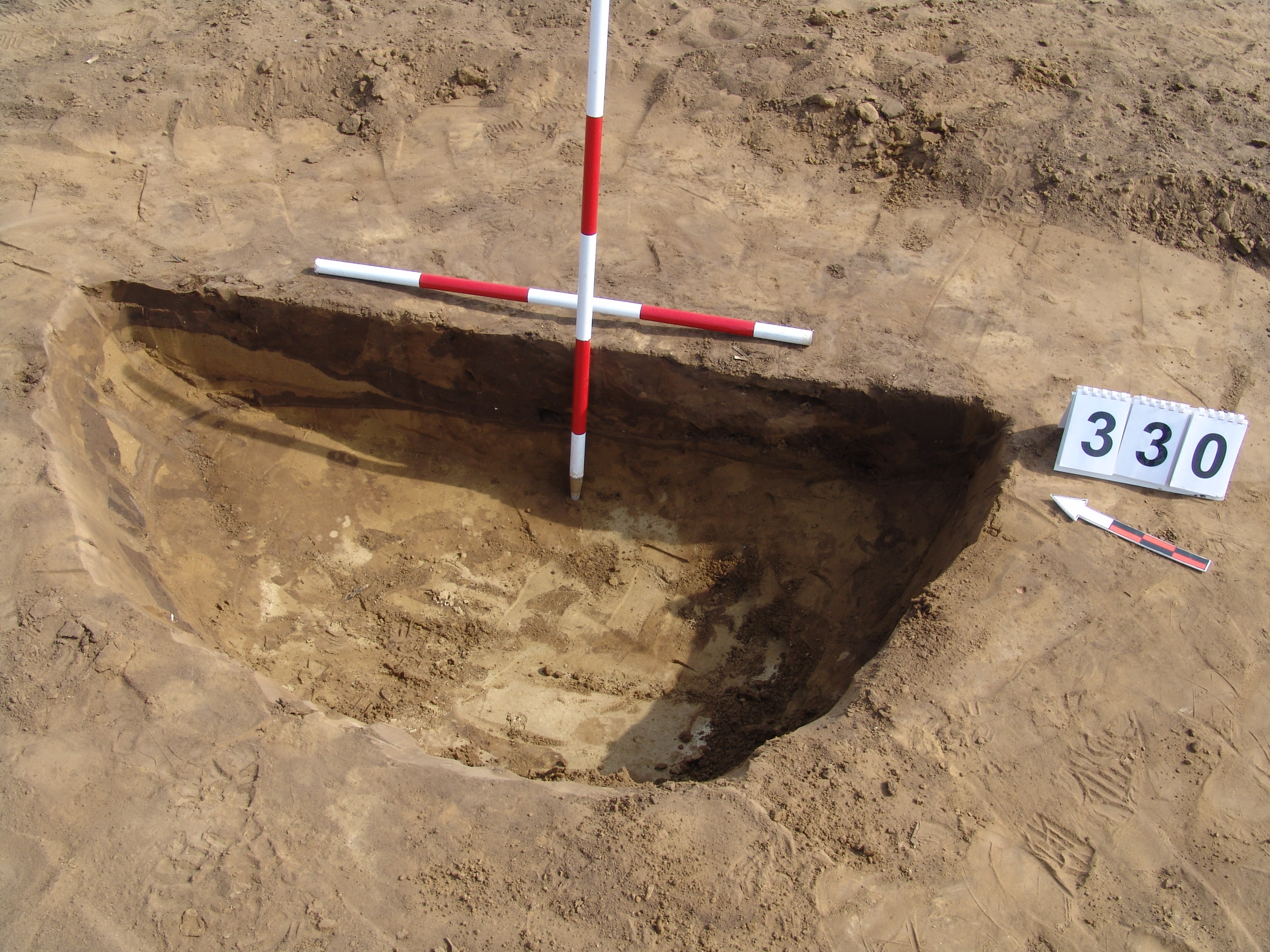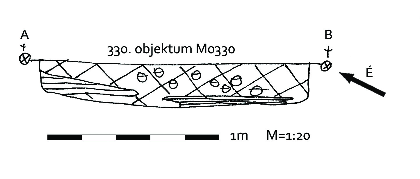 NÖK által már bontott, visszatemettek bele piros-fehér szalagot. Betöltése: iszapolódott betöltés. Feltehetőleg a metszetben a NÖK felhagyott gödrének természetes feltöltődése.