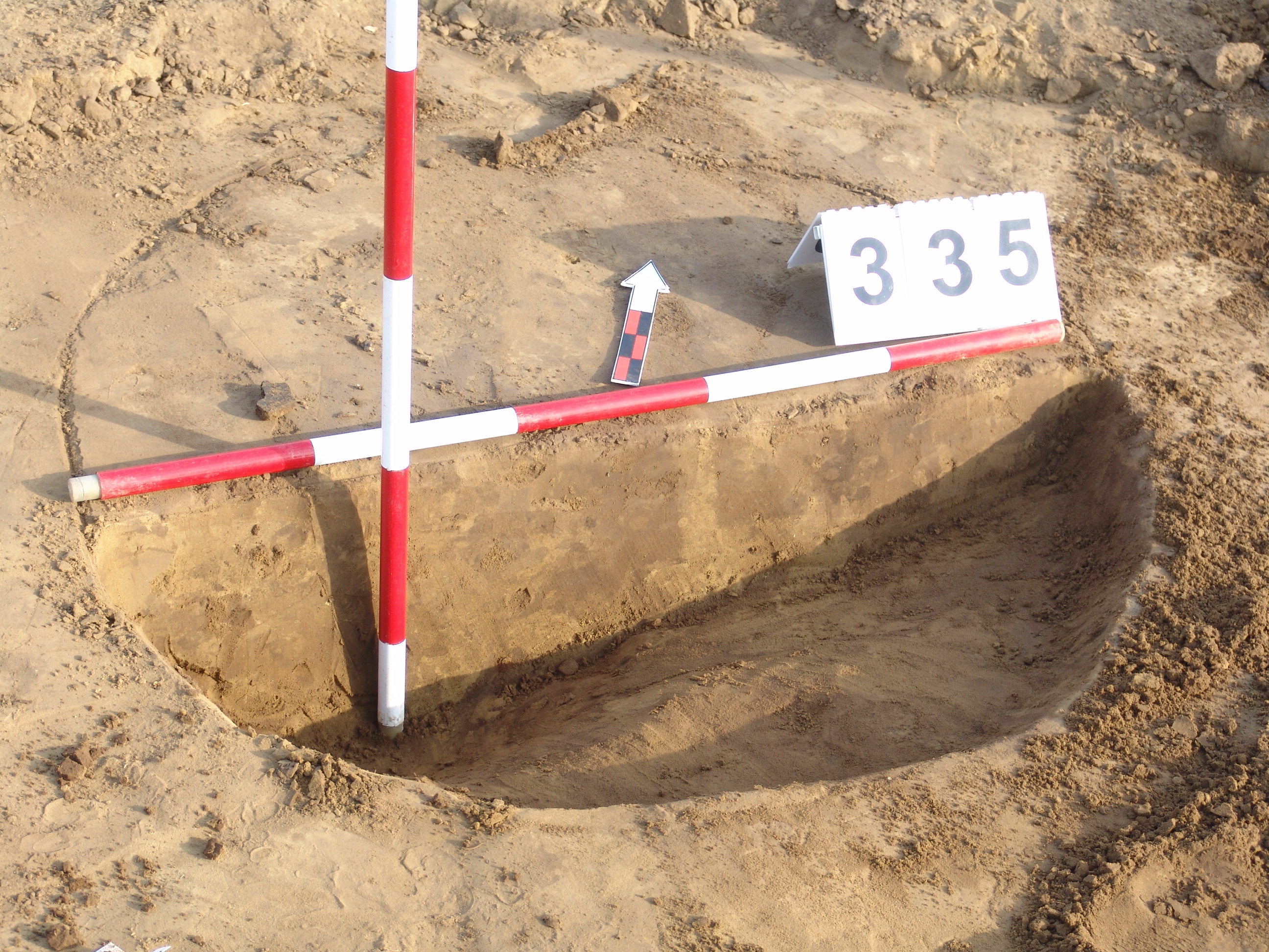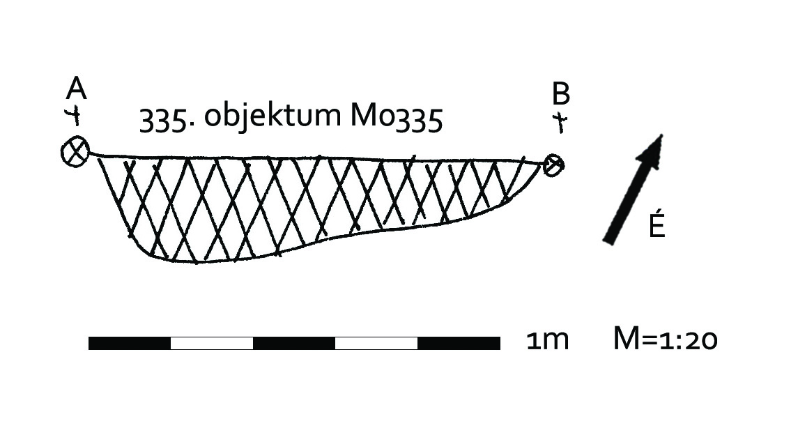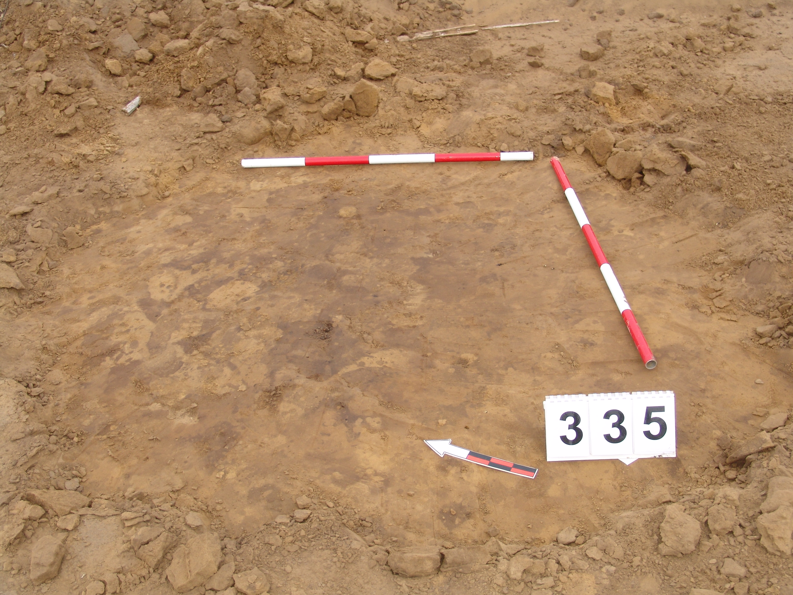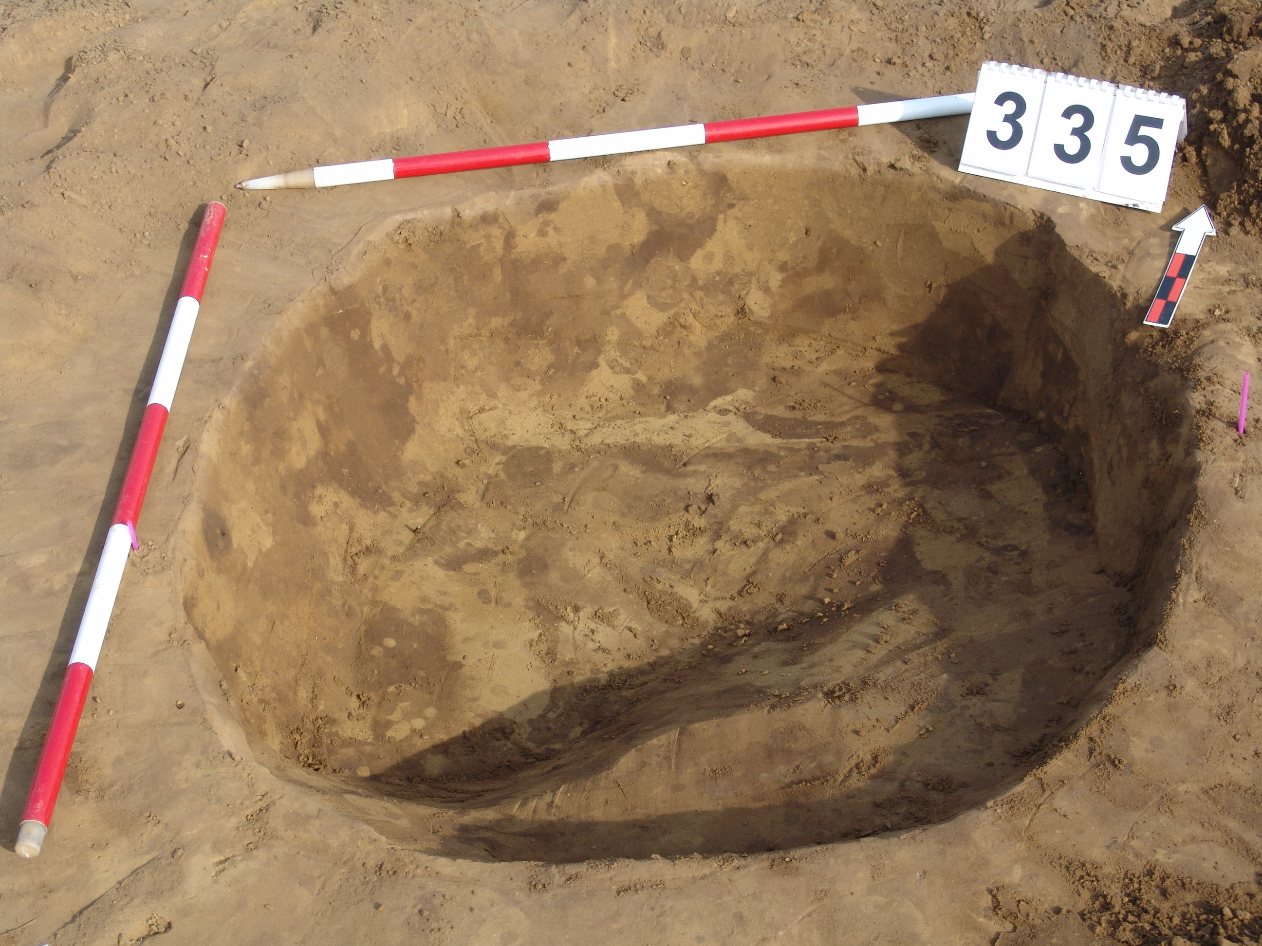 A földdepó mögötti terület É-K-i sarkán jól rajzolódó kerek folttal jelentkezett. Metszet: ívelt oldalfalak, íves alj. Ny-i fala mélyebb. Betöltés: sárgával erőteljesen kevert sötétbarna humusz. Mélység: Ny:28 cm K:12 cm