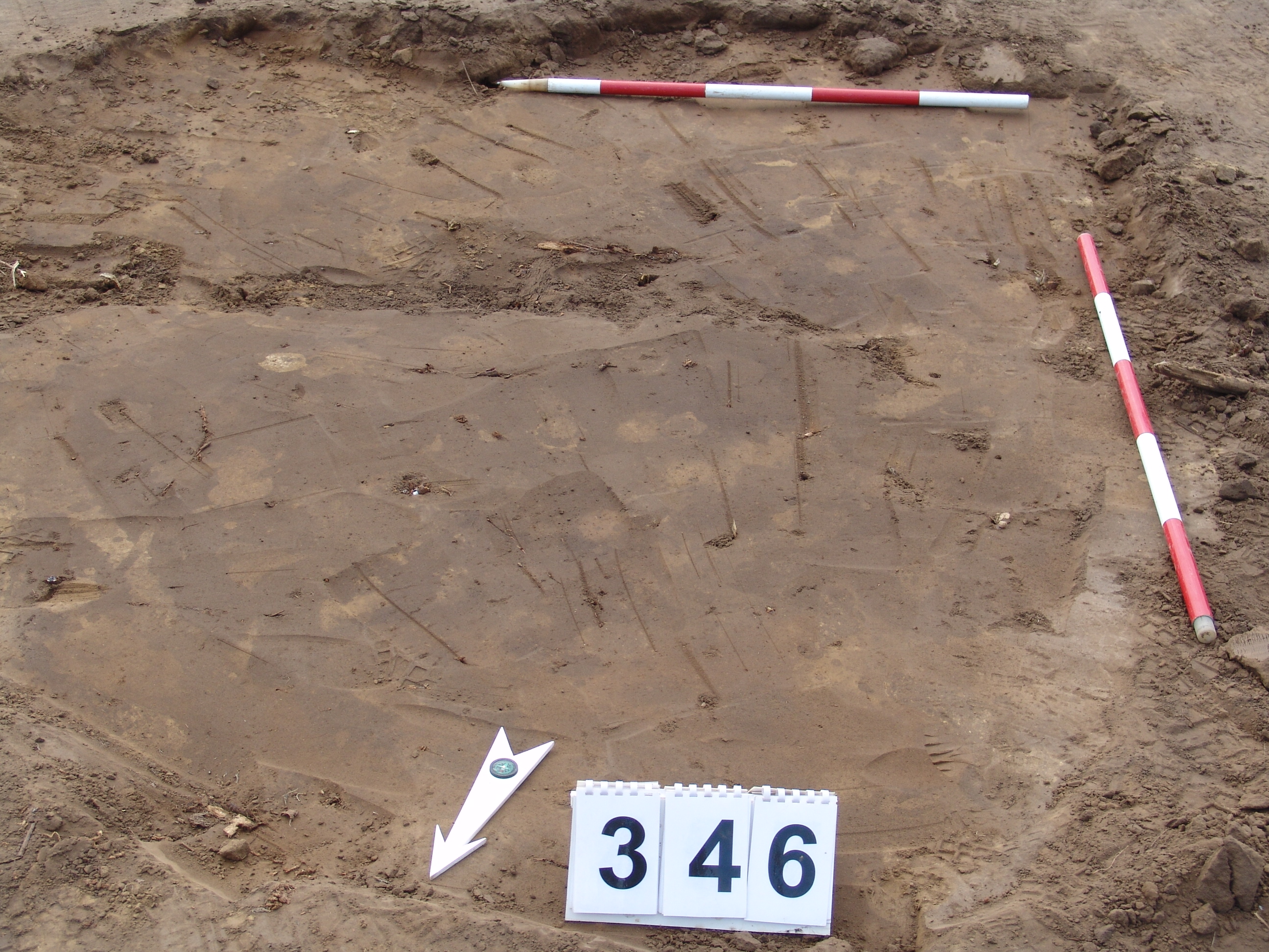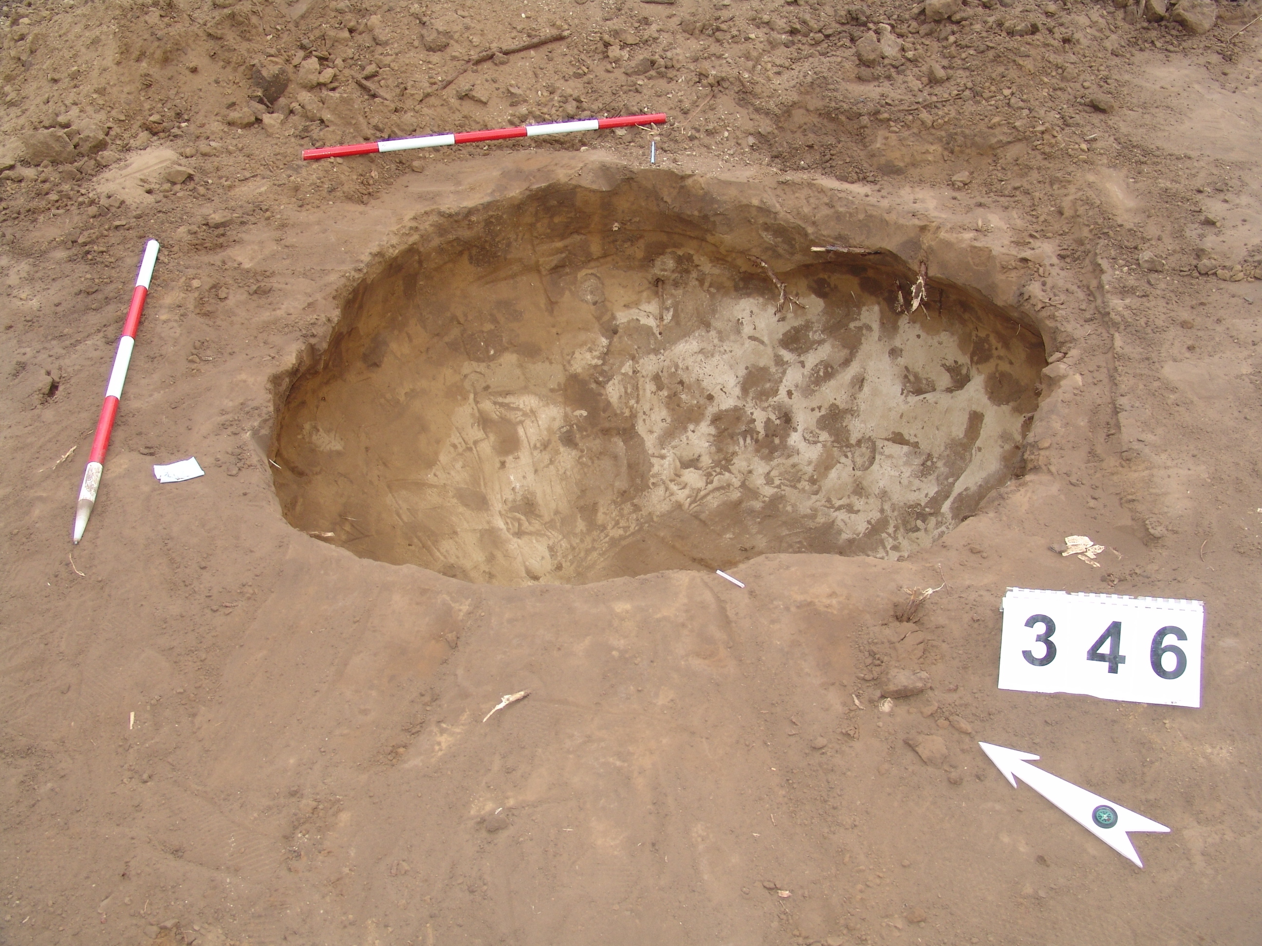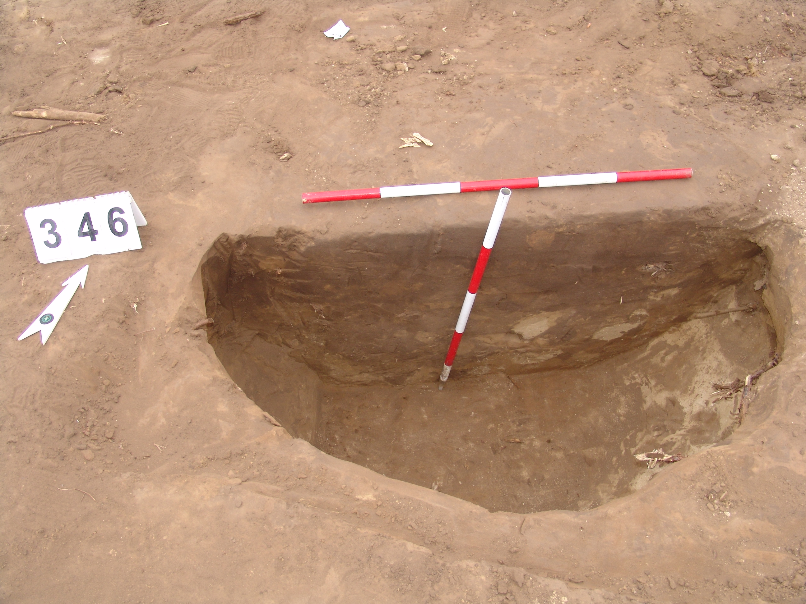 Elmosódott szélű, körhöz hasonló alakú, szürkésbarna, állatbolygatott felszínű objektum a 343. gödörtől DNy-ra 3 m-re.
