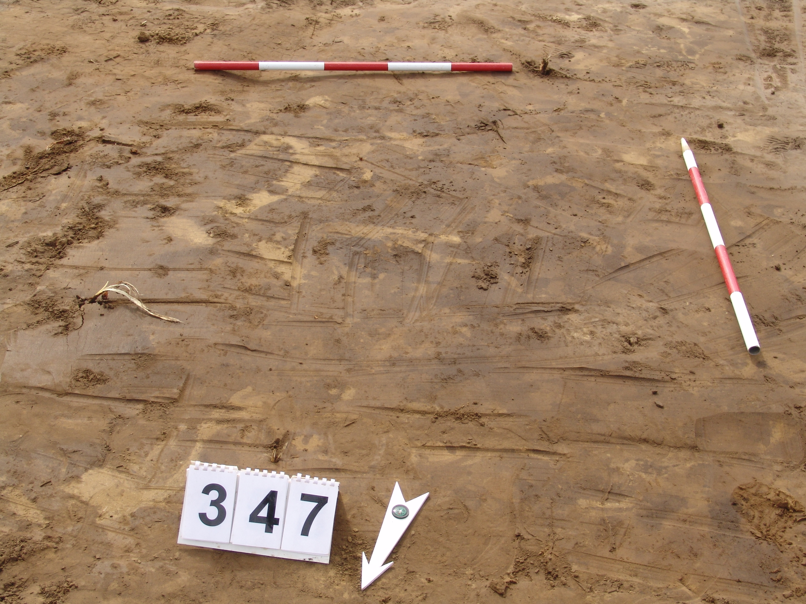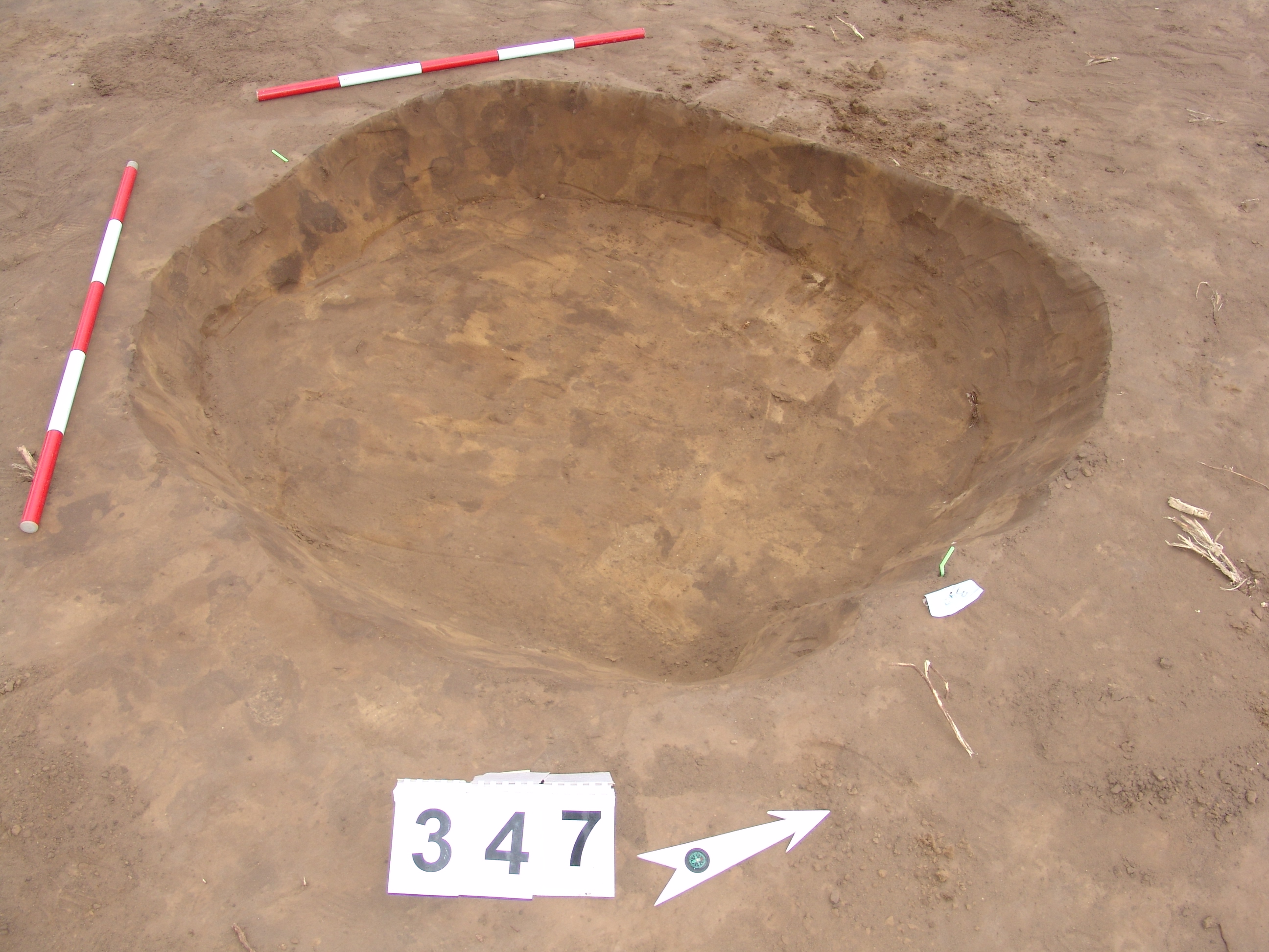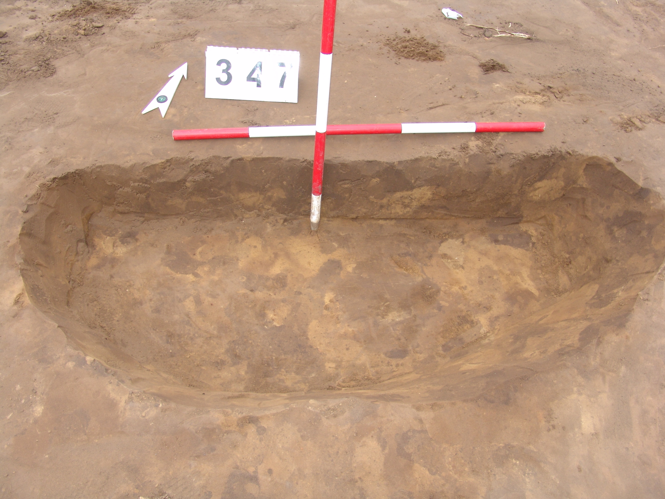 Elmosódott szélű, nagyjából kör alakú, szürkésbarna, barna foltos, állatbolygatott felszínű objektum a 343. gödörtől ÉNy-ra 6 m-re.