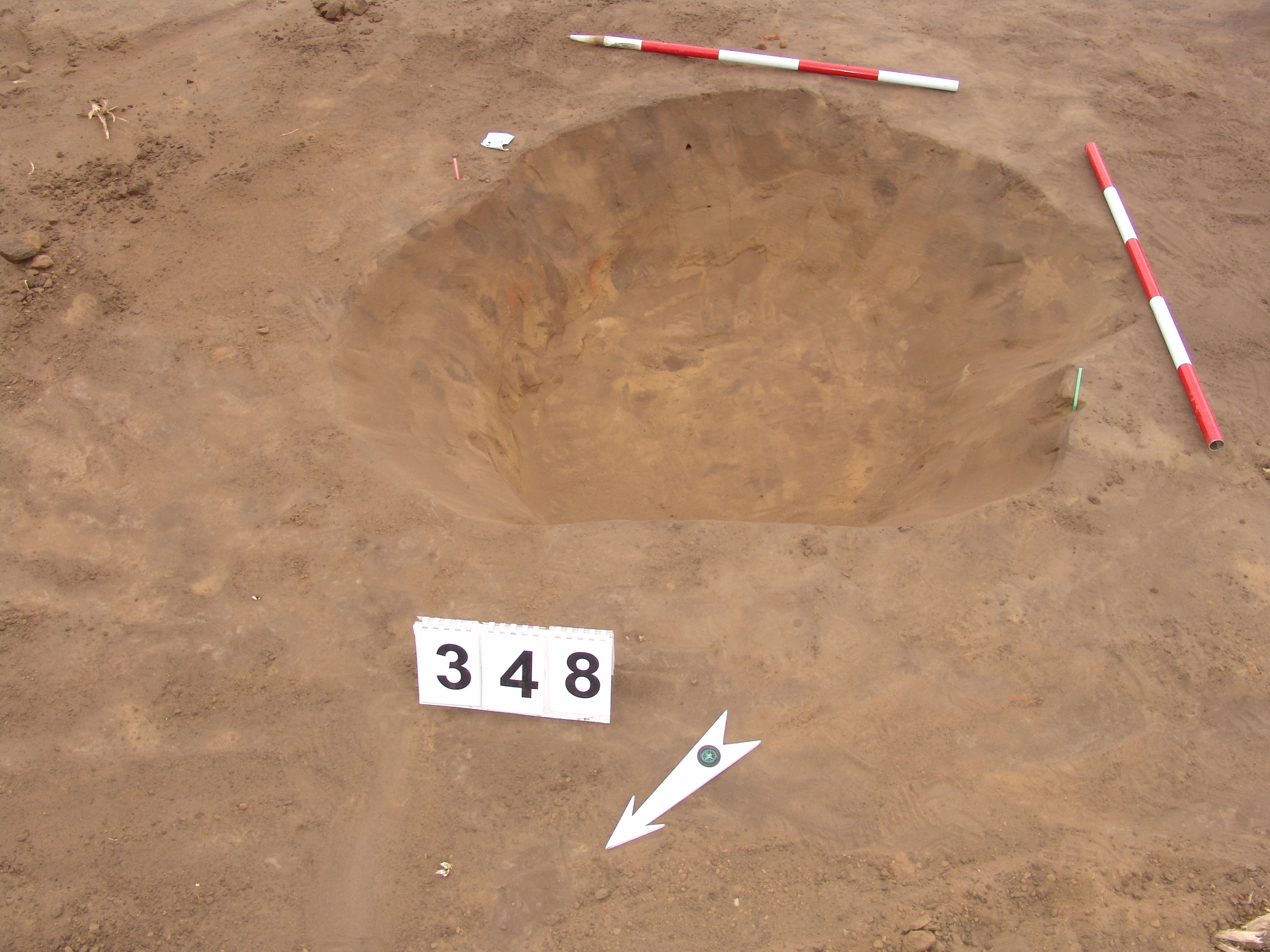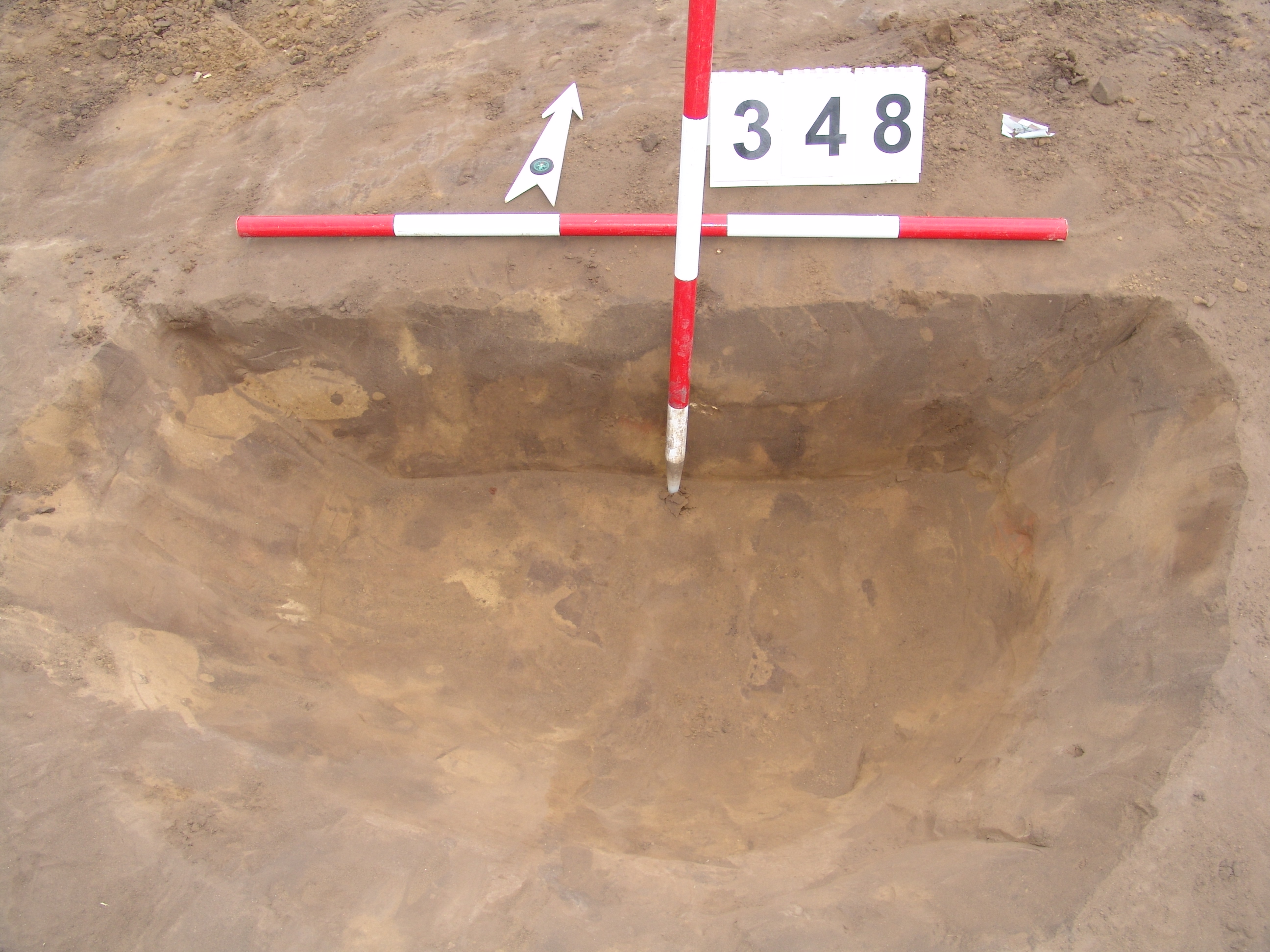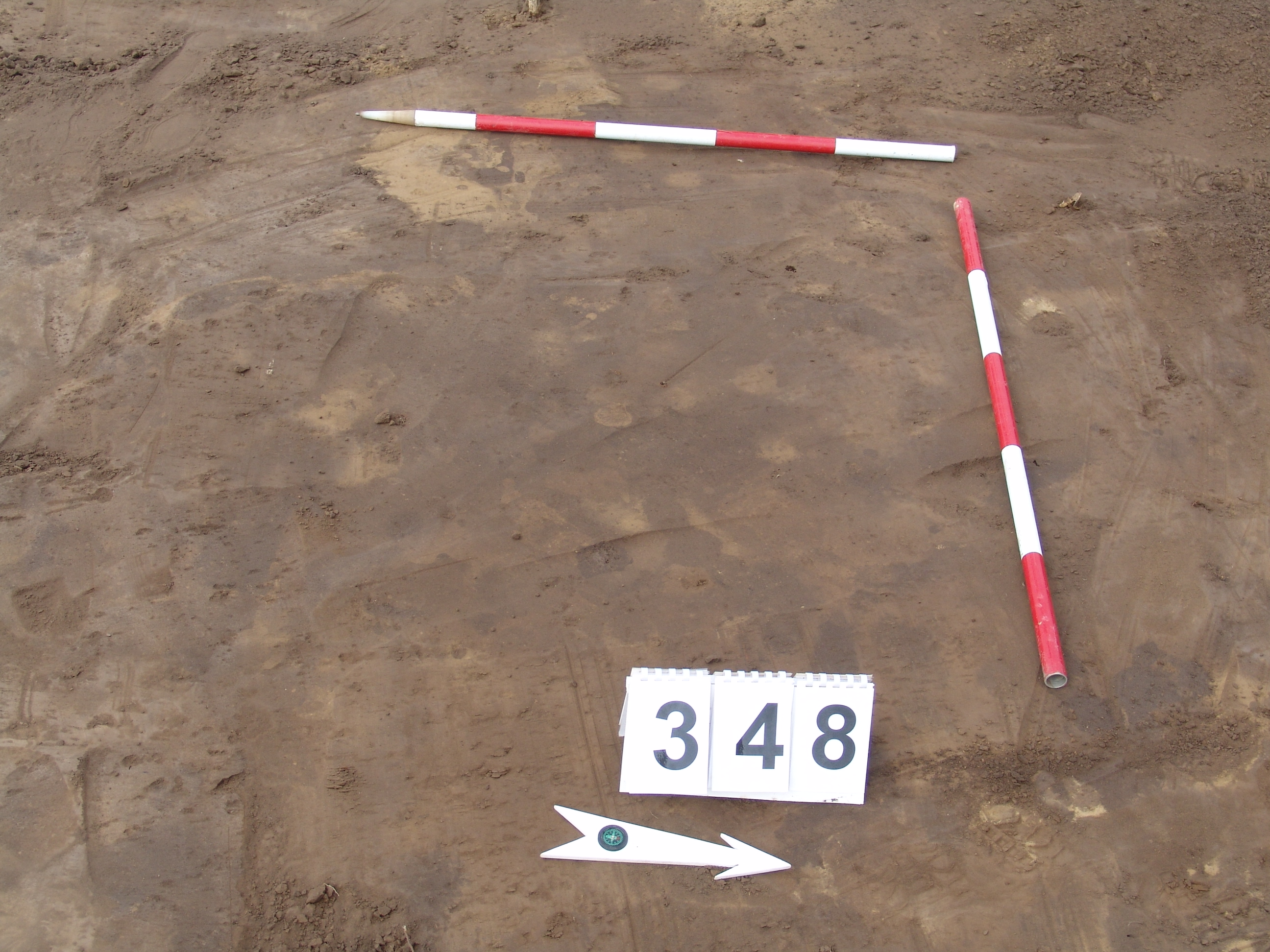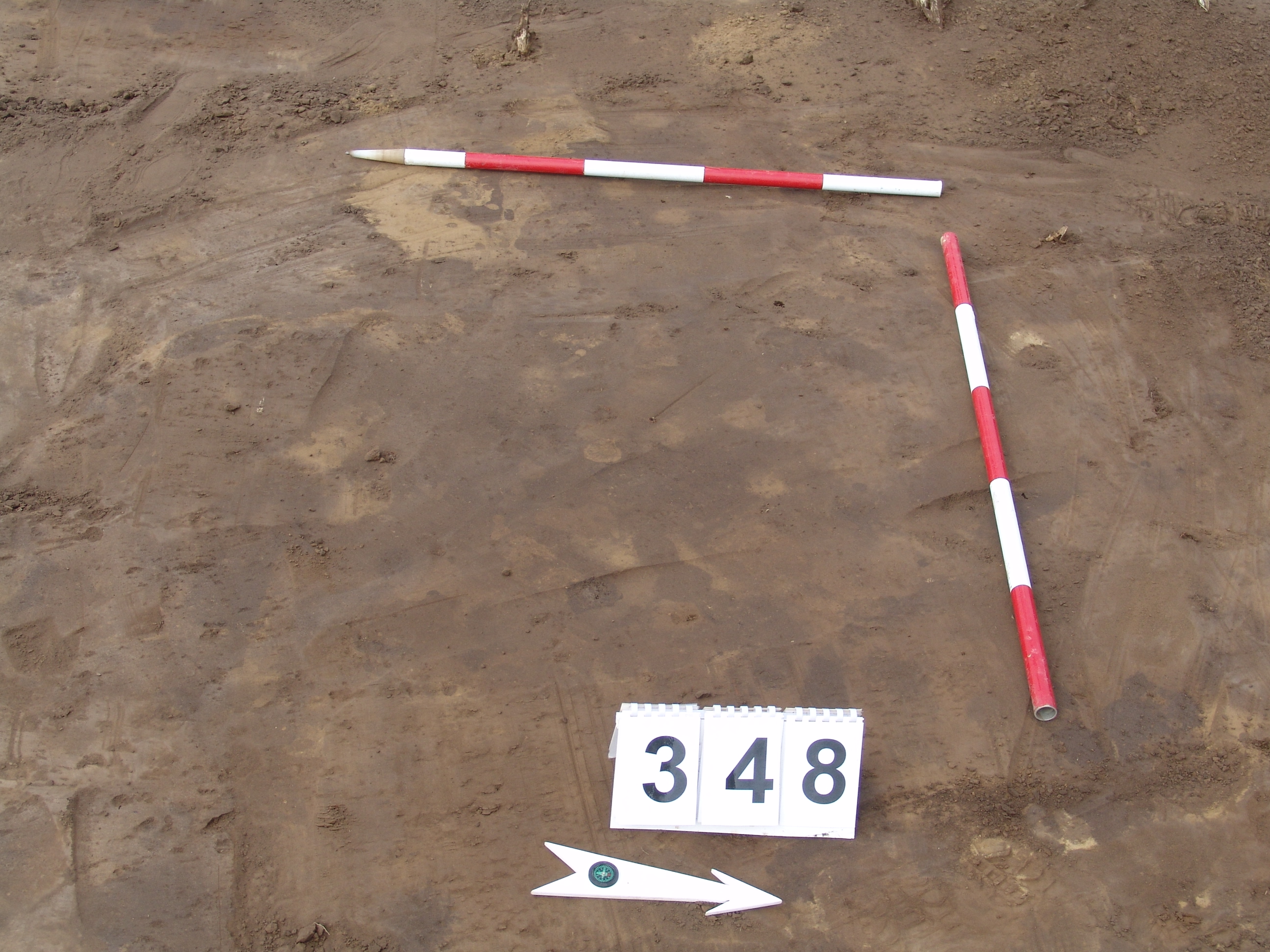 Elmosódott szélű, kisméretű, kör alakú, barna, szürke szemcsés felszínű objektum a 347. gödörtől É-ra, 2,5 m-re.