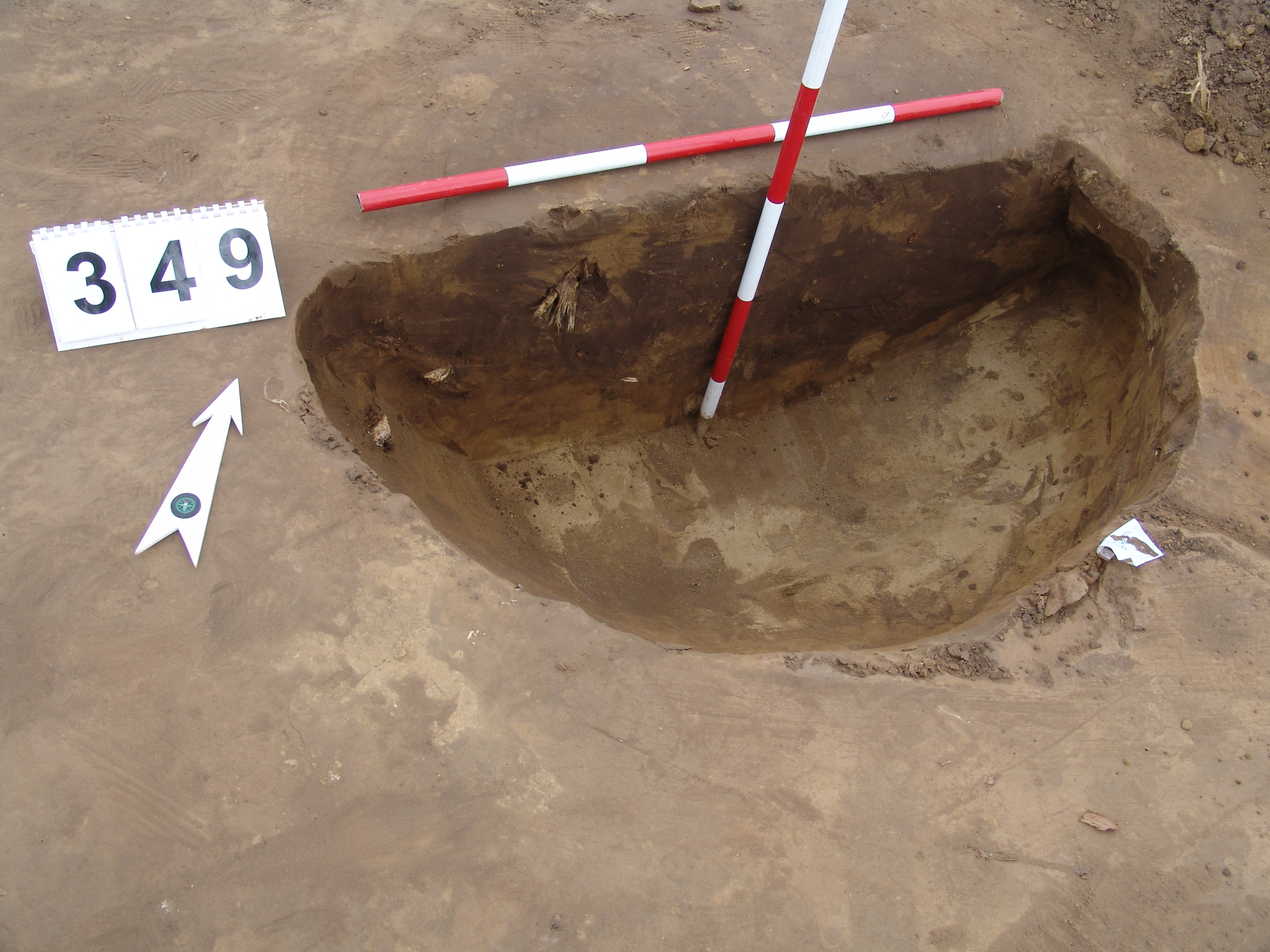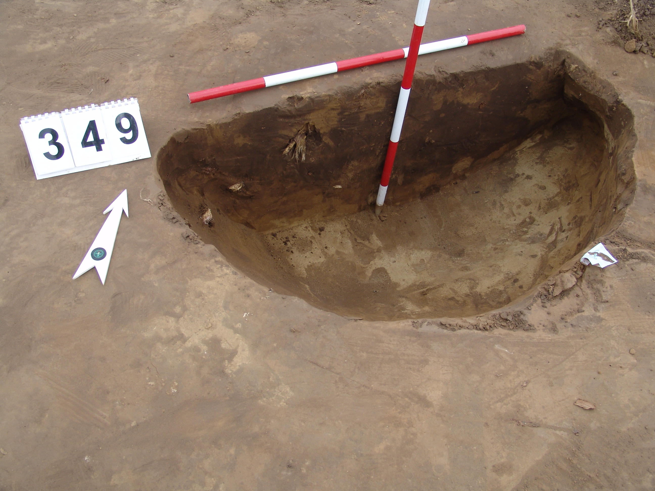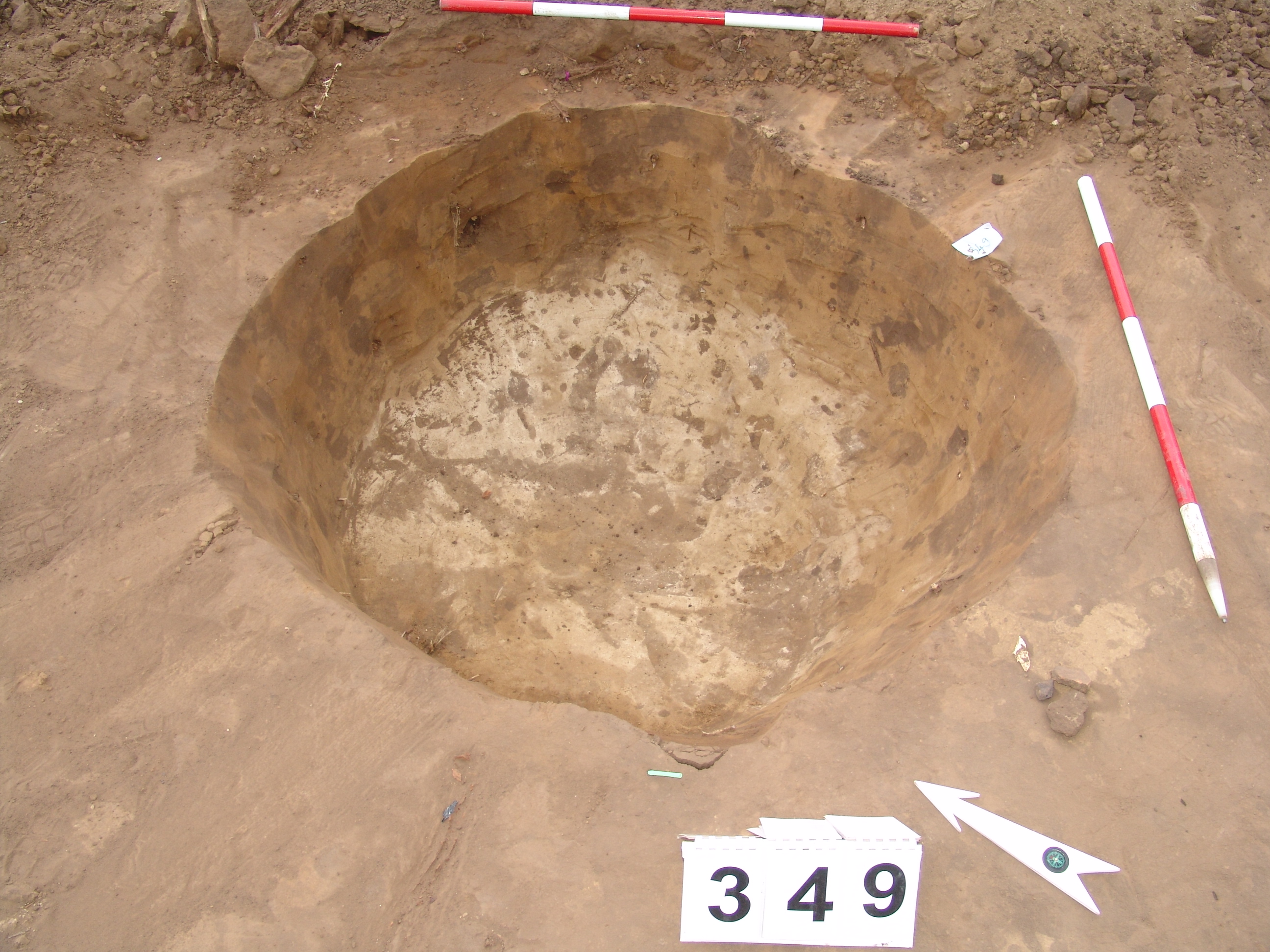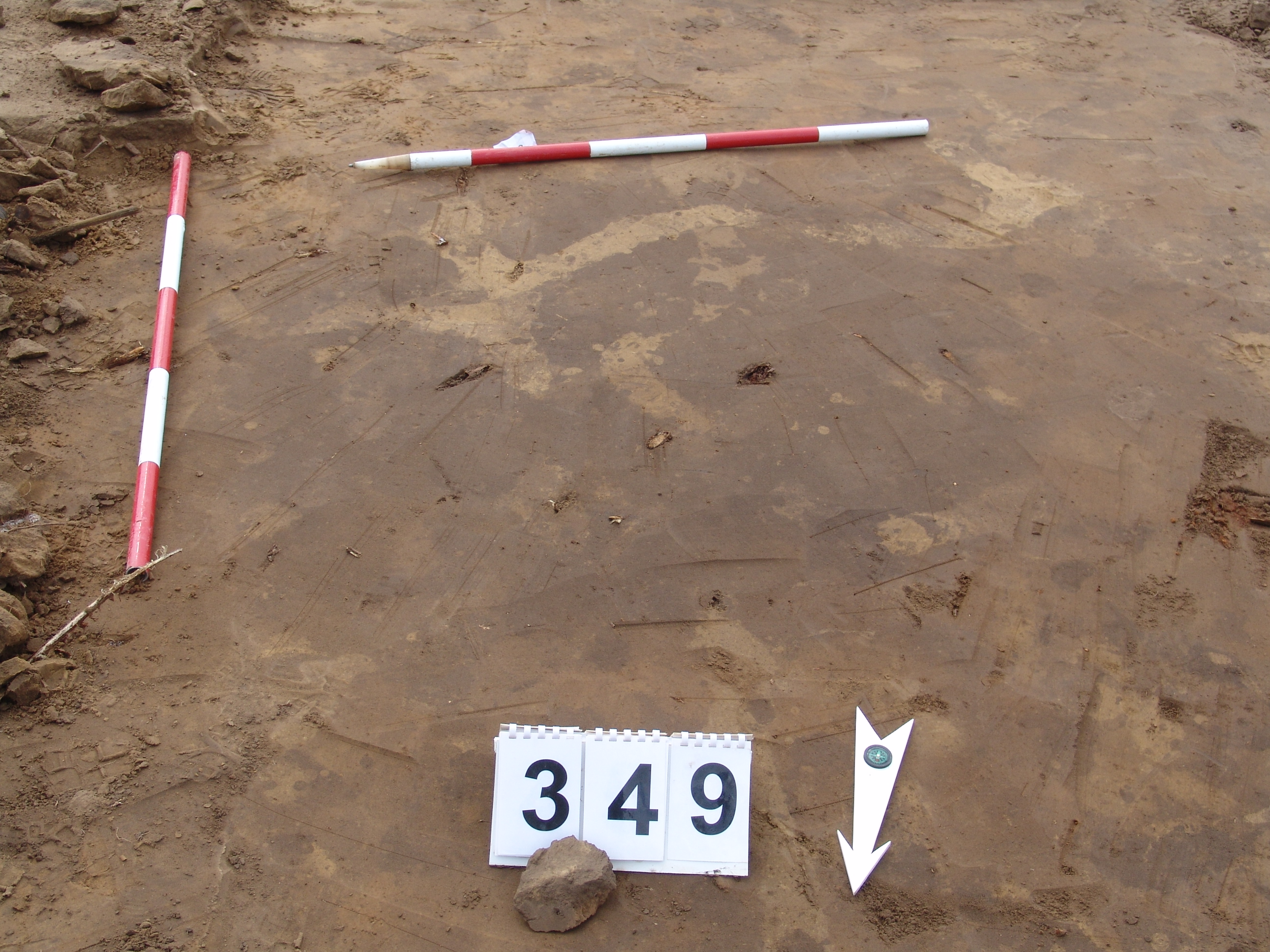 Elmosódott szélű, nagyjából kör alakú, sárga-szürke-barna kevert felszínű objektum a 346. gödörtől D-re 1 m-re.