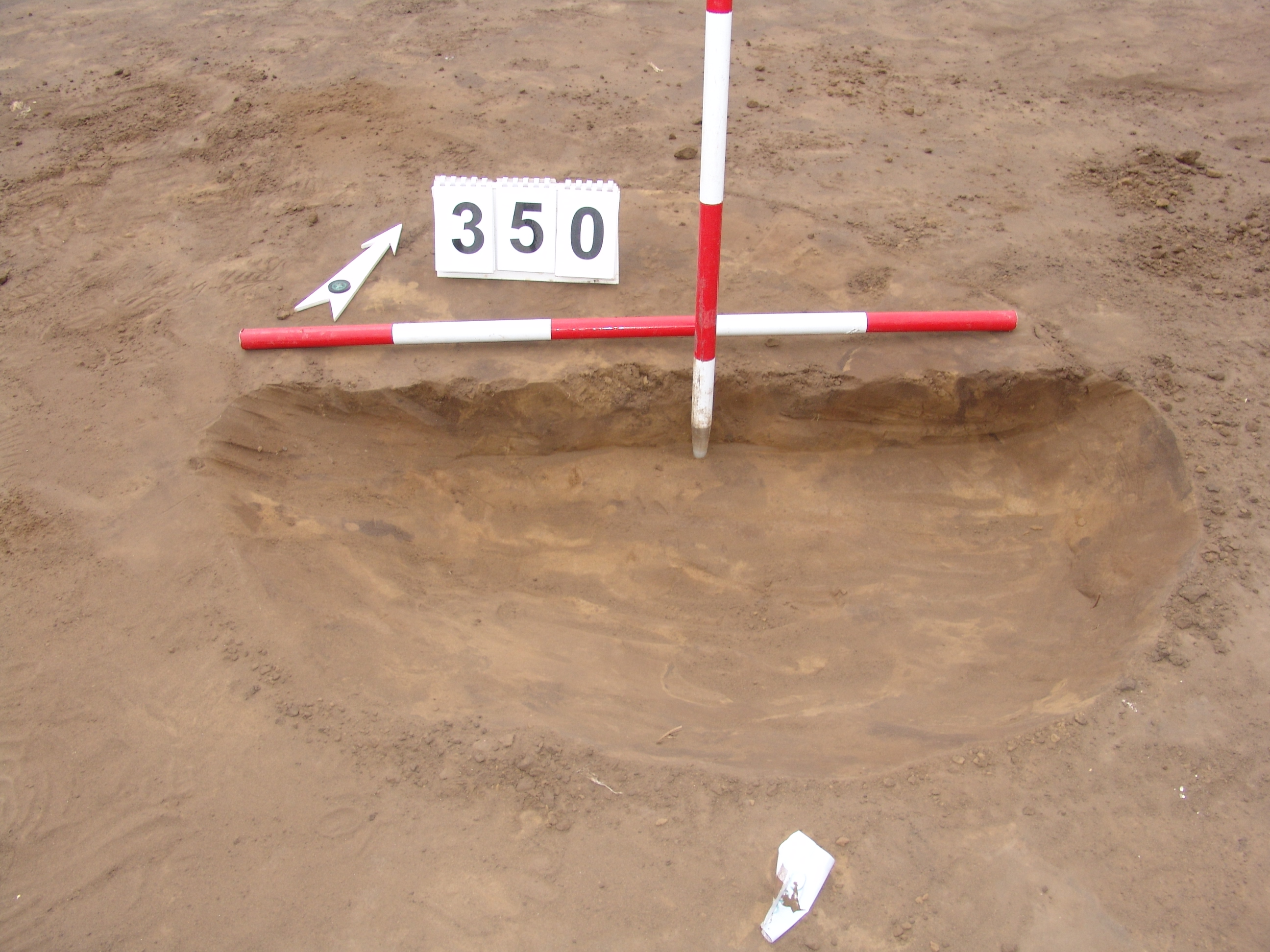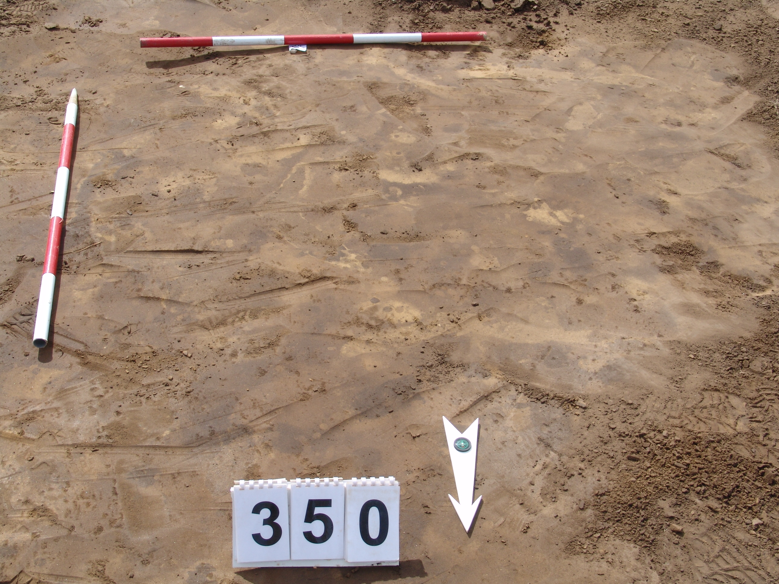 Elmosódott szélű, nagyjából kör alakú, sárga-szürke-barna kevert felszínű objektum a 347. gödörtől Ny-ra 1 m-re. TERMÉSZETES JELENSÉG.