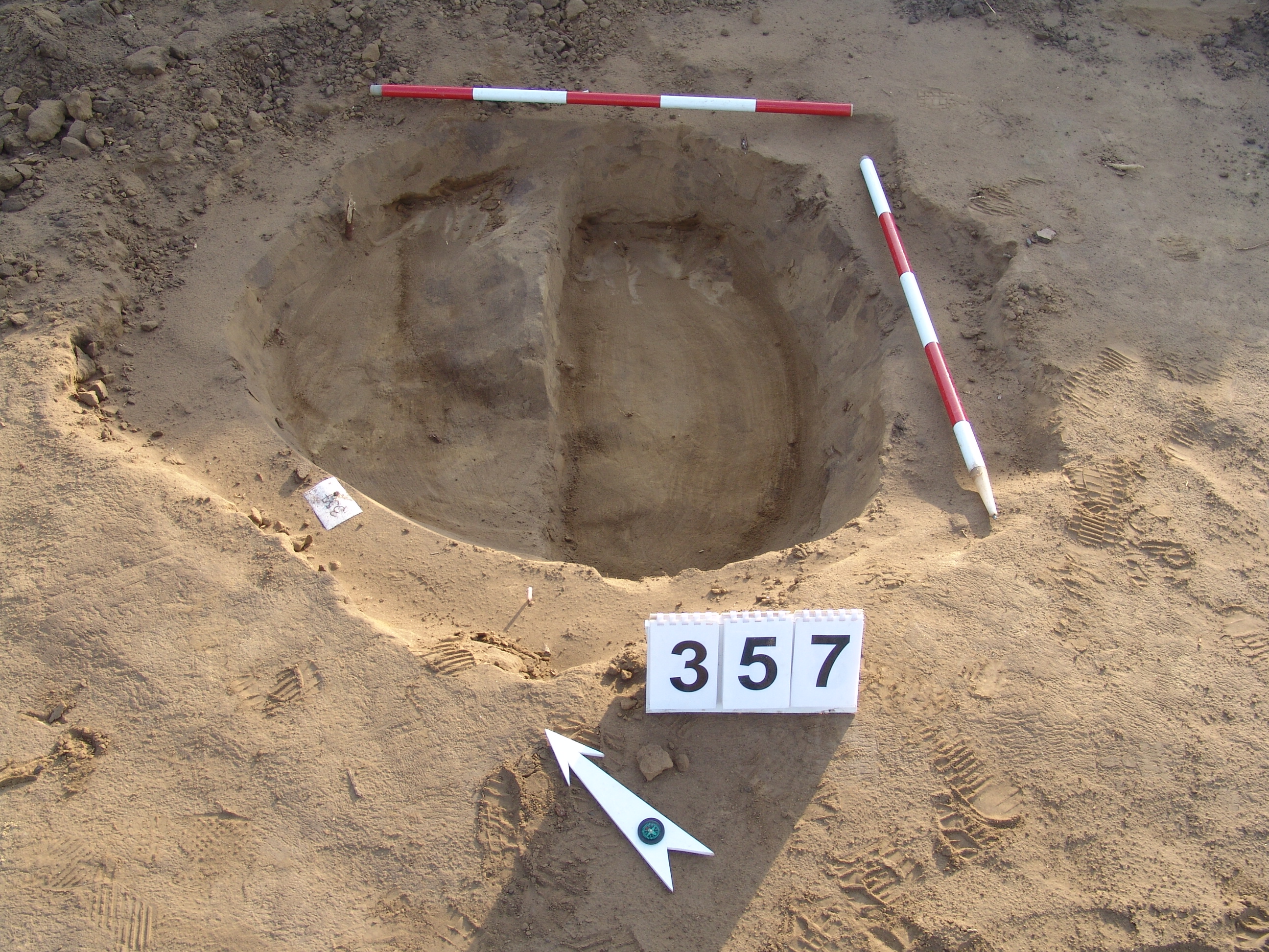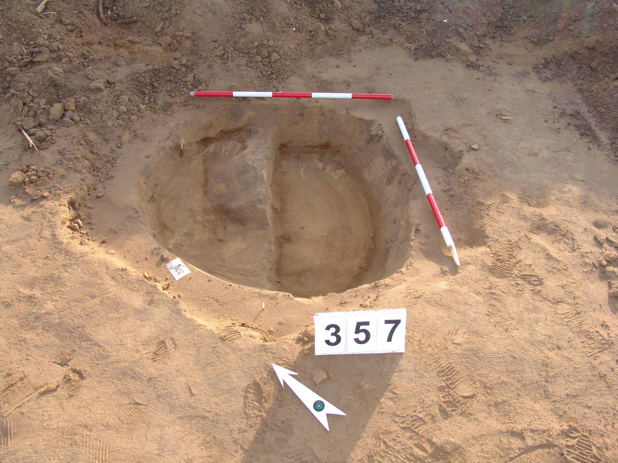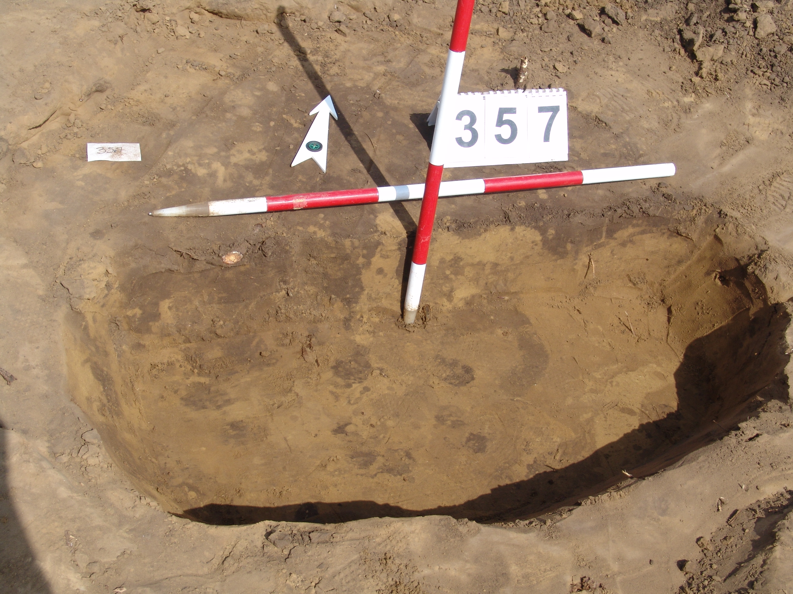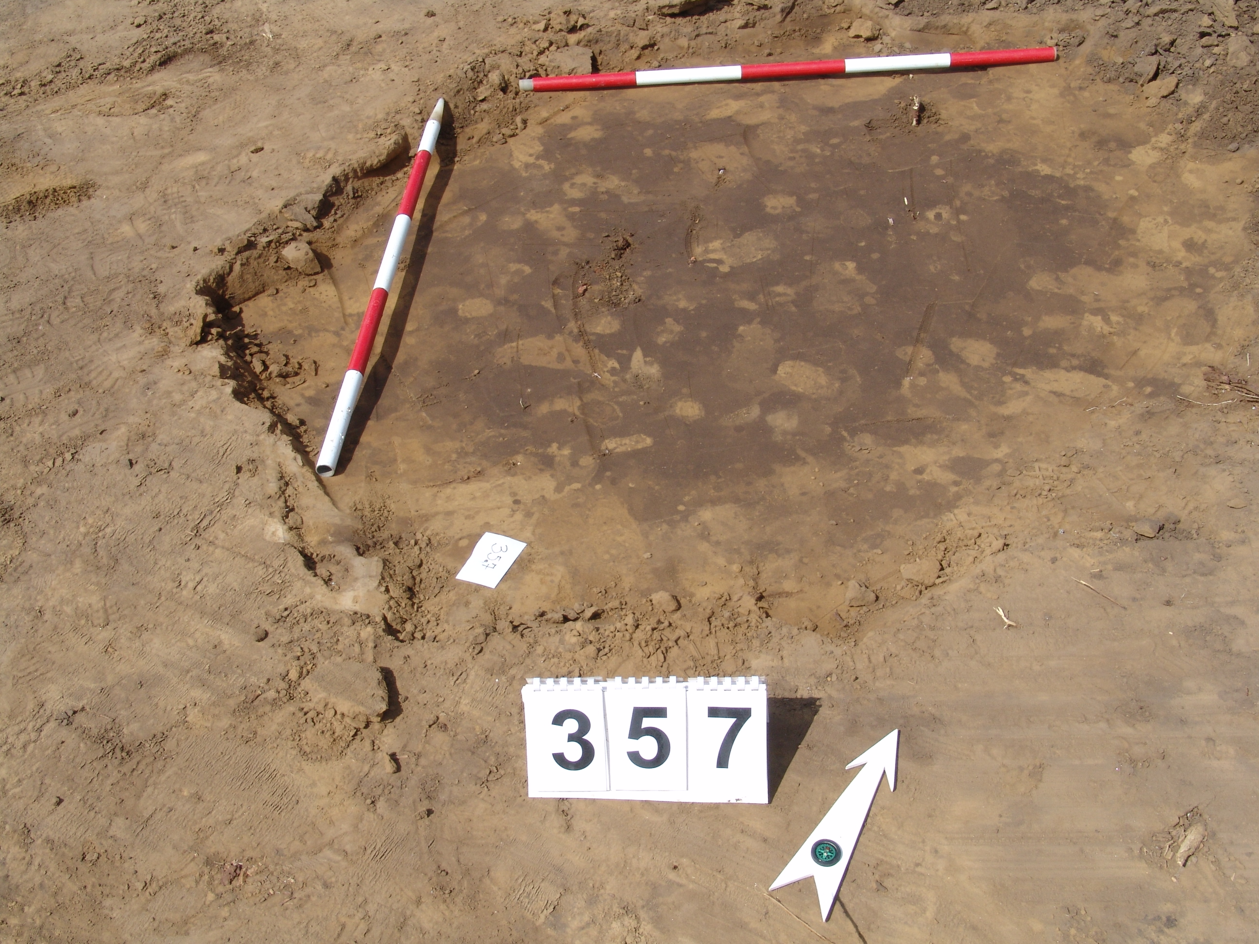 Elmosódott szélű, kör alakú, szürkésbarna, barna foltos, állatbolygatott felszínű objektum a keleti szelvényfal mellett, a 352. gödörtől délre 1,5 m-re.