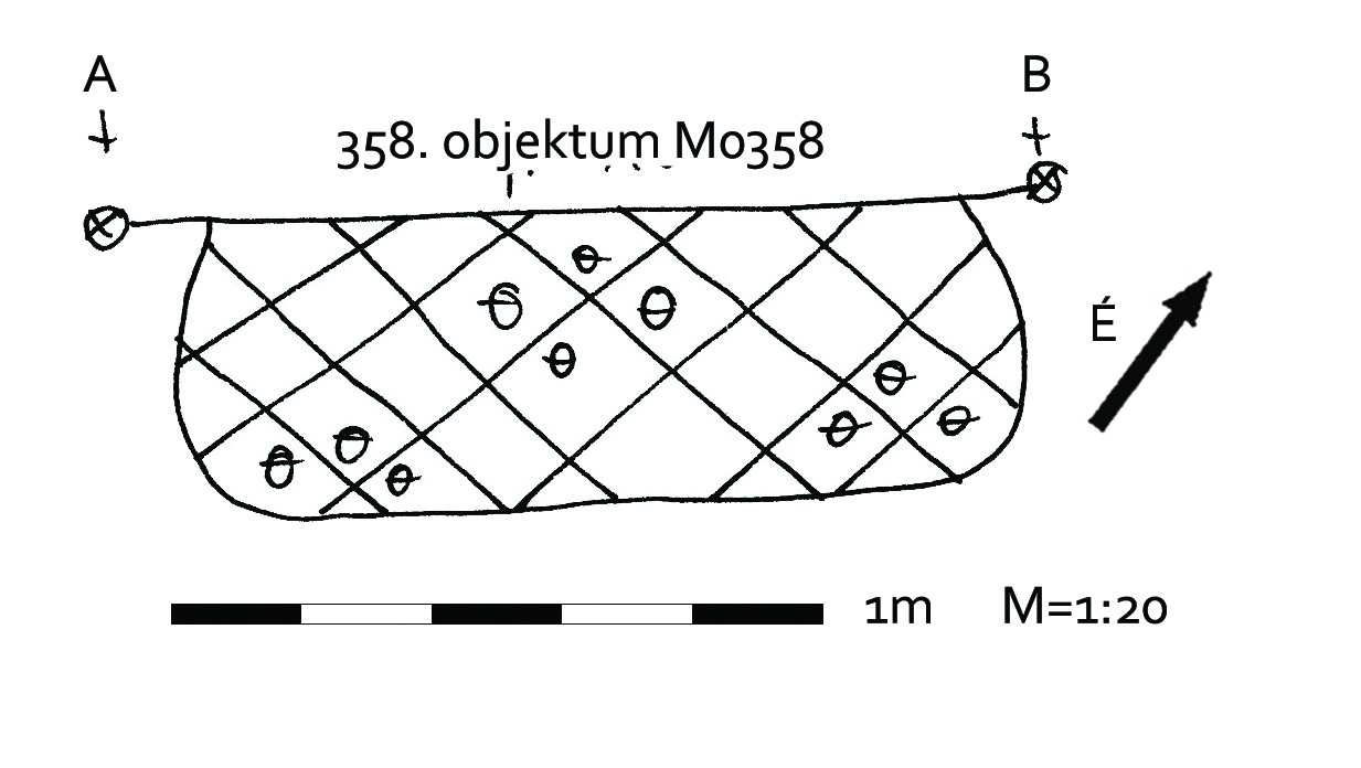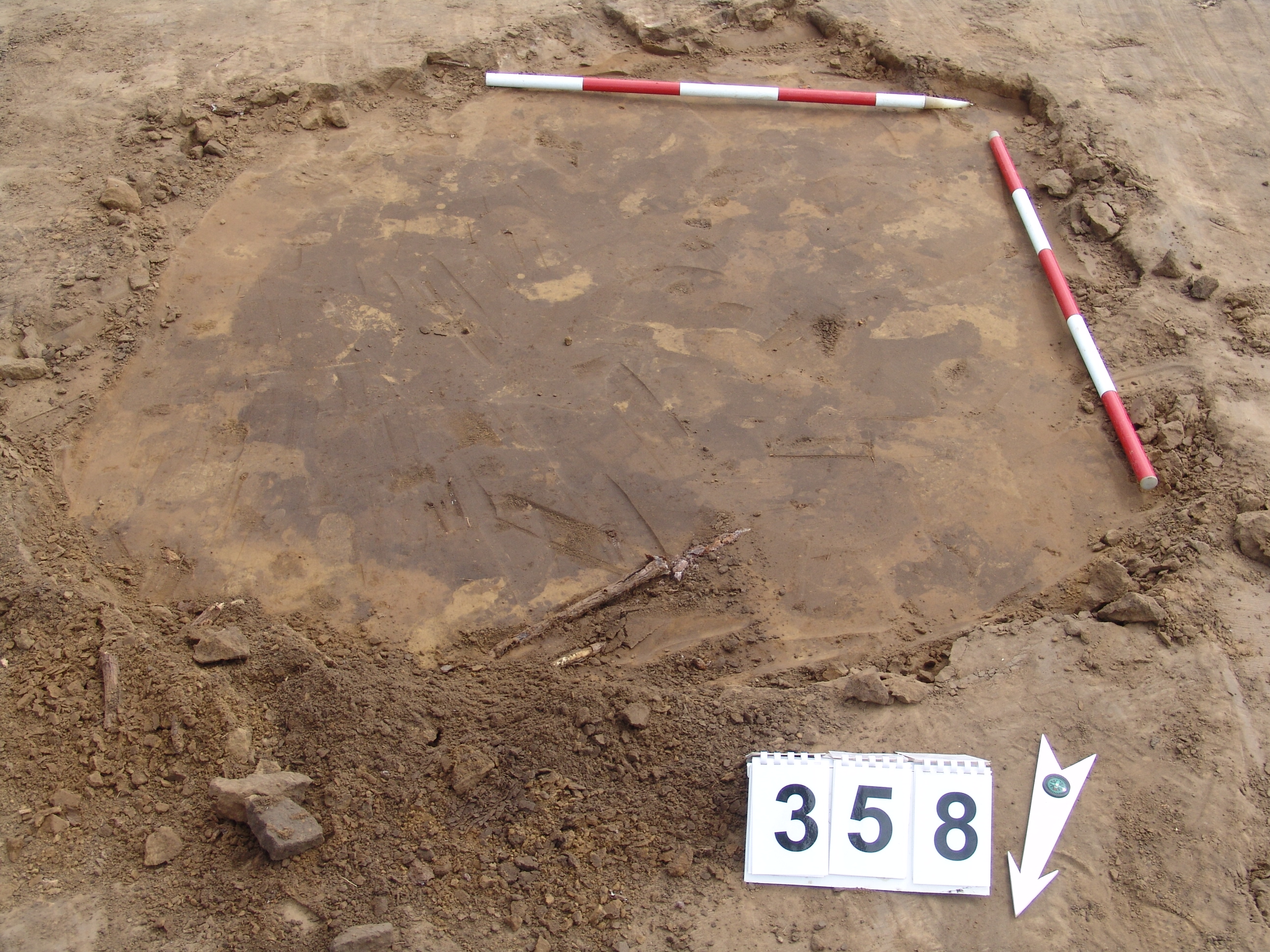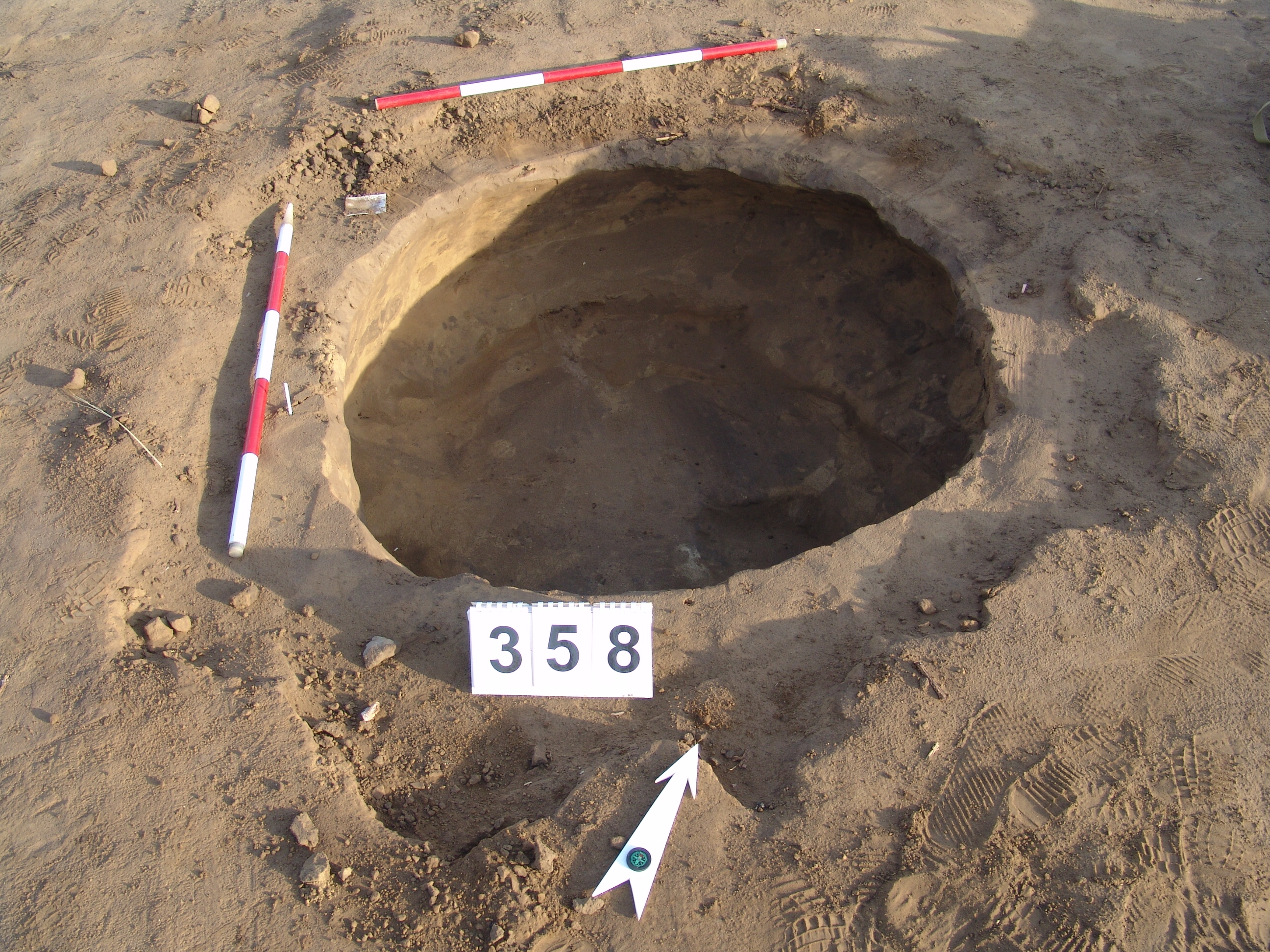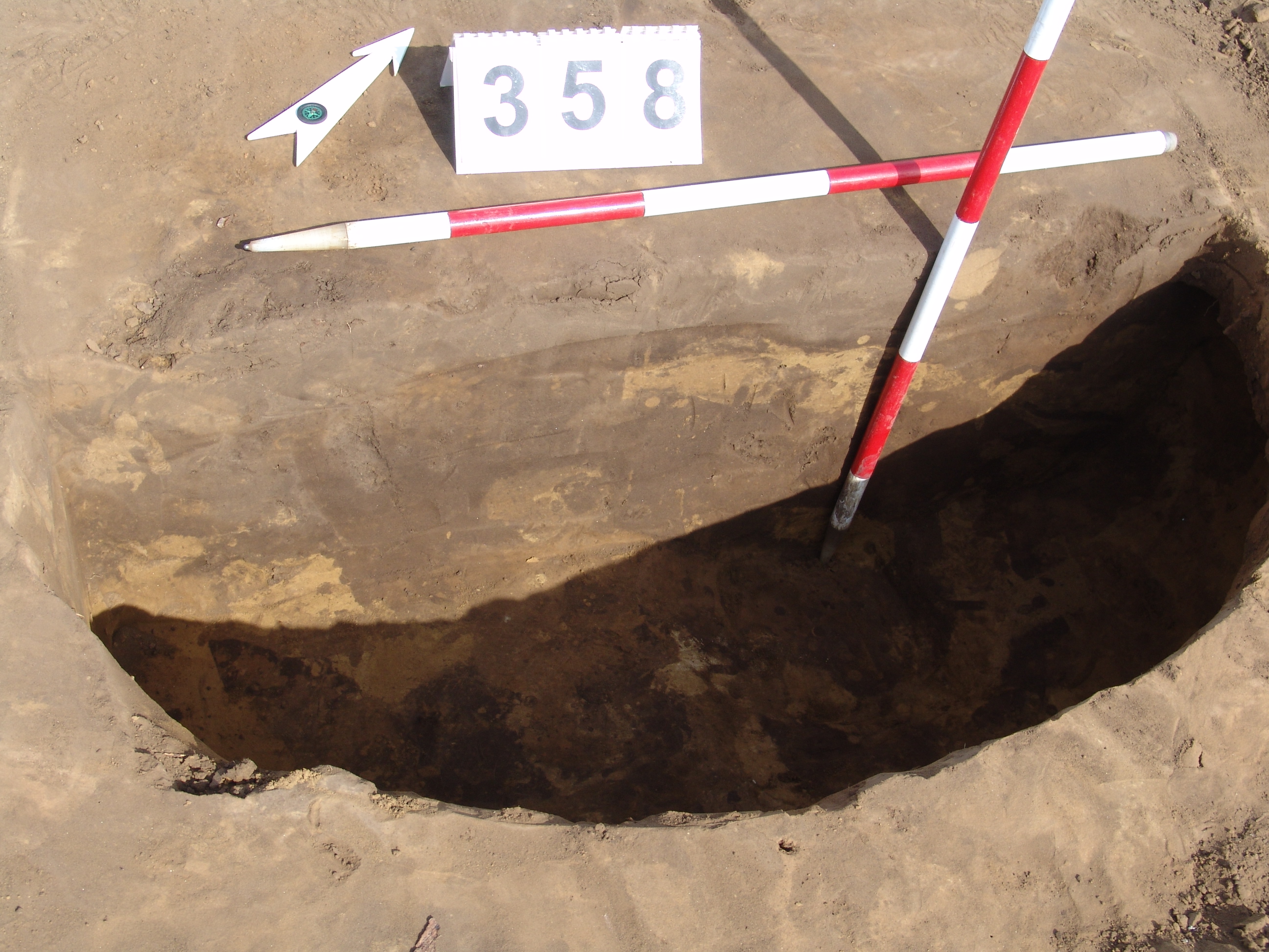 Elmosódott szélű, kör alakú, szürkésbarna, barna foltos, állatbolygatott felszínű objektum a 357. gödörtől ÉNy-ra 2 m-re.