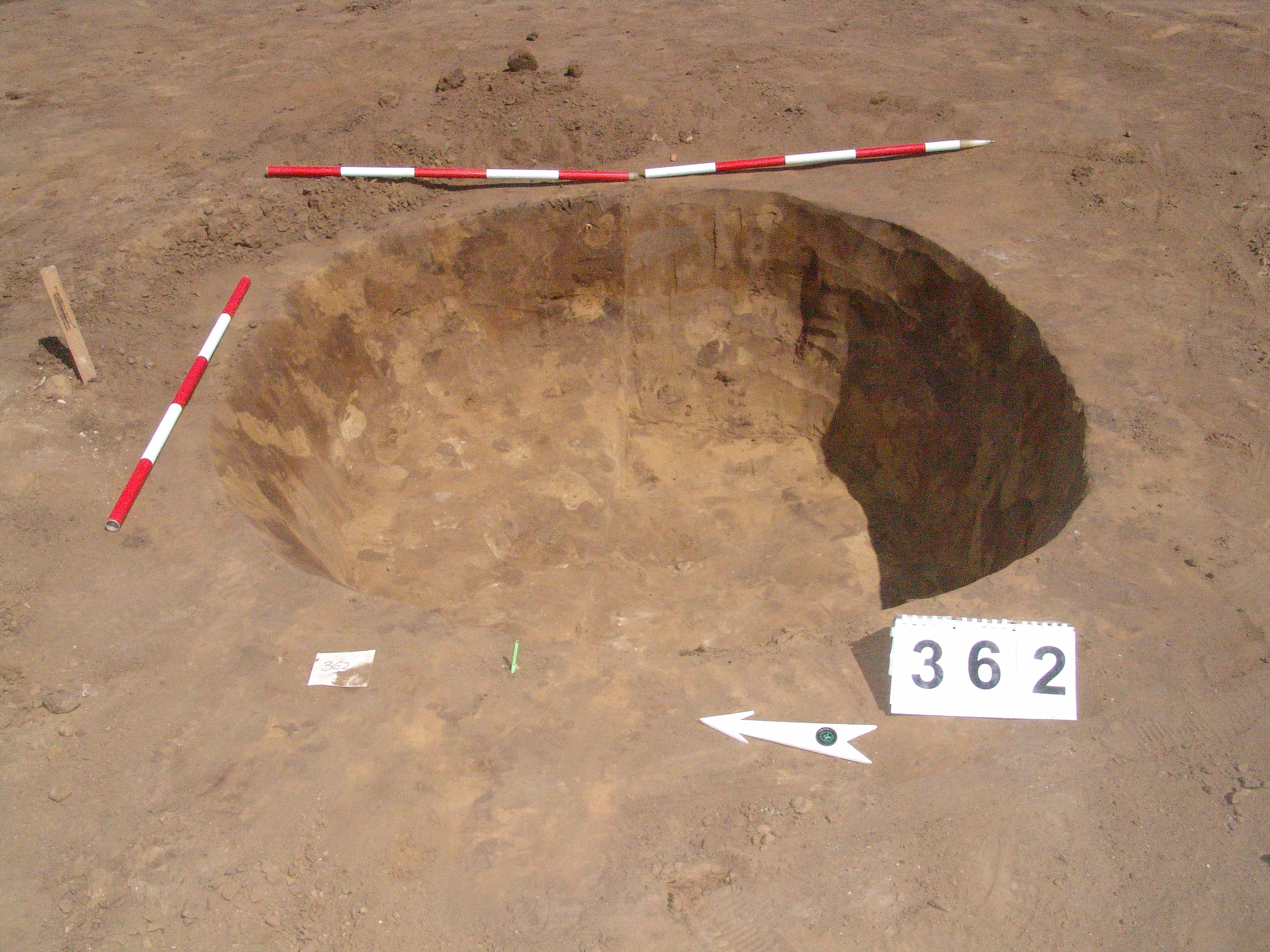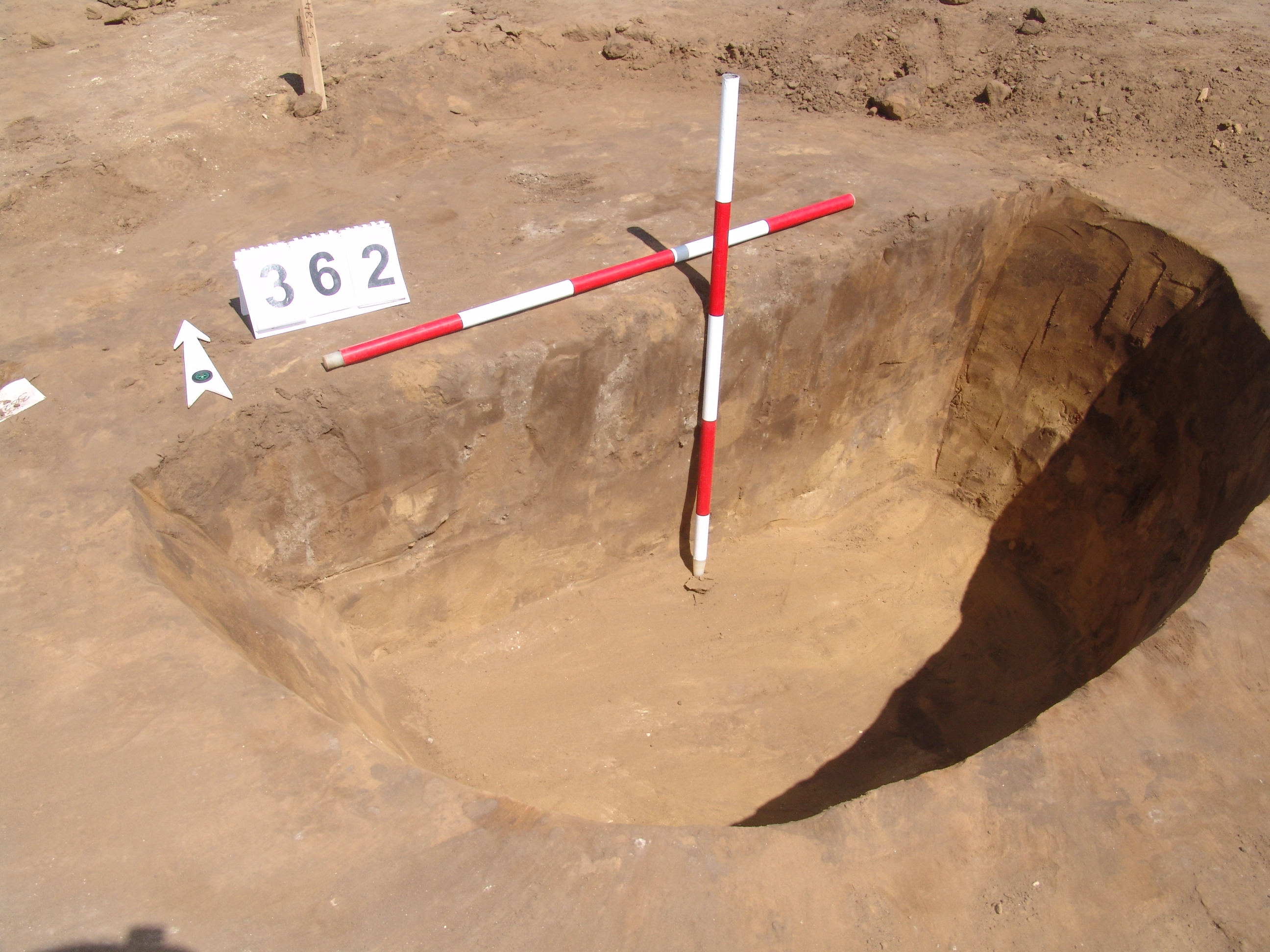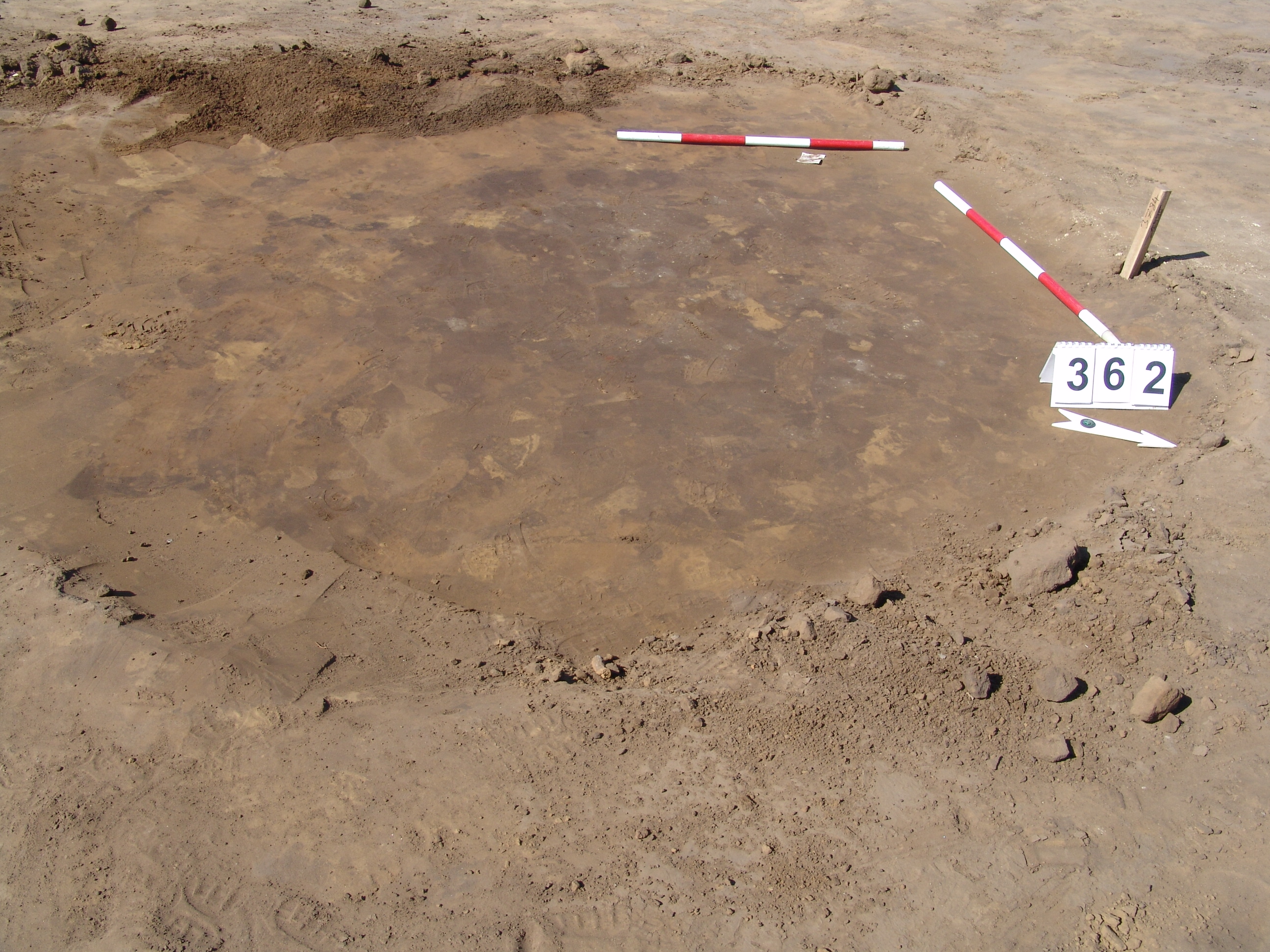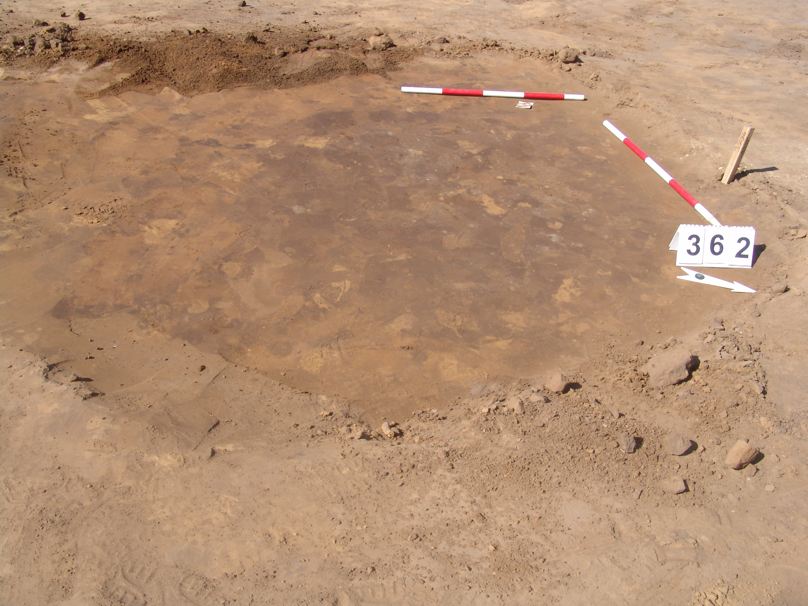 Elmosódott szélű, nagyjából kör alakú, szürkésbarna , barna foltos, világosszürke tapasztásszemcsés felszínű objektum a 361. gödörtől DNy-ra 2 méterre.