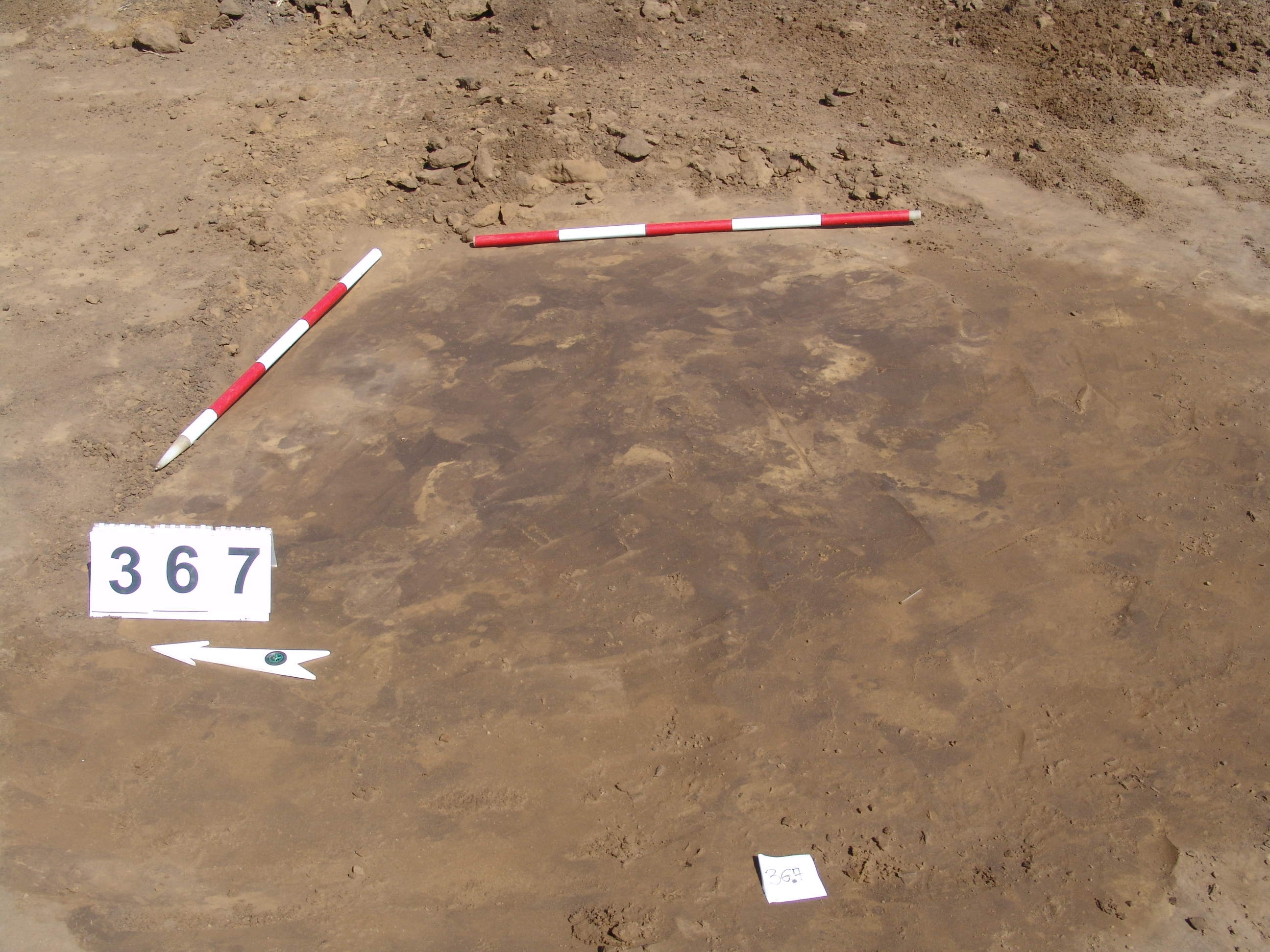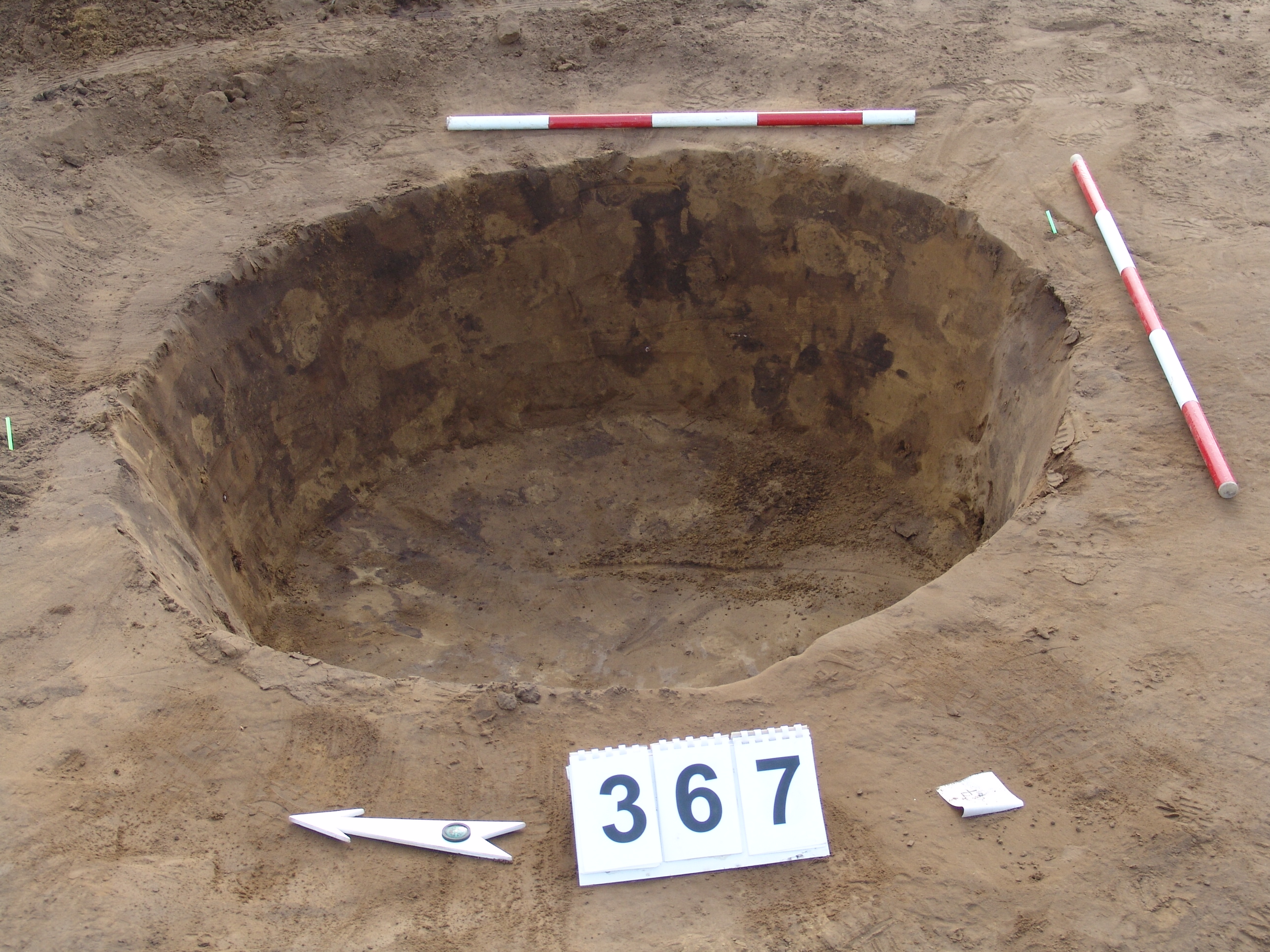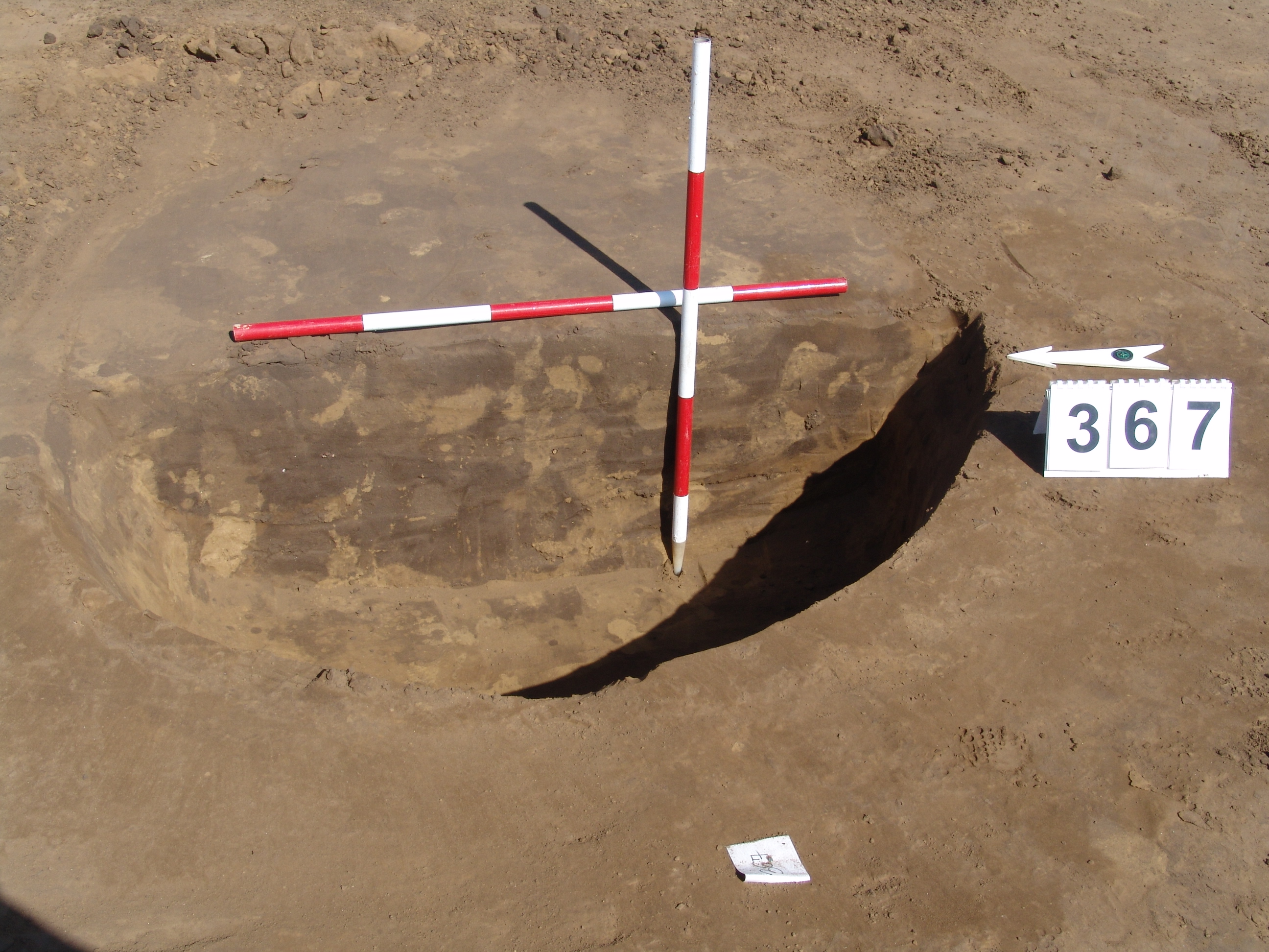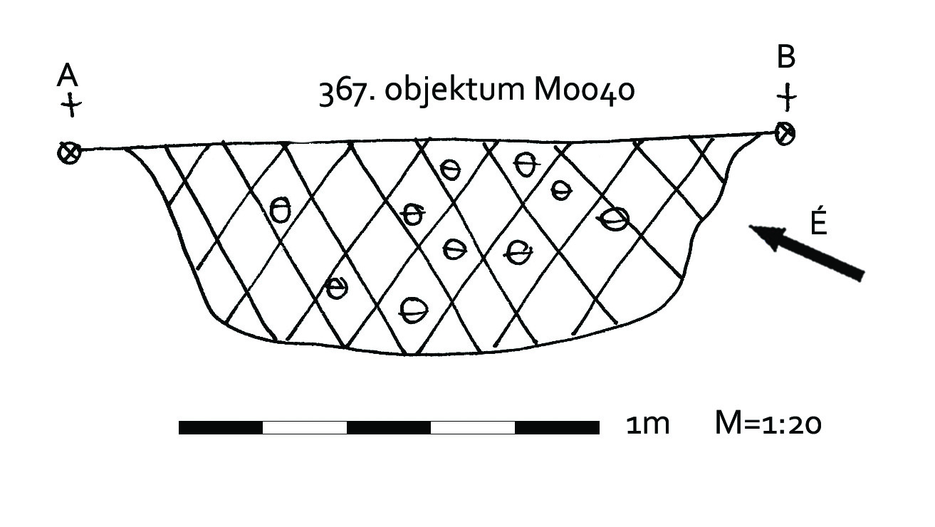 A 359 objektumtól D-re DK-re 2-2,5 m-re locsolás után jól rajzolódó kerek folttal jelentkezett. Kör alaprajzú, enyhén íves falú, íves aljú gödör.
