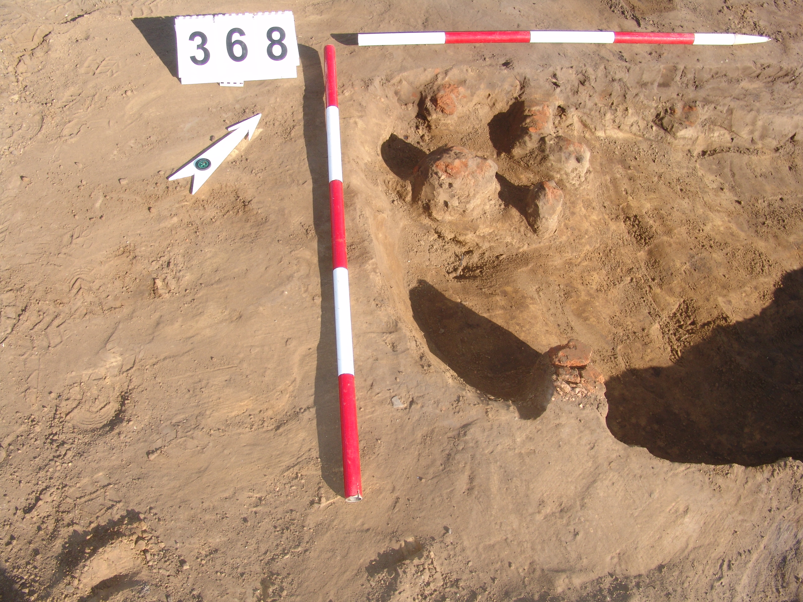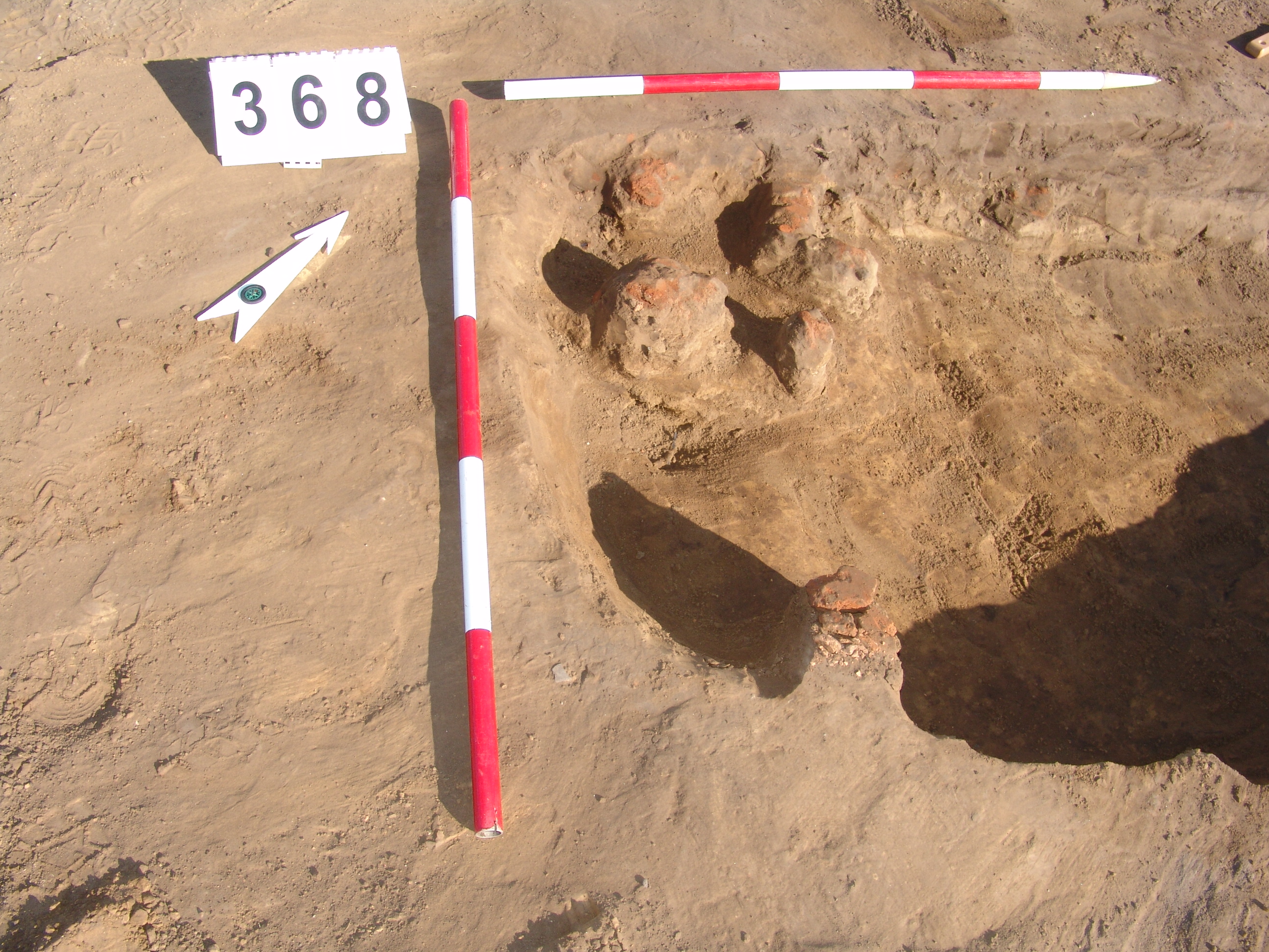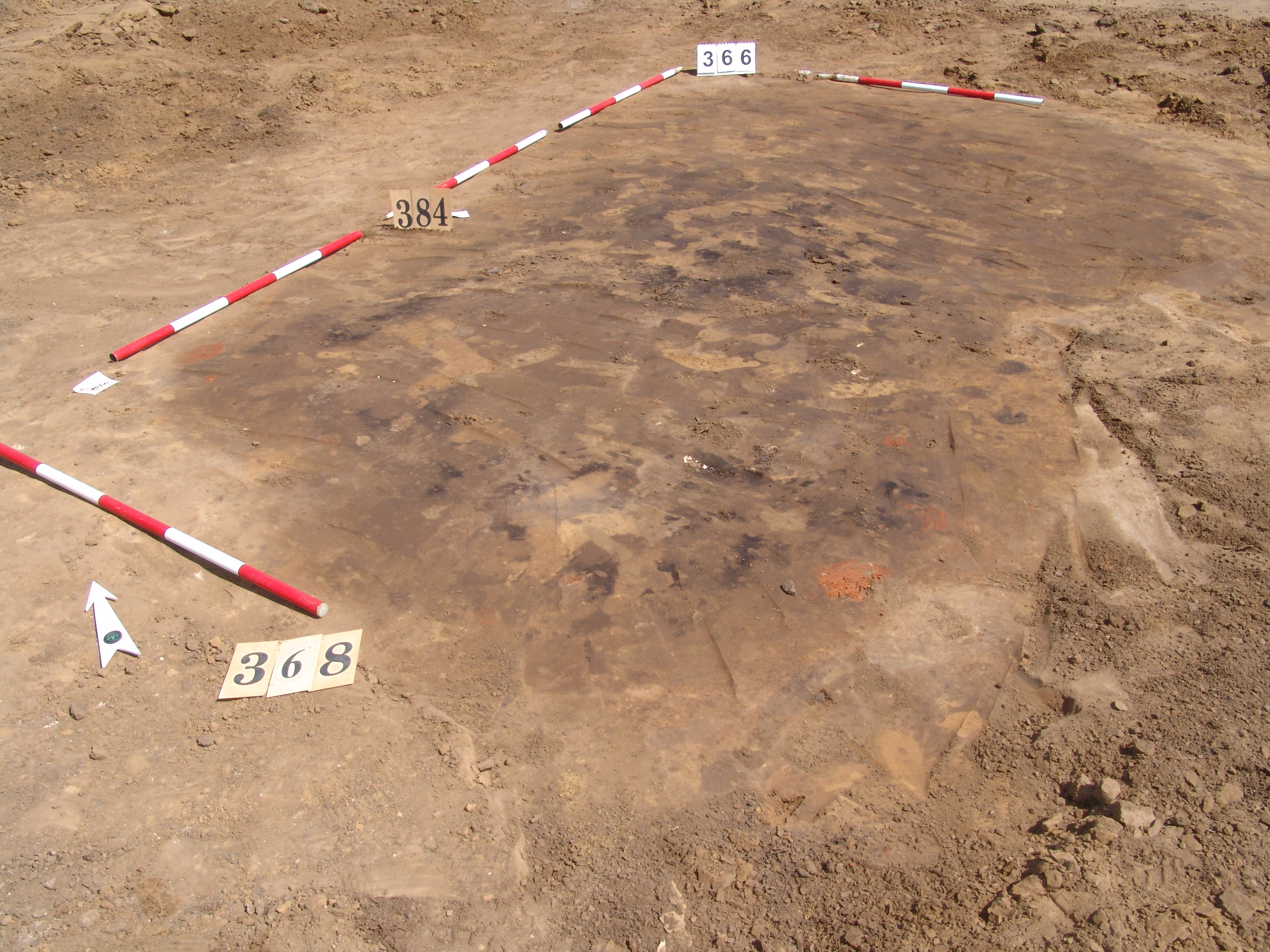 Kerek, jól látható korommal és paticcsal kevert folttal jelentkező objektum, mely Ny-ról vágja a 366. objektumot. Ráásták a 384. kormos, hamus betöltésű gödröt. Széle körben paticsos, kormos.