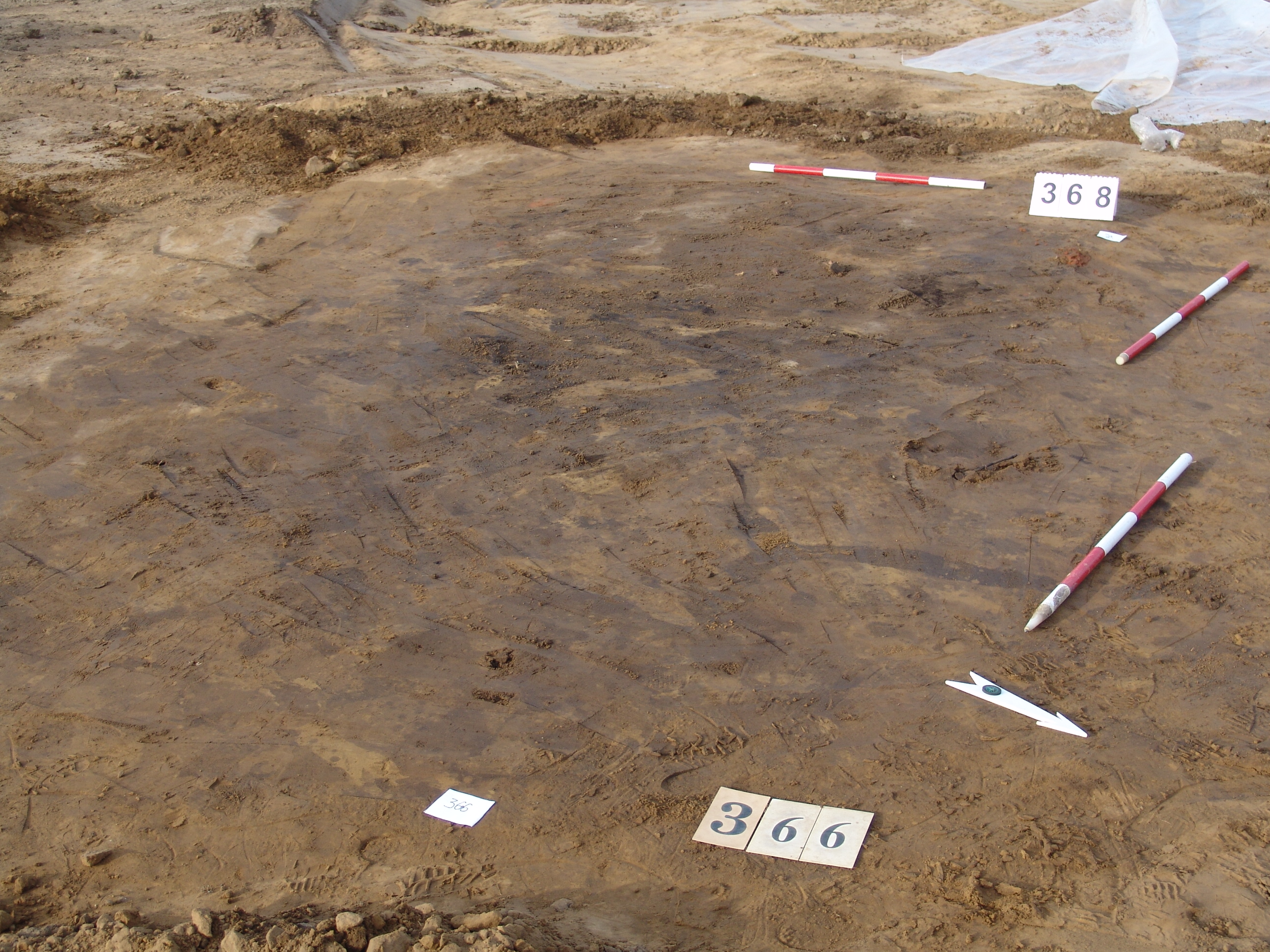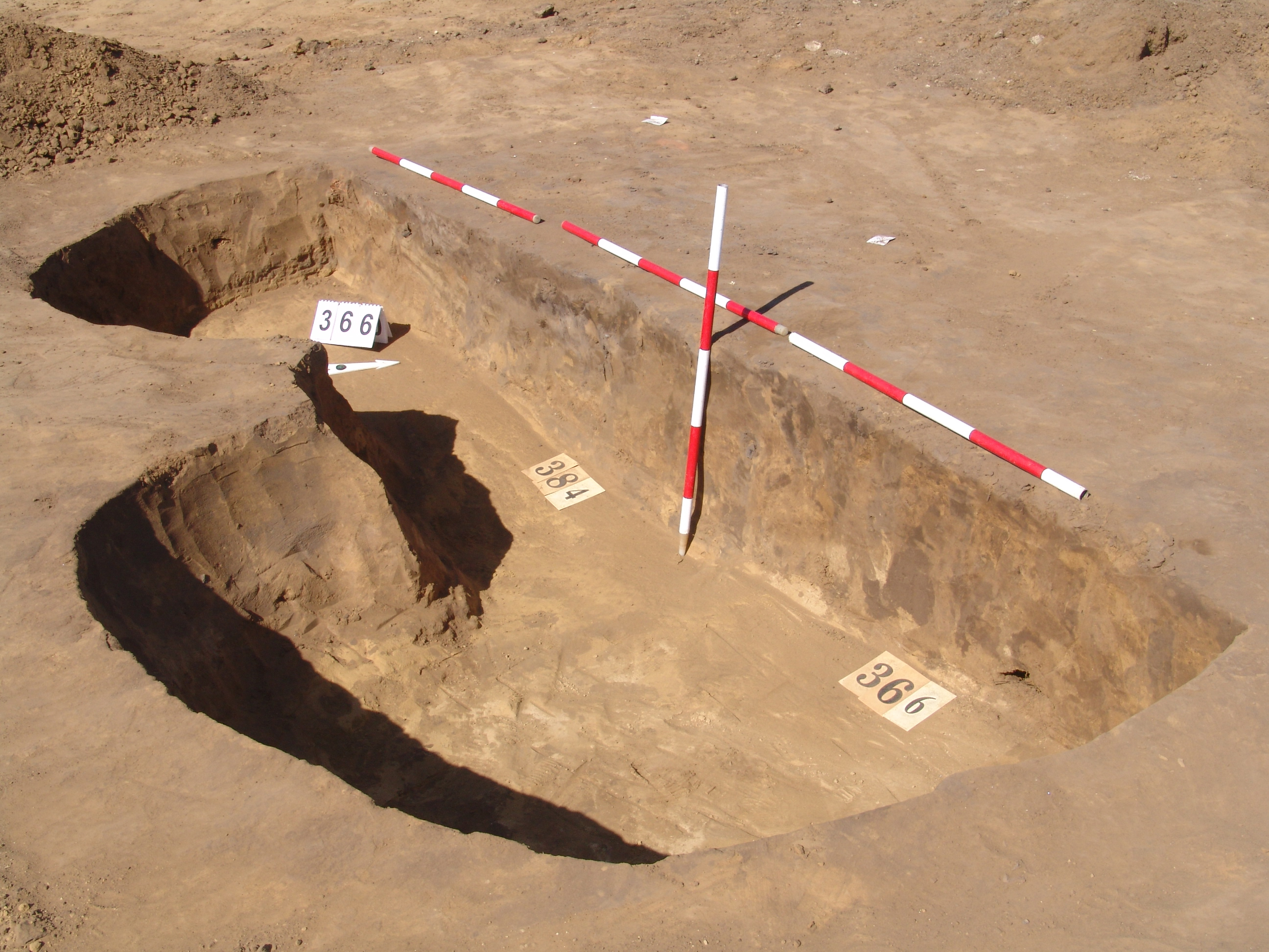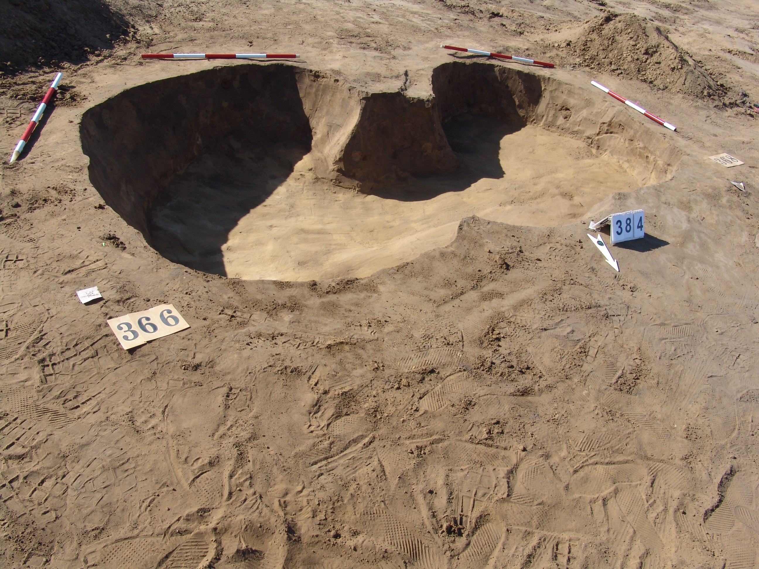 Kerek, jól látható korommal és paticcsal kevert folttal jelentkező objektum, mely Ny-ról vágja a 366. objektumot. Ráásták a 384. kormos, hamus betöltésű gödröt. Széle körben paticsos, kormos.