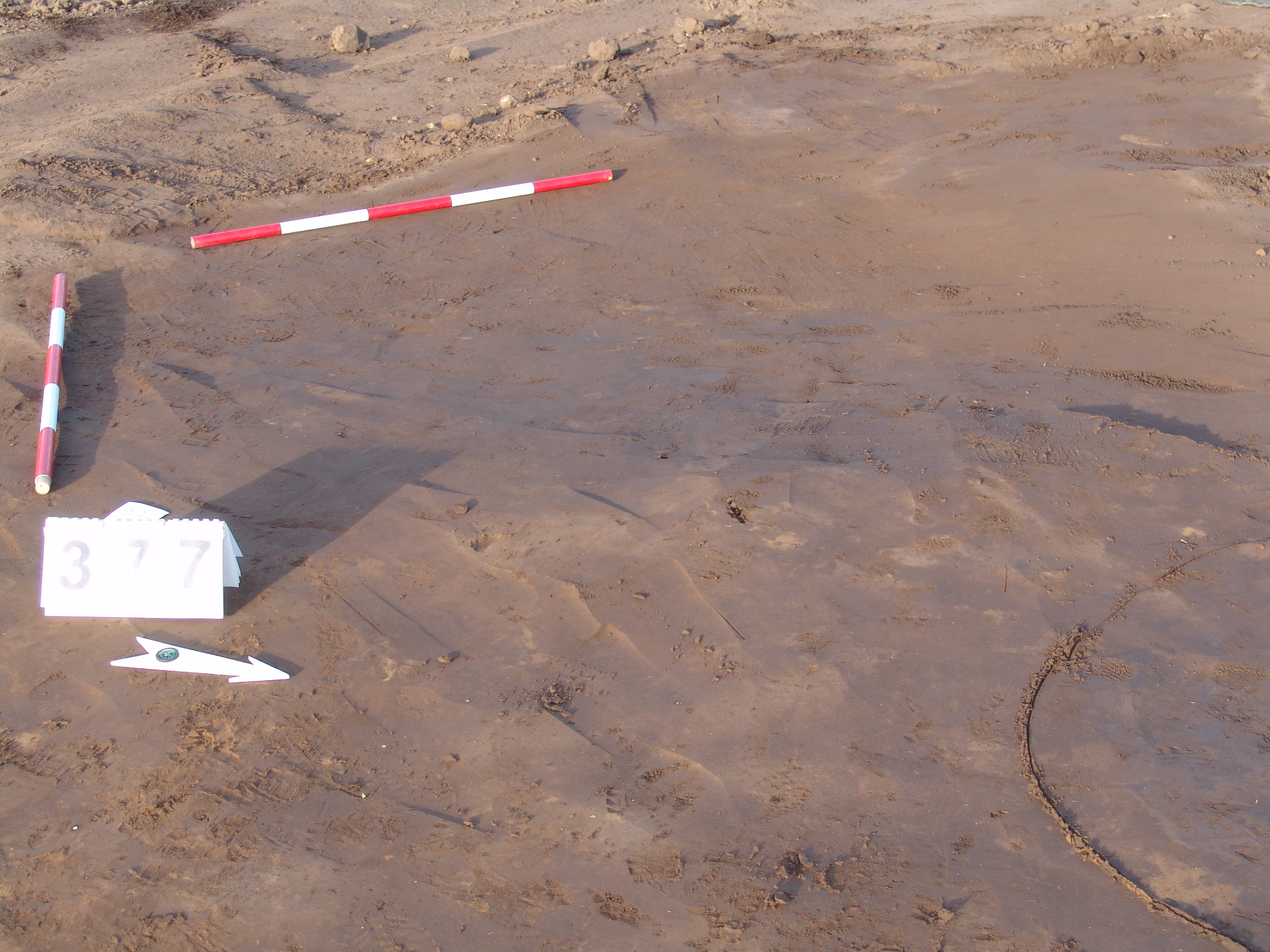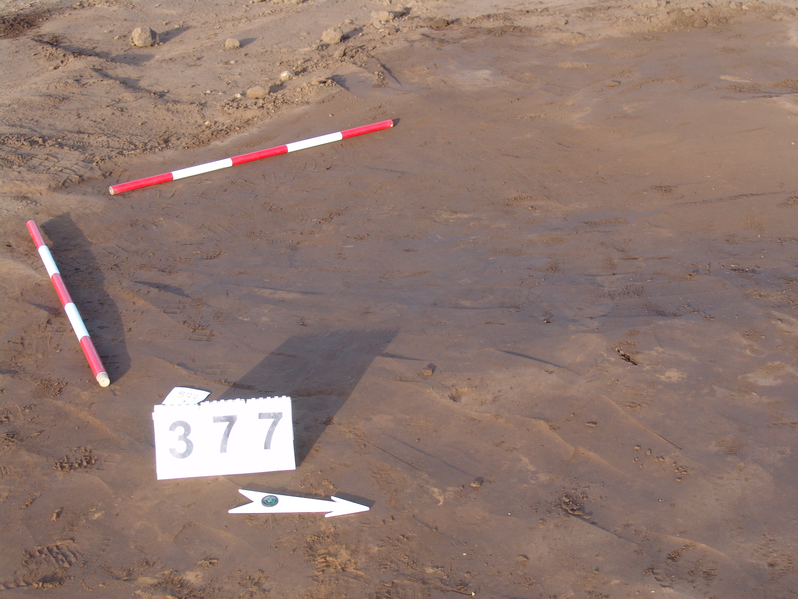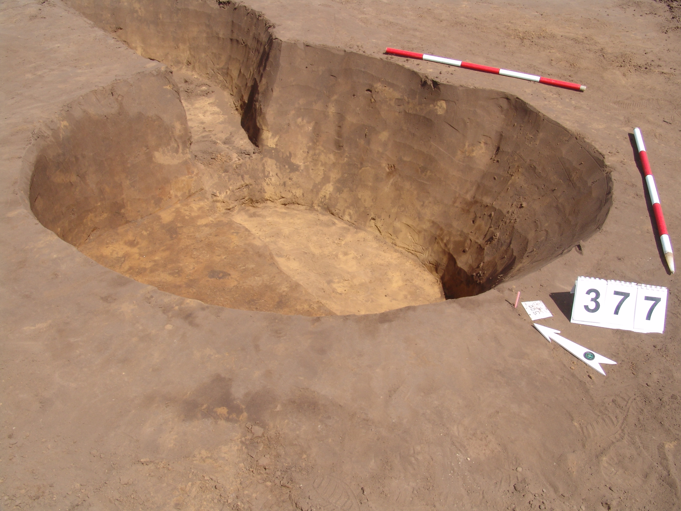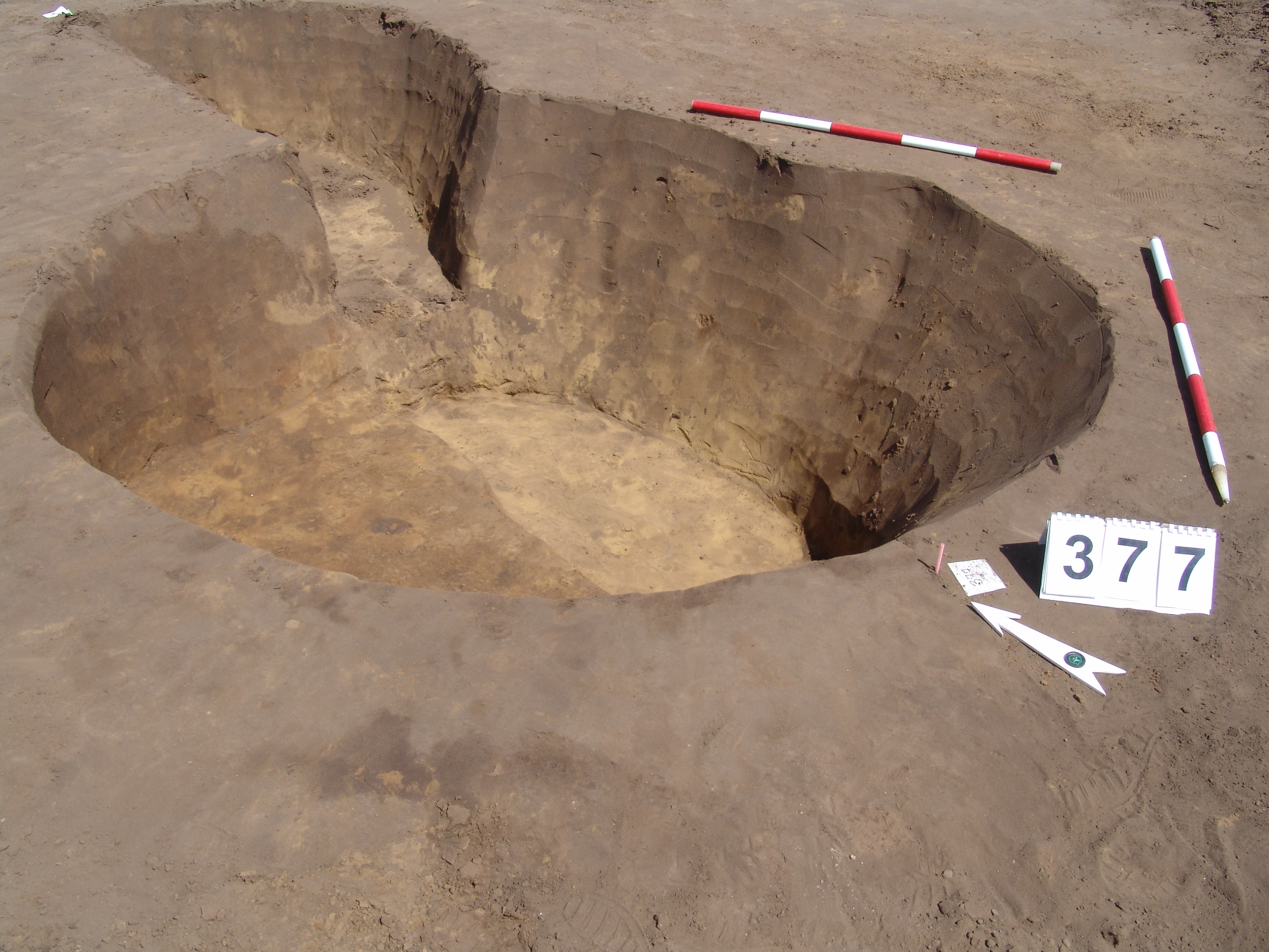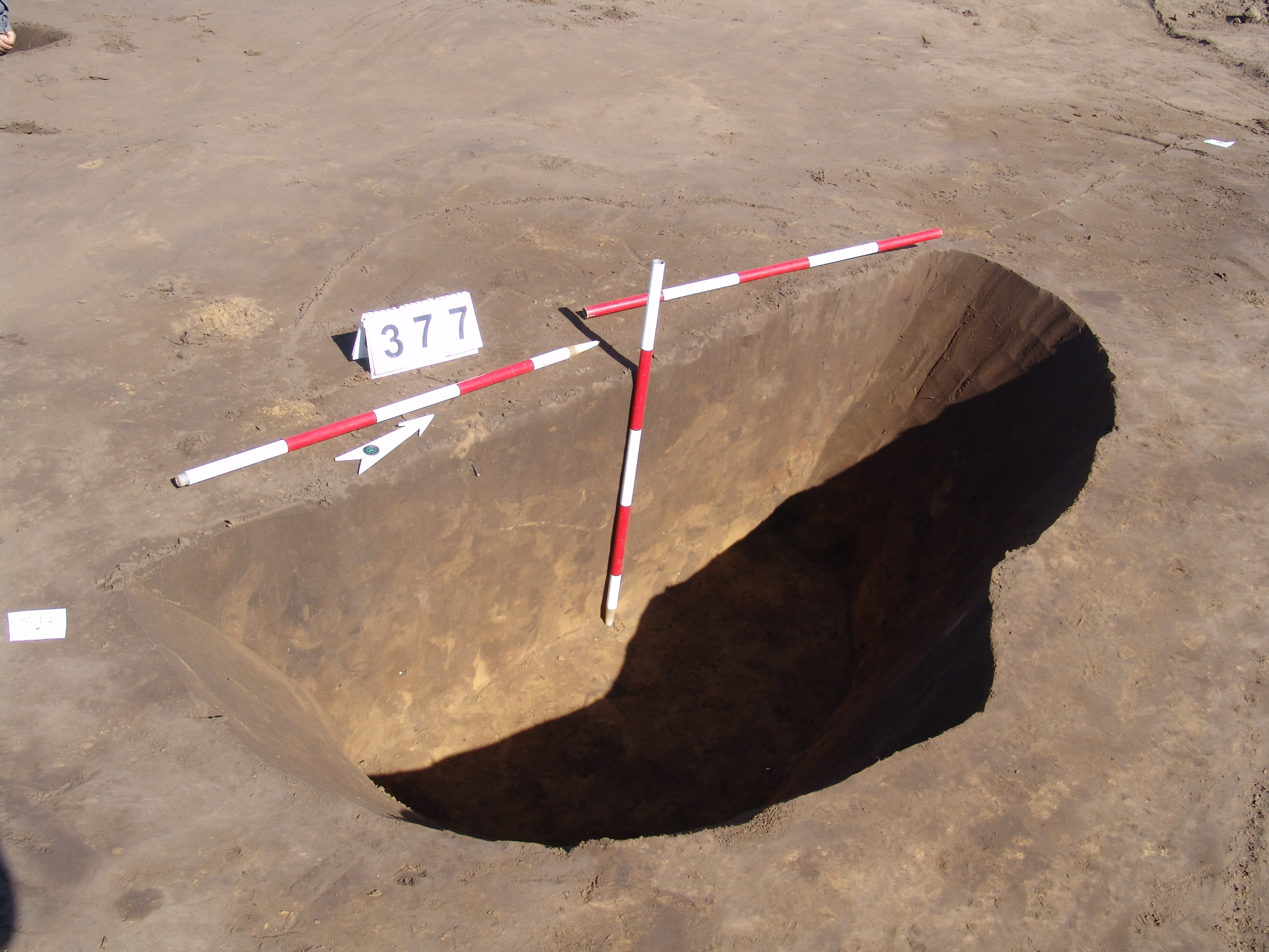 A 375. objektum közvetlen közelében, tőle DNy-ra kerek folttal jelentkező gödör. Fala meredeken kicsit túlbontott. Betöltése: sárga szemcsés barnásszürke, benne kevés égett rög.