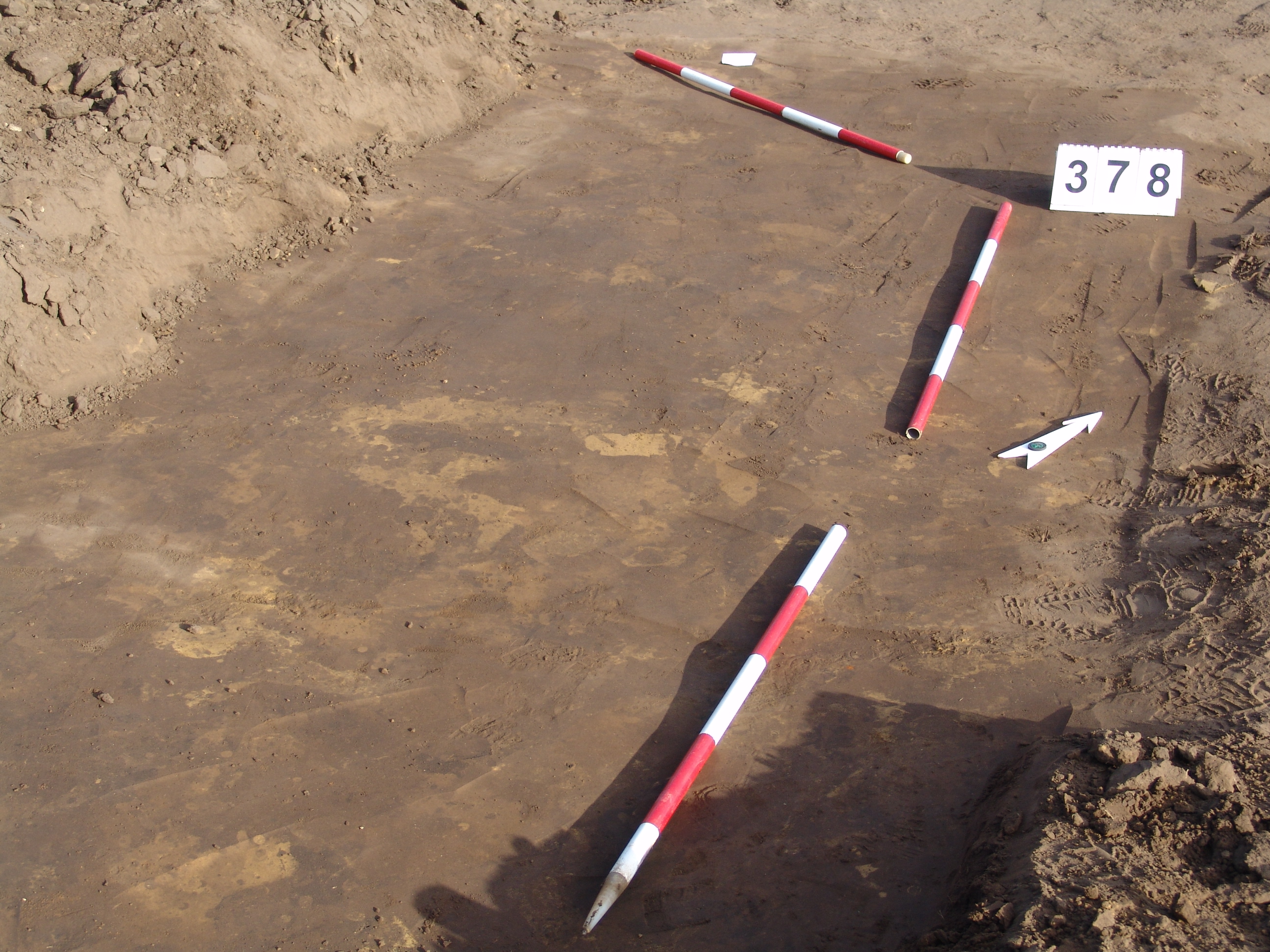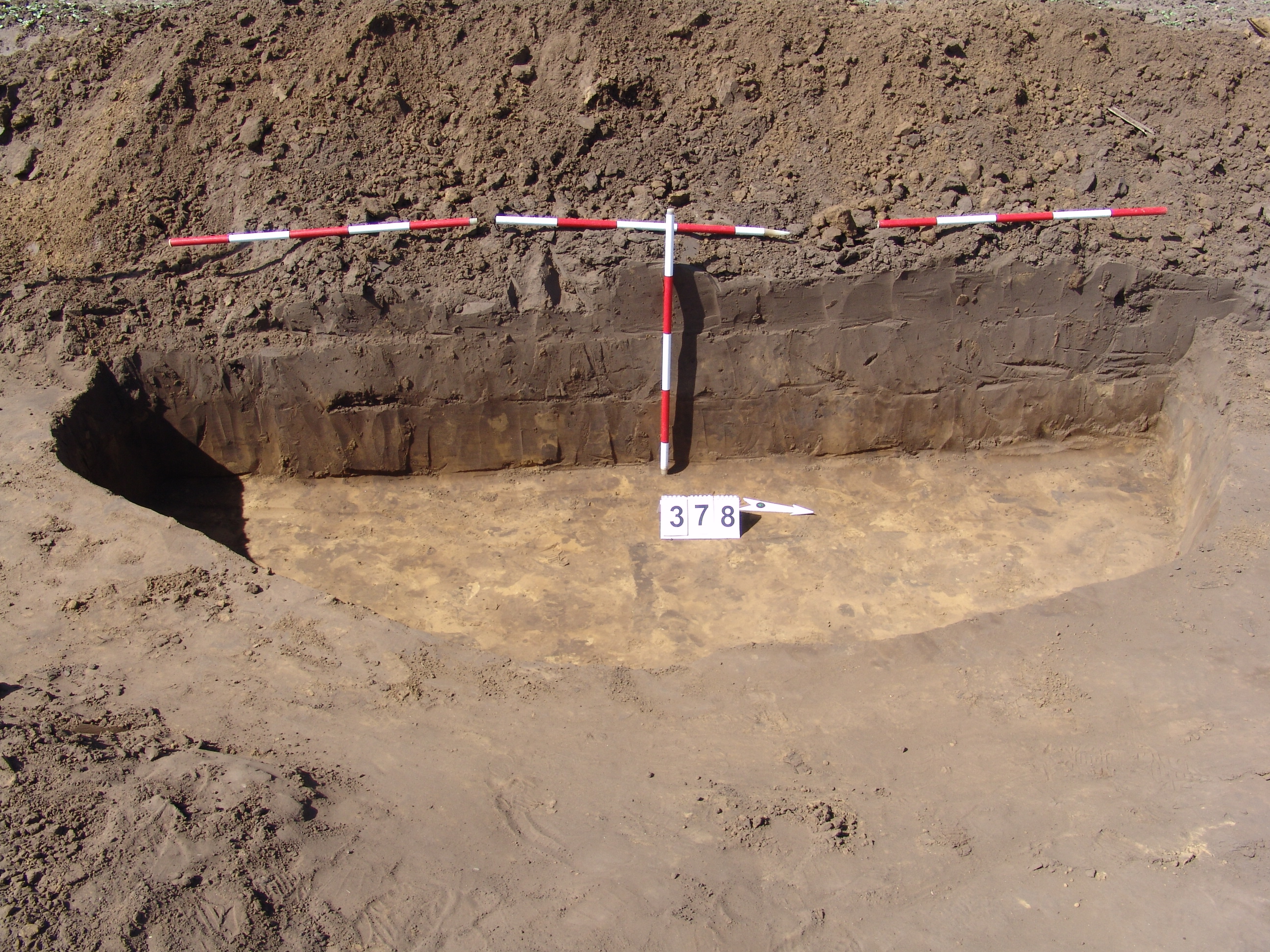 Elúszó félkör alakú folttal jelentkező gödör a Ny-i fal mellett a 376. objektumtól ÉNy-ra. Nagy méretű, csaknem függőleges falú gödör. Alja egyenes.