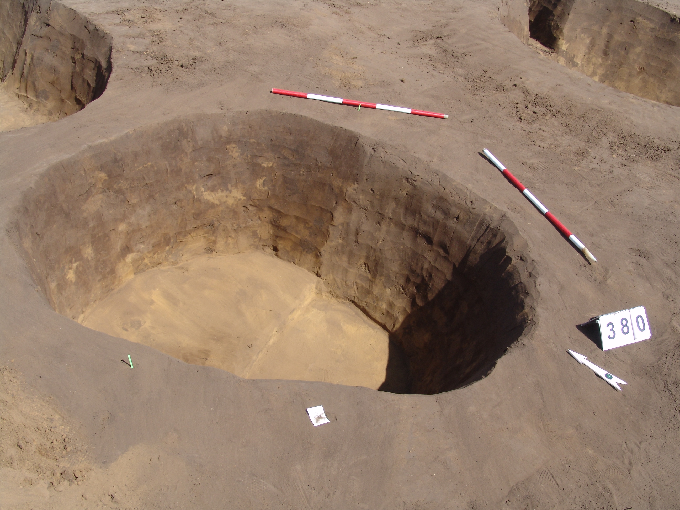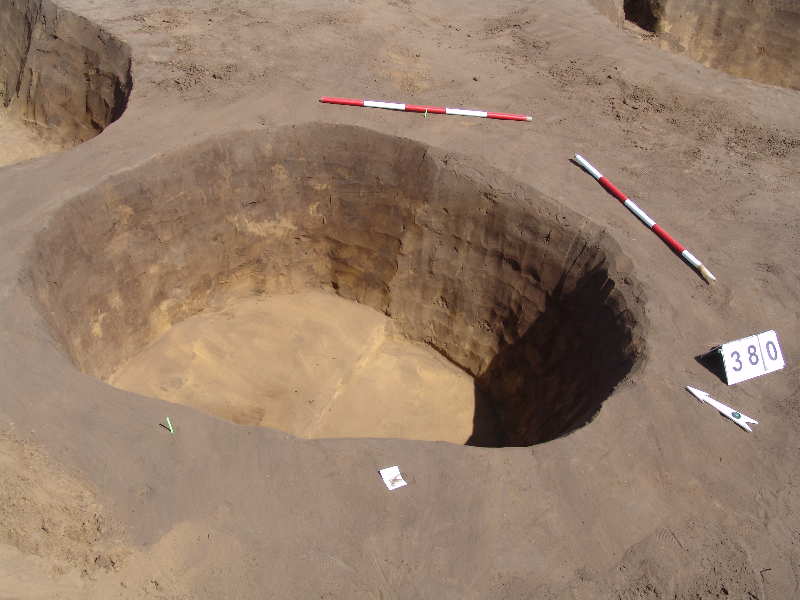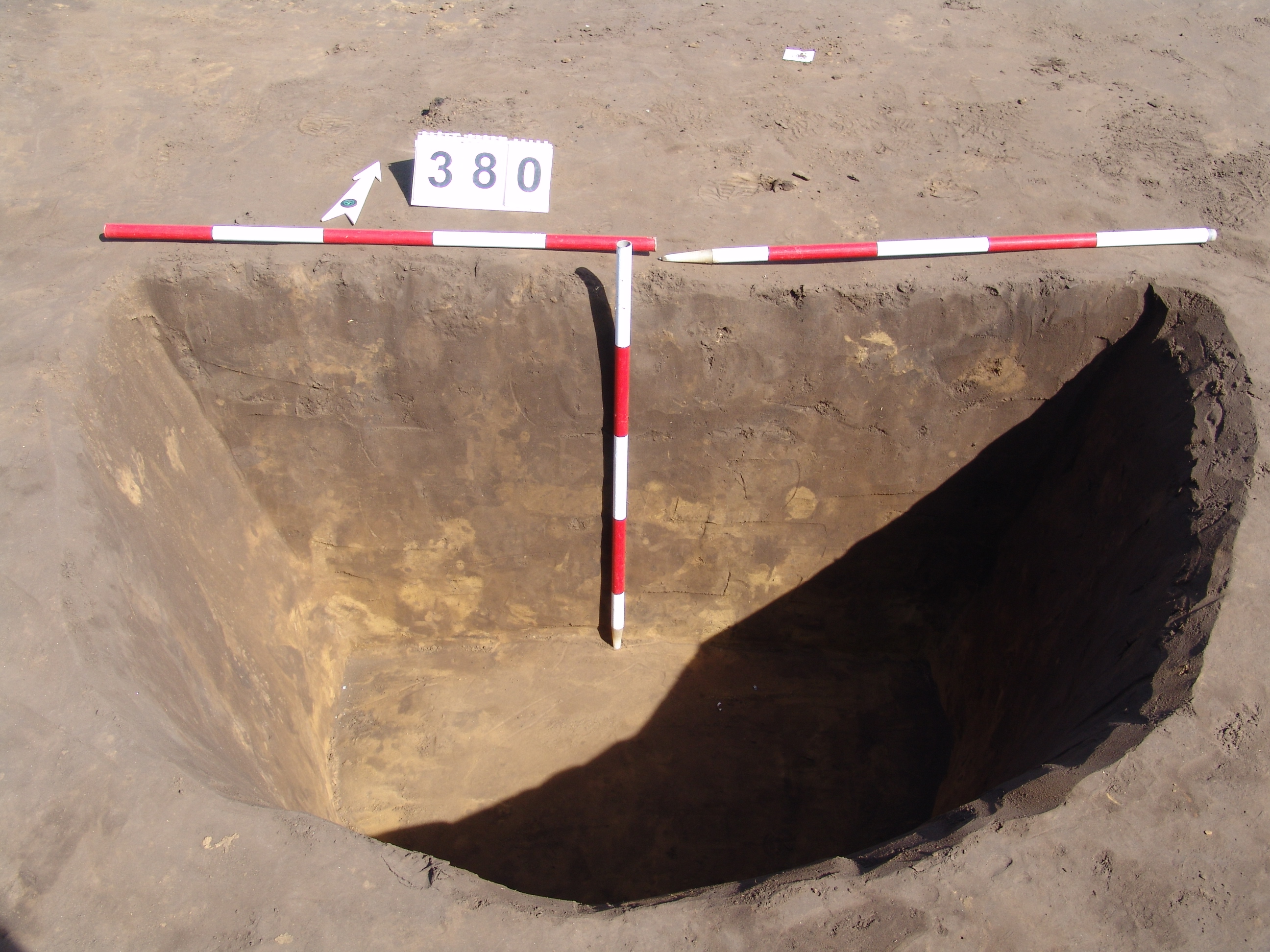 A 375. és 377. -től Ny-ra kerek folttal jelentkezett. Talán kör alaprajzú, elég bizonytalan szélű, meredek falú, egyenes aljú gödör. Sárga szemcsés barnásszürke betöltésű.