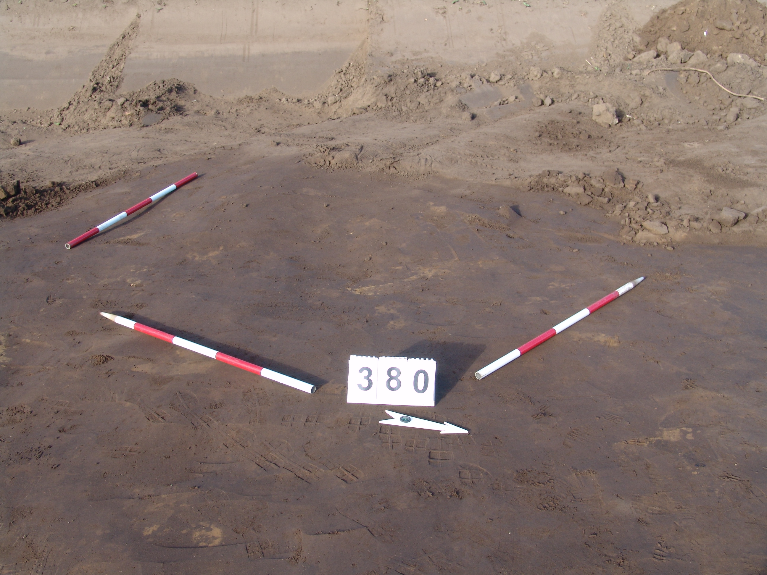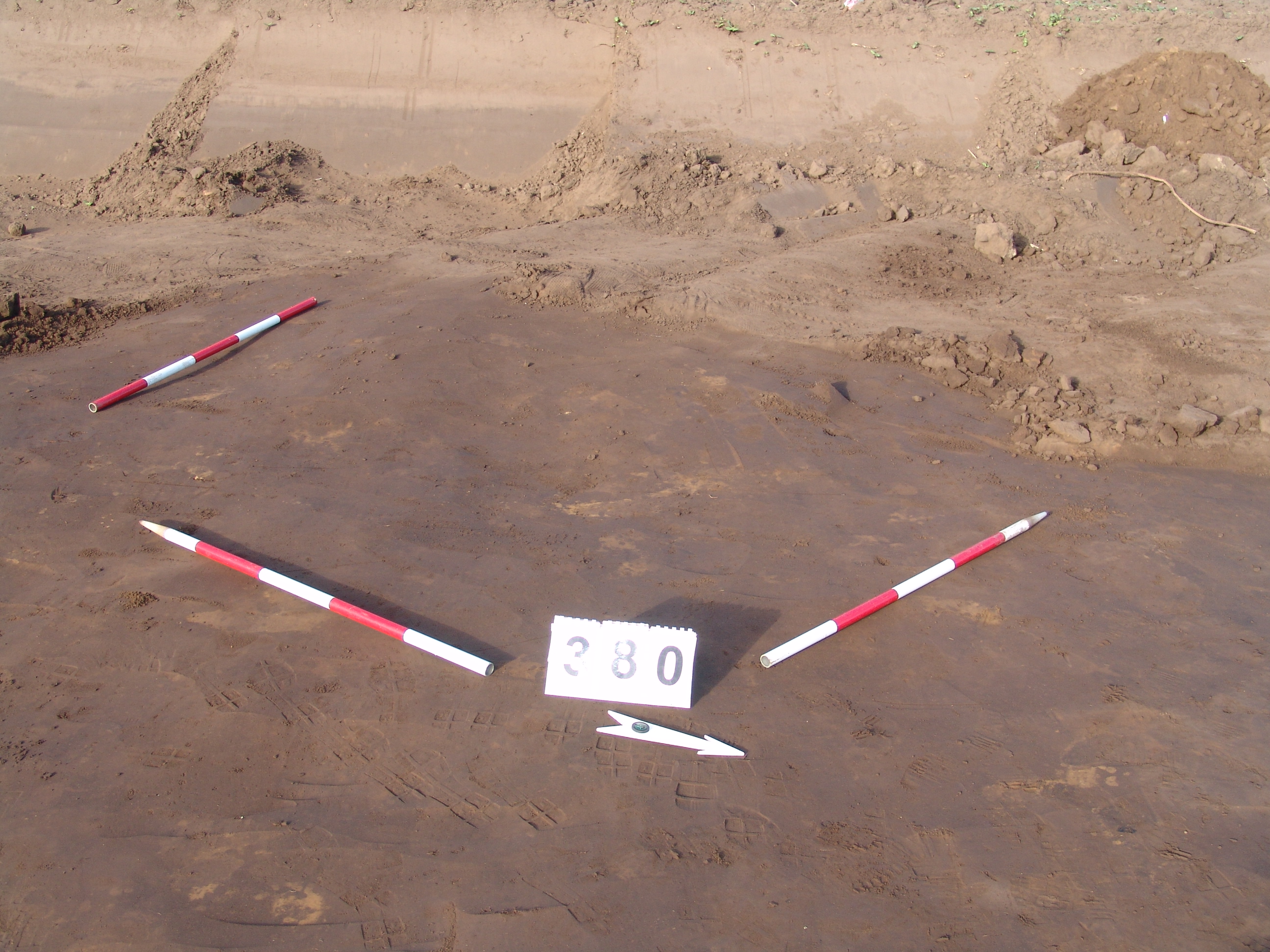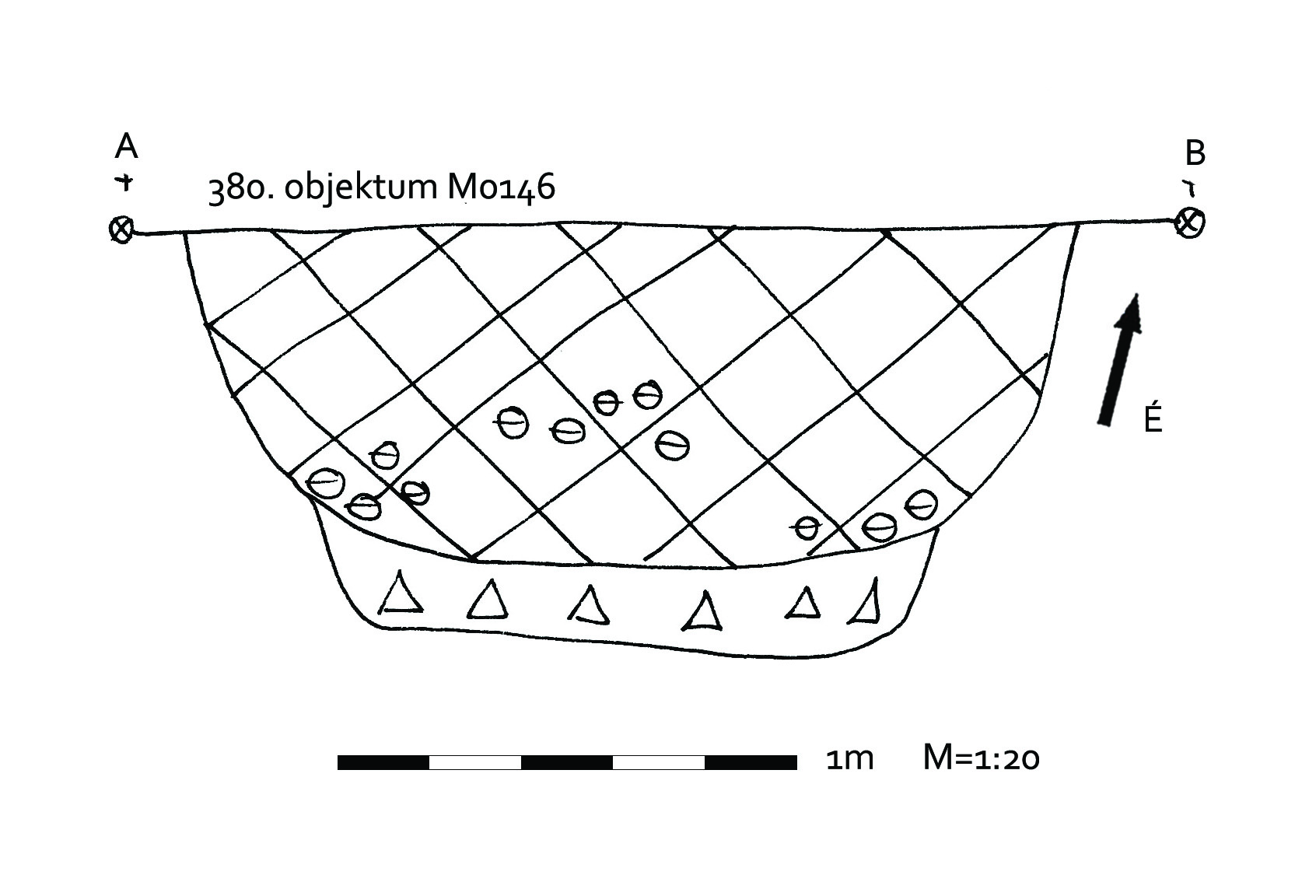 A 375. és 377. -től Ny-ra kerek folttal jelentkezett. Talán kör alaprajzú, elég bizonytalan szélű, meredek falú, egyenes aljú gödör. Sárga szemcsés barnásszürke betöltésű.