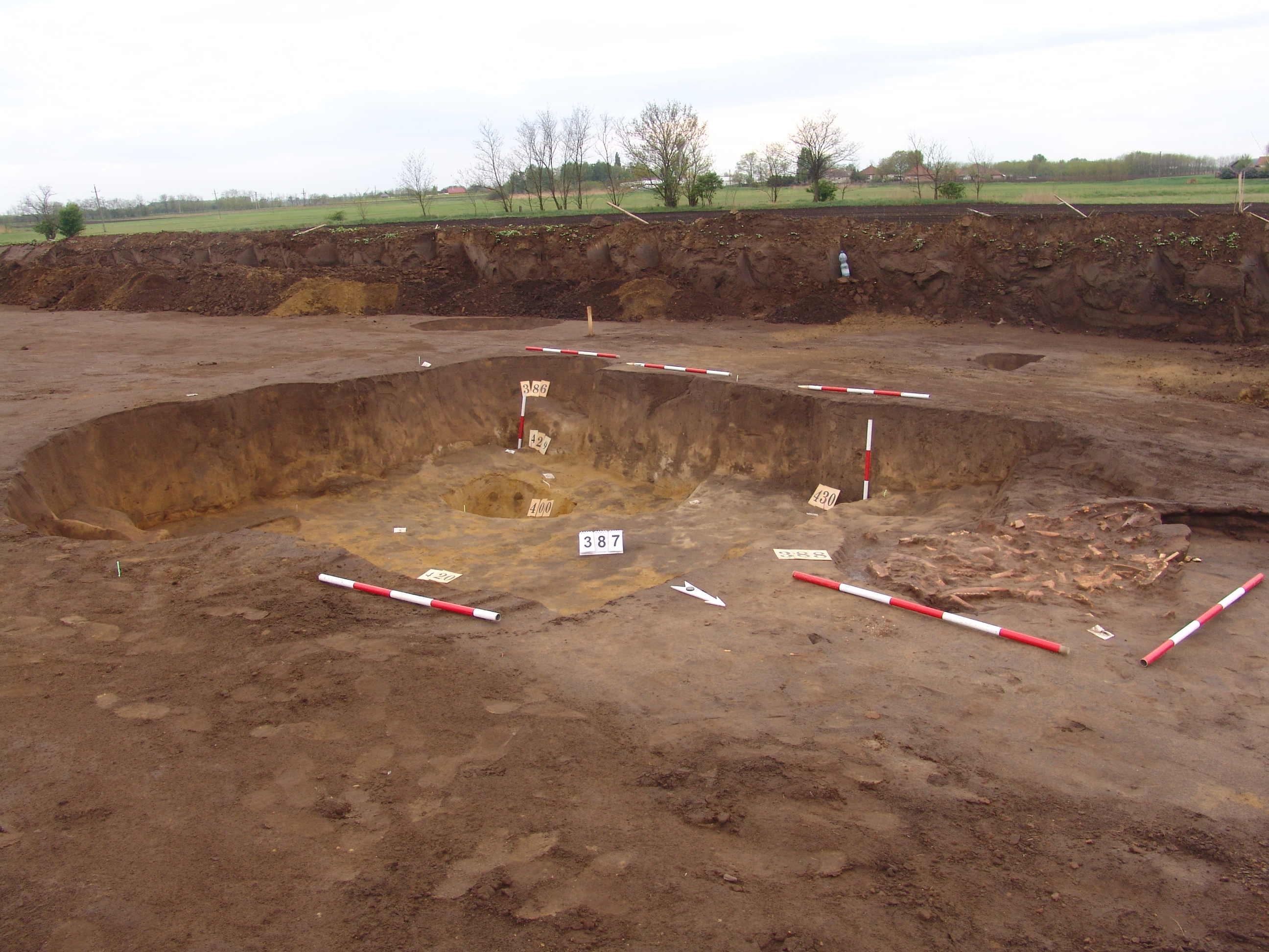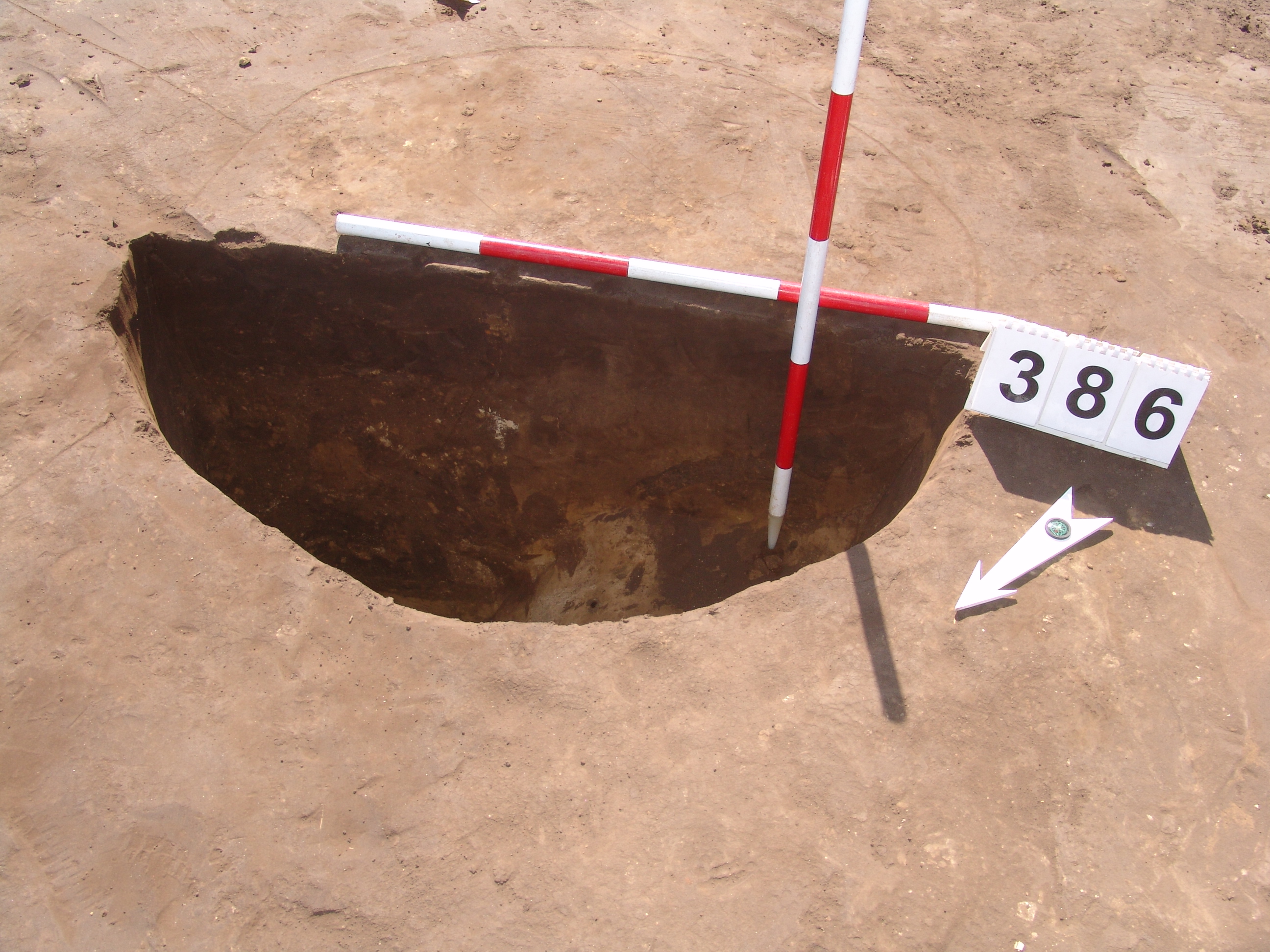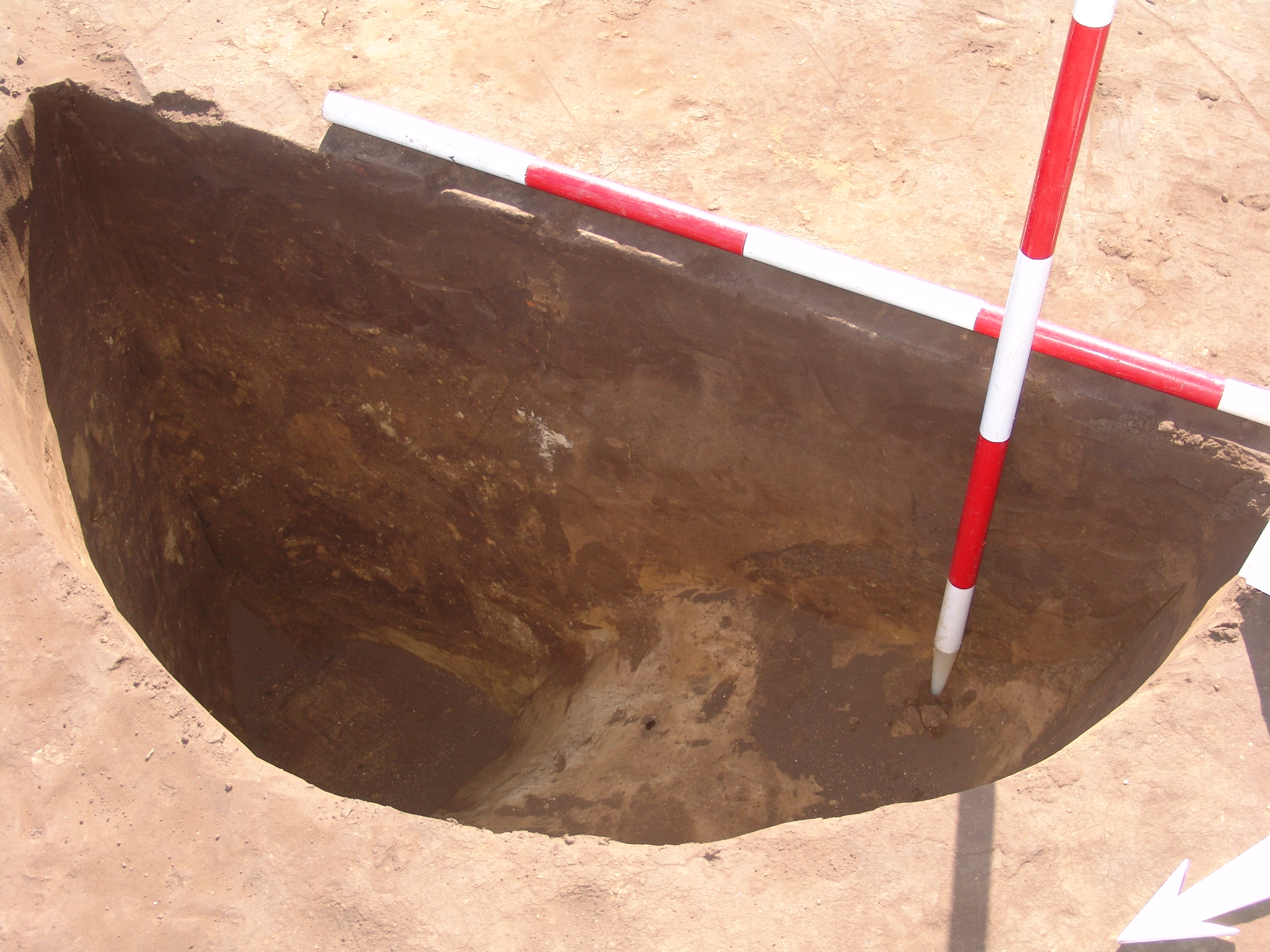 A 4279. karótól K-re 2 méterre a 387. ház DNy-i sarkánál kerek folt jelentkezett a sötétszürke homokban. Meredek falú, egyenes aljú, kör alaprajzú gödör.