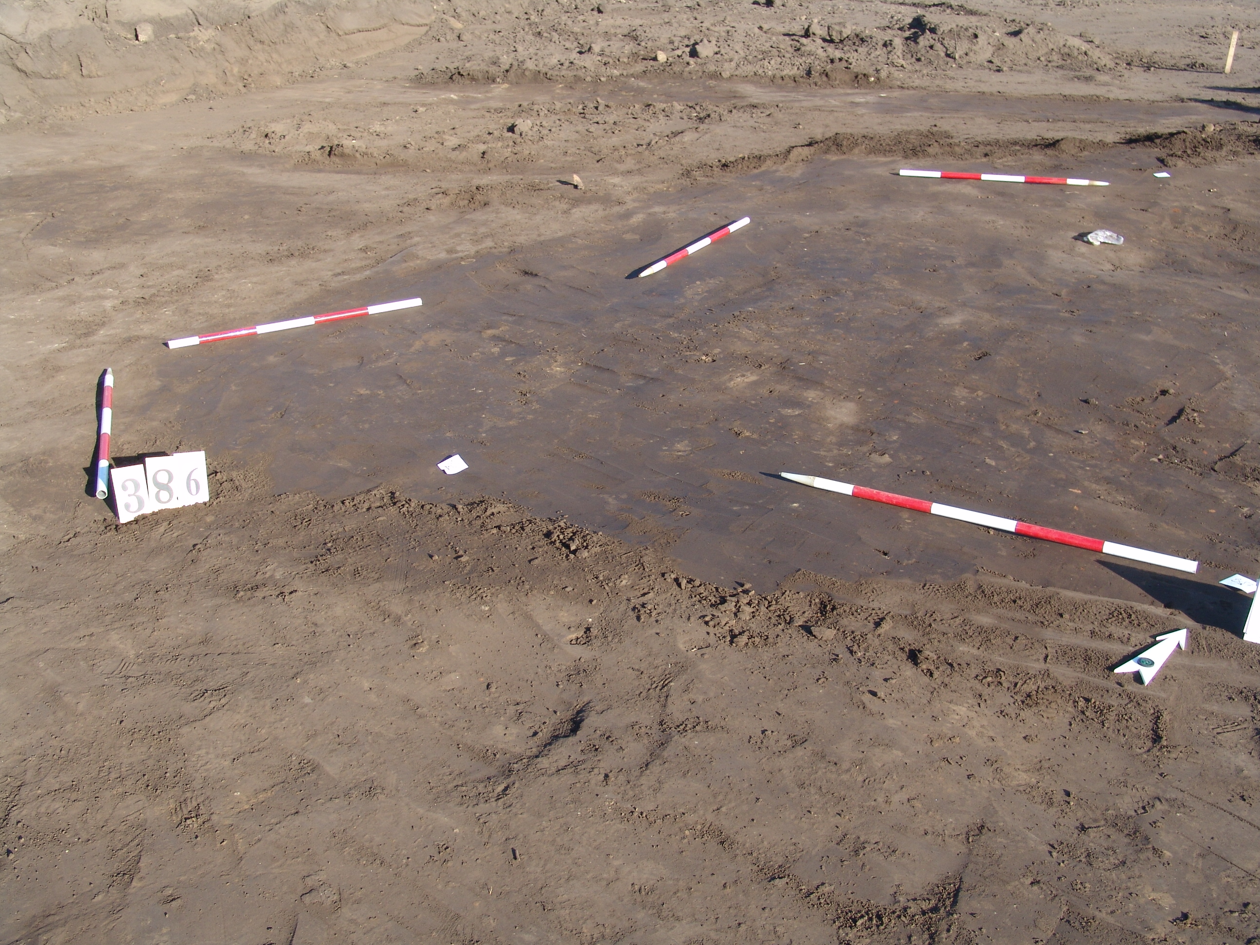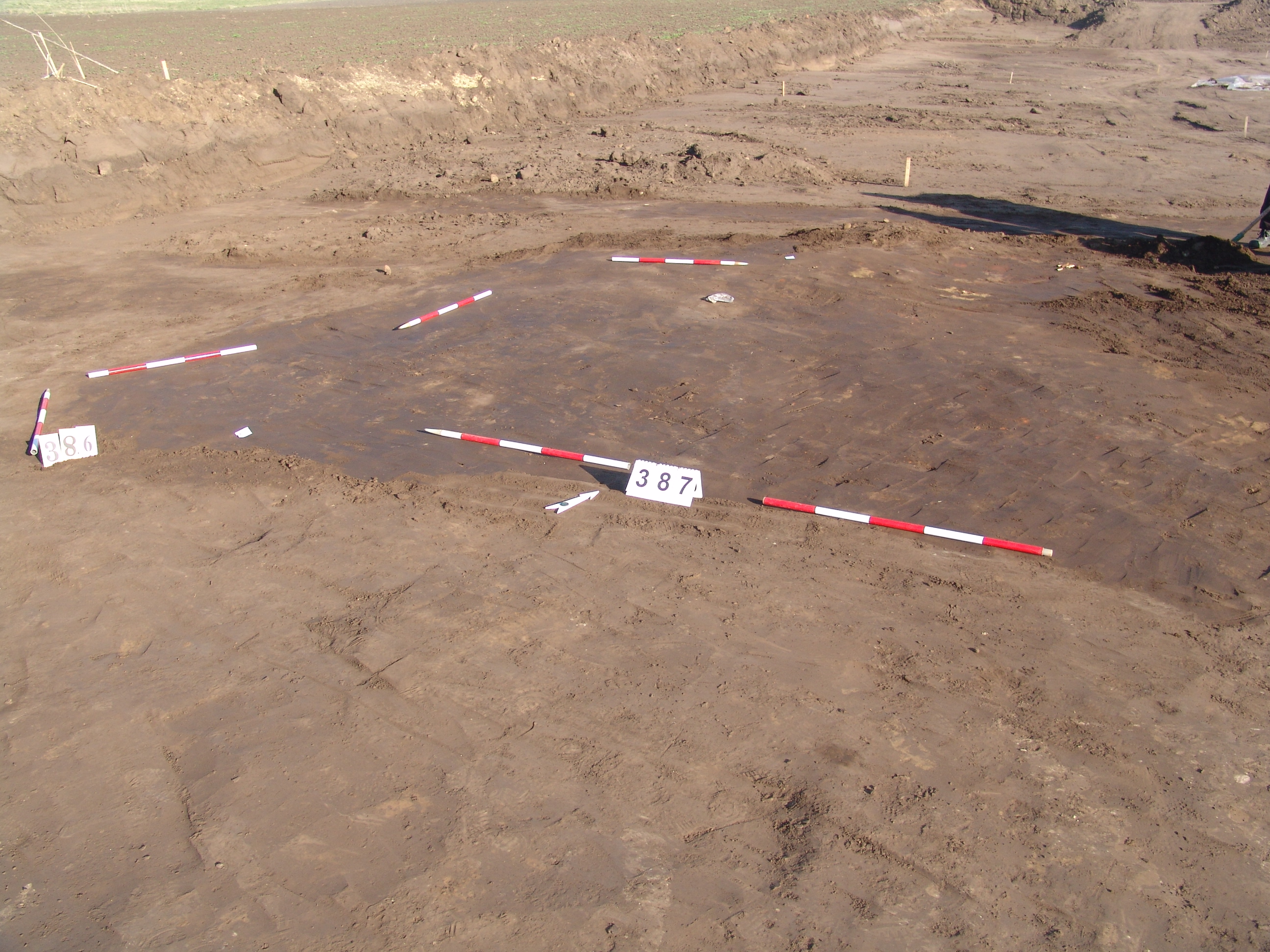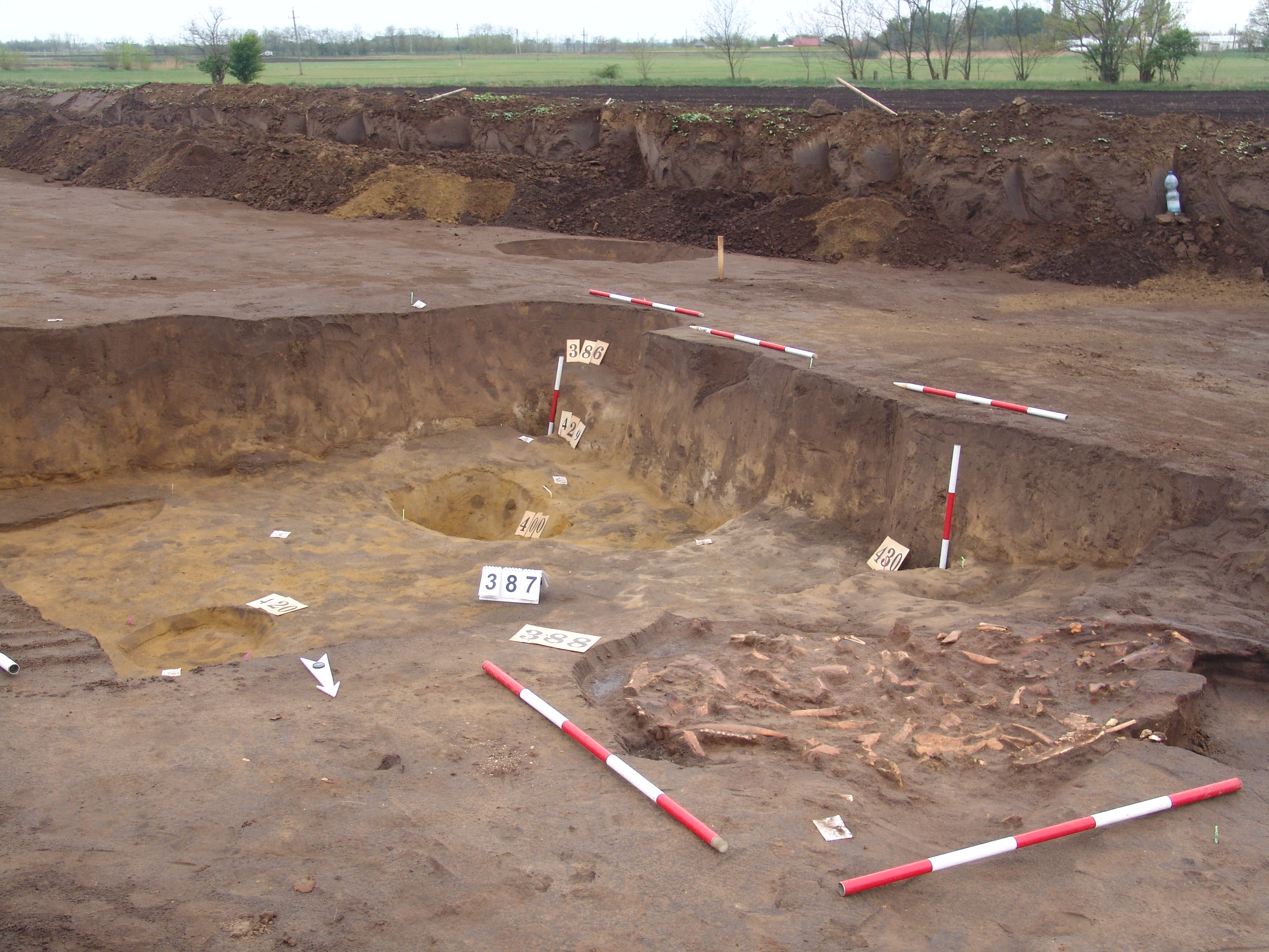 A 4279. karótól K-re 2 méterre a 387. ház DNy-i sarkánál kerek folt jelentkezett a sötétszürke homokban. Meredek falú, egyenes aljú, kör alaprajzú gödör.