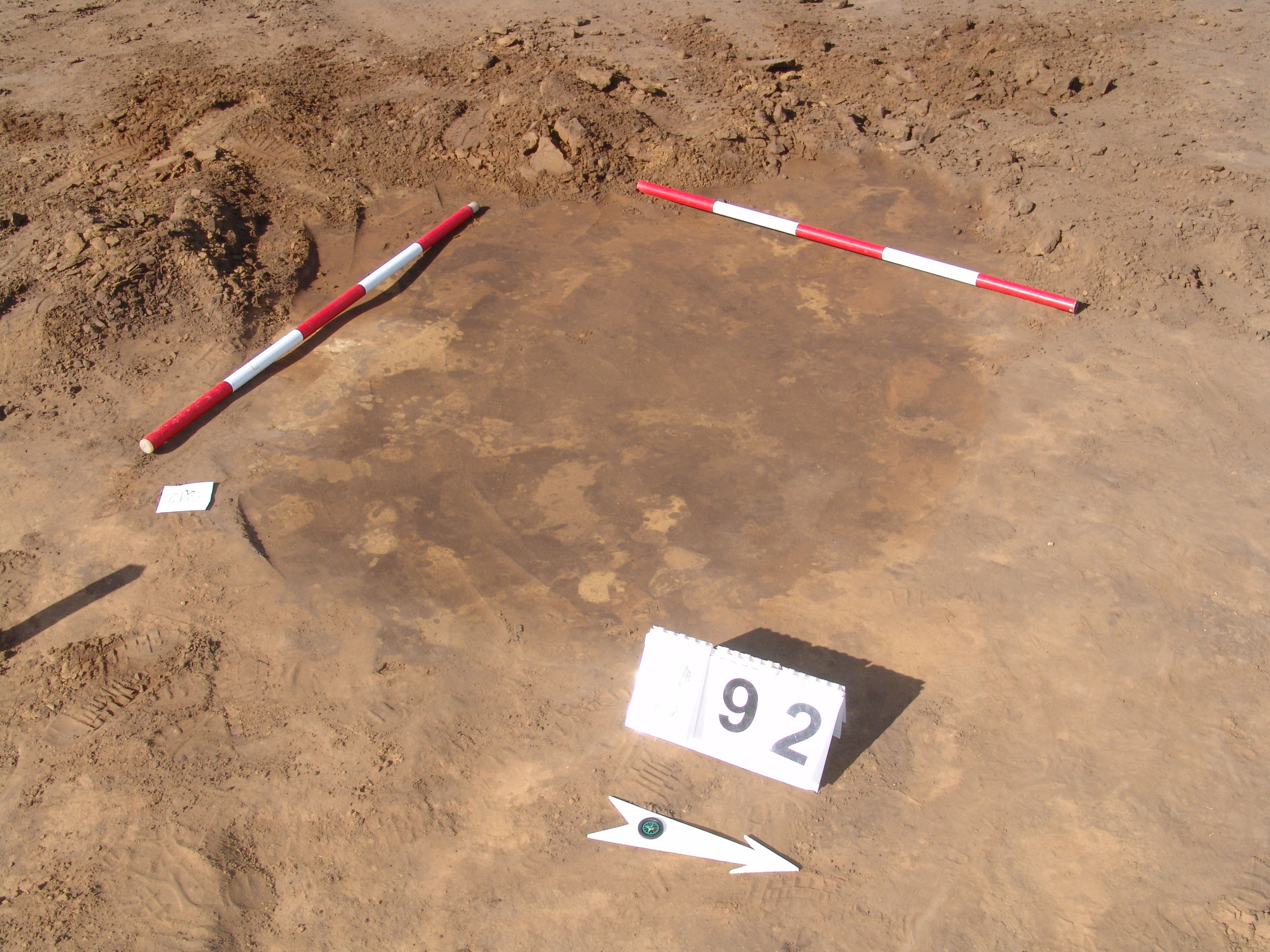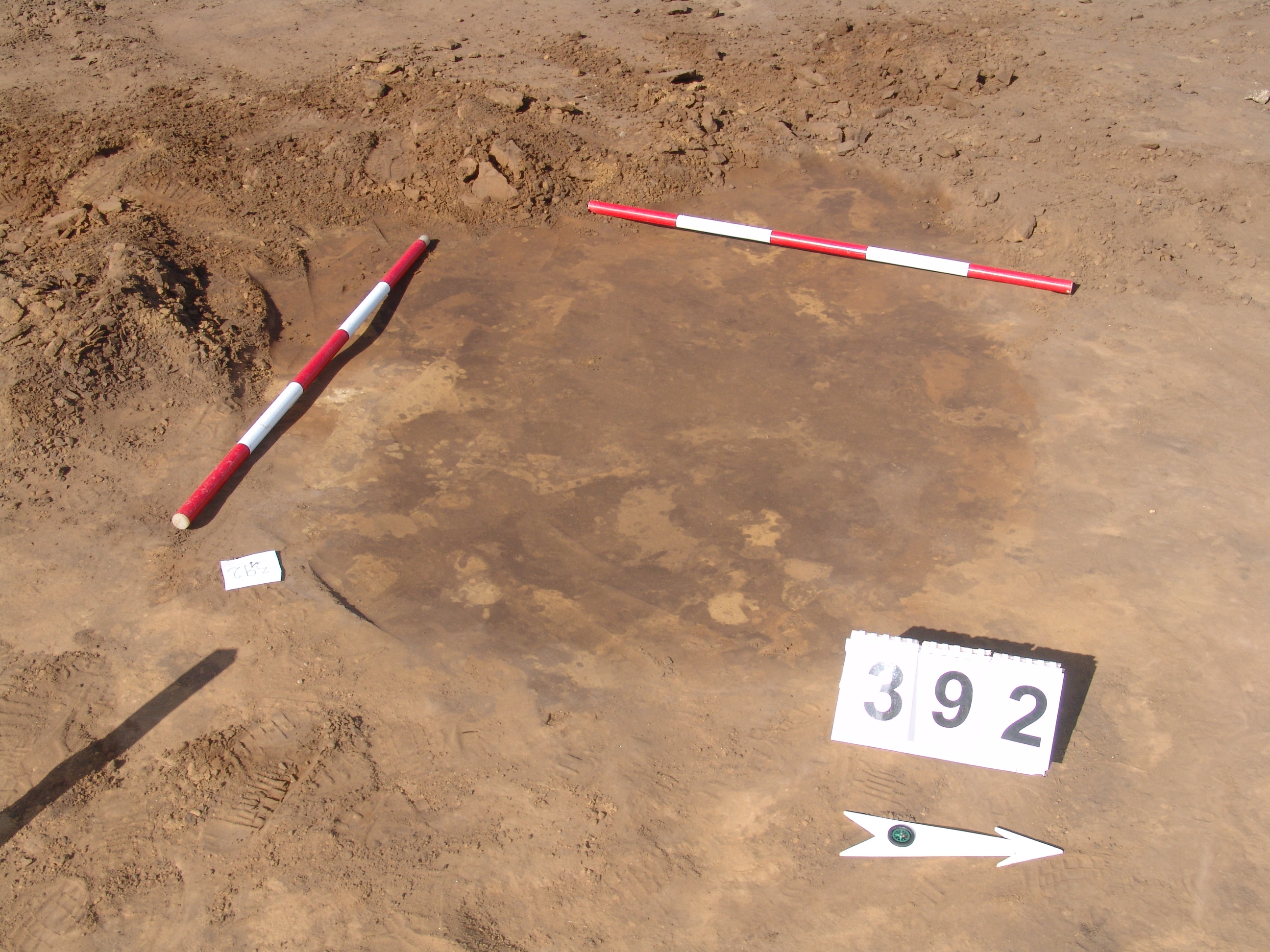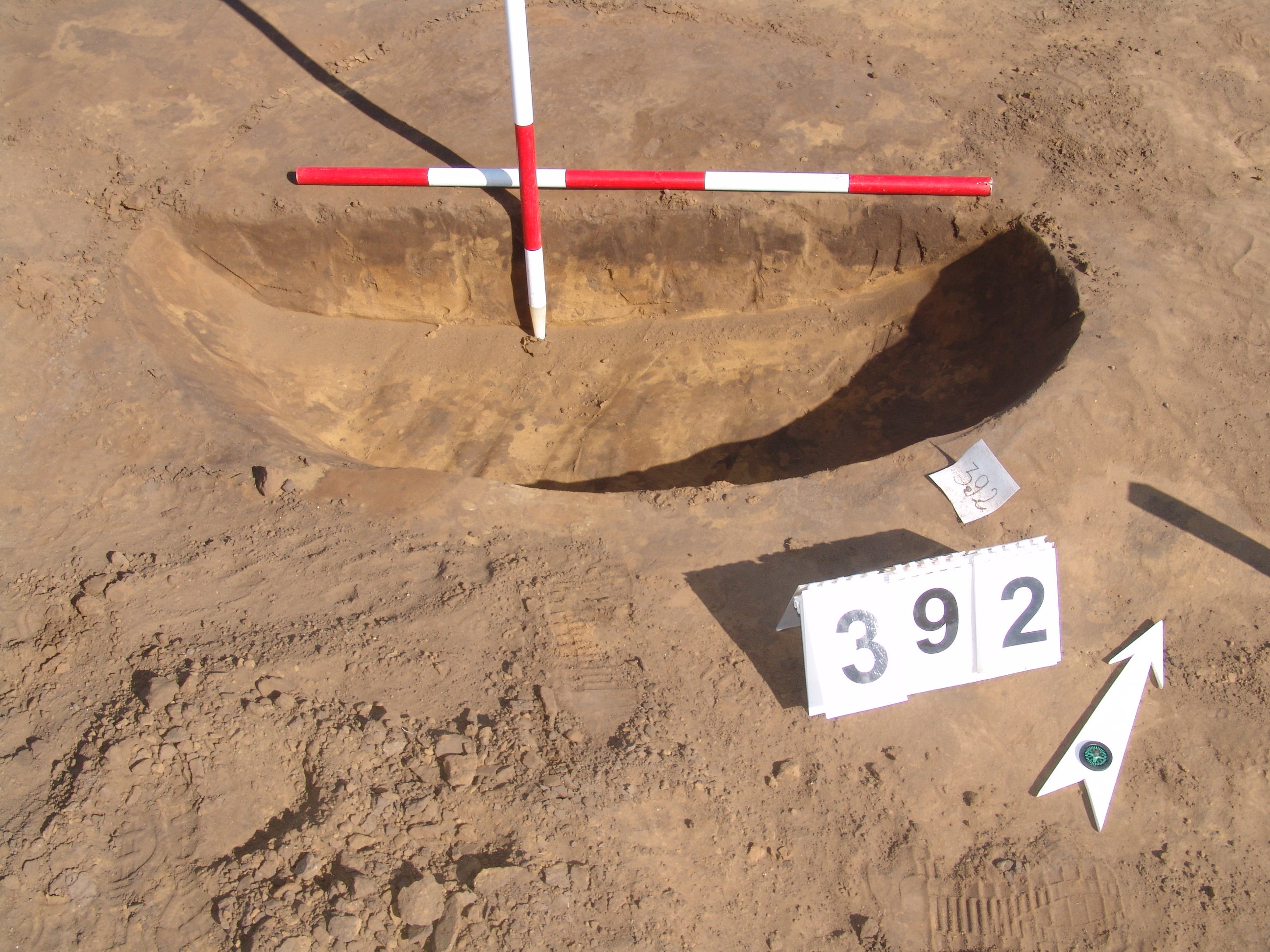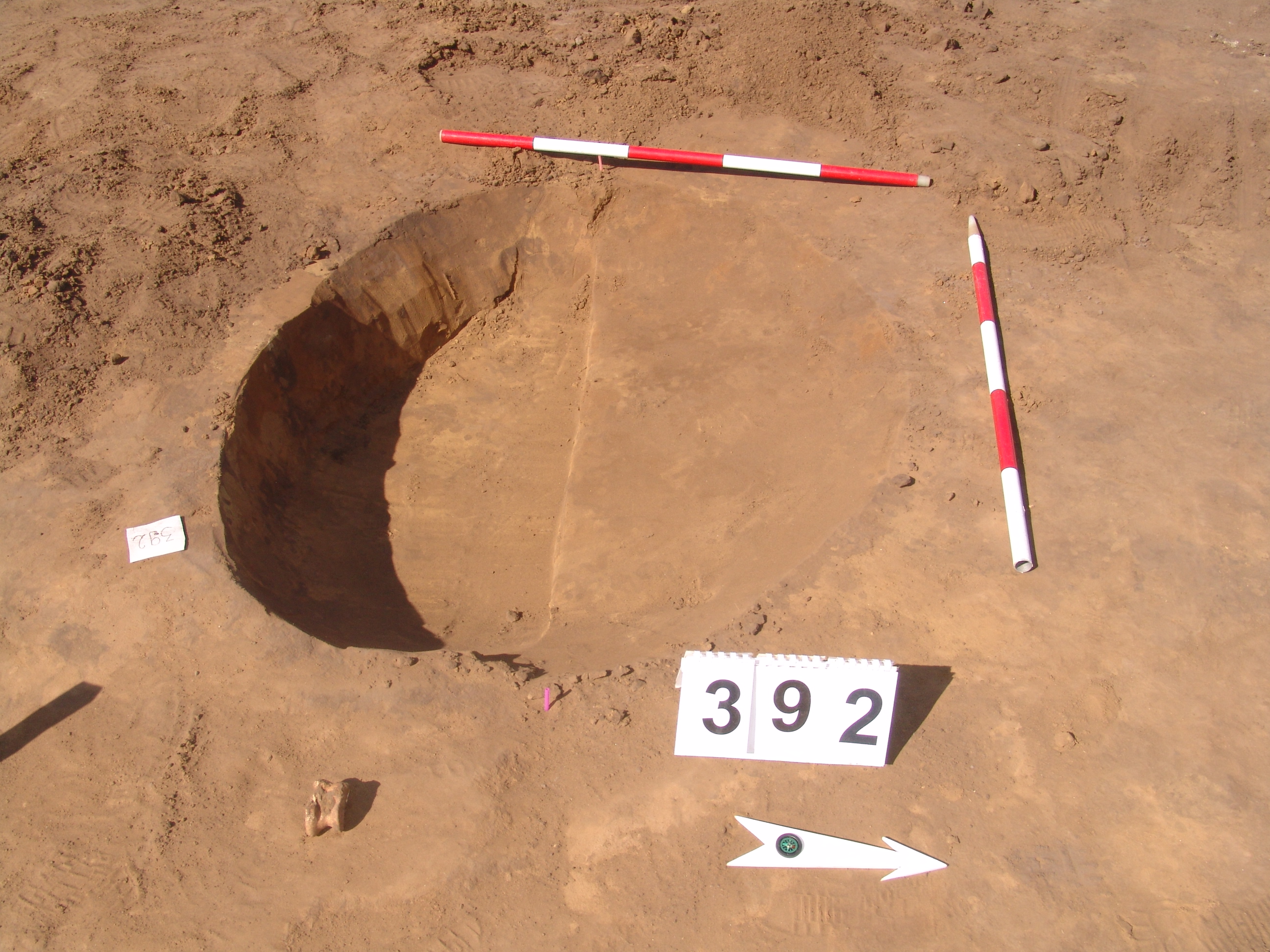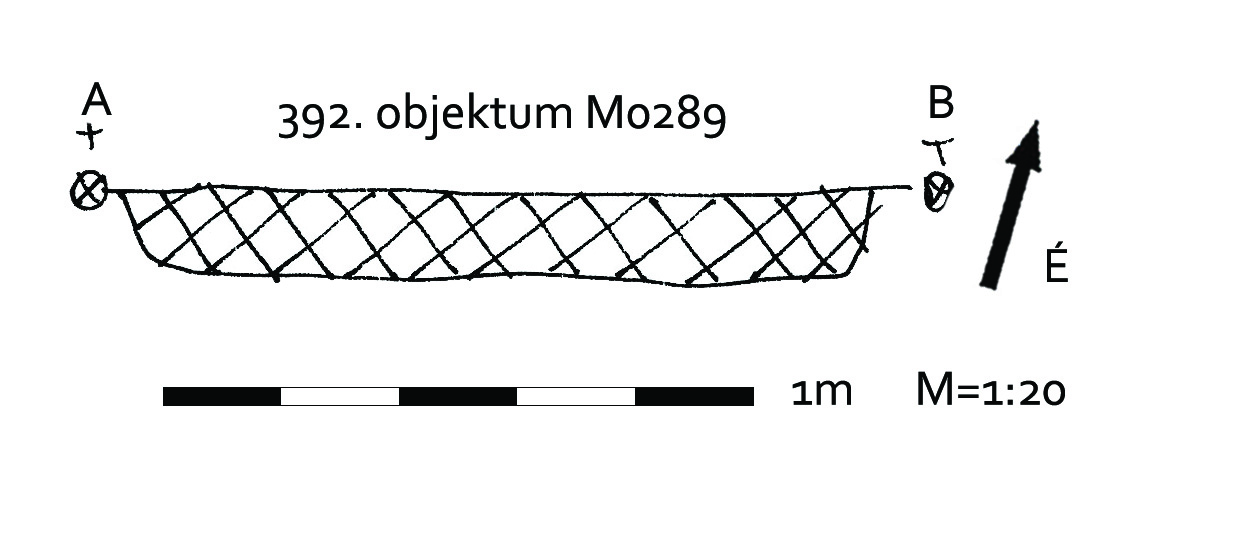 Ovális maszatos, viszonylag jól rajzolódó folttal jelentkezett a 389. -től ÉK-re. Meredek falú, egyenes aljú, szürkésbarna betöltésű, ovális alaprajzú gödör. D-i felében az alját túlbontottuk.