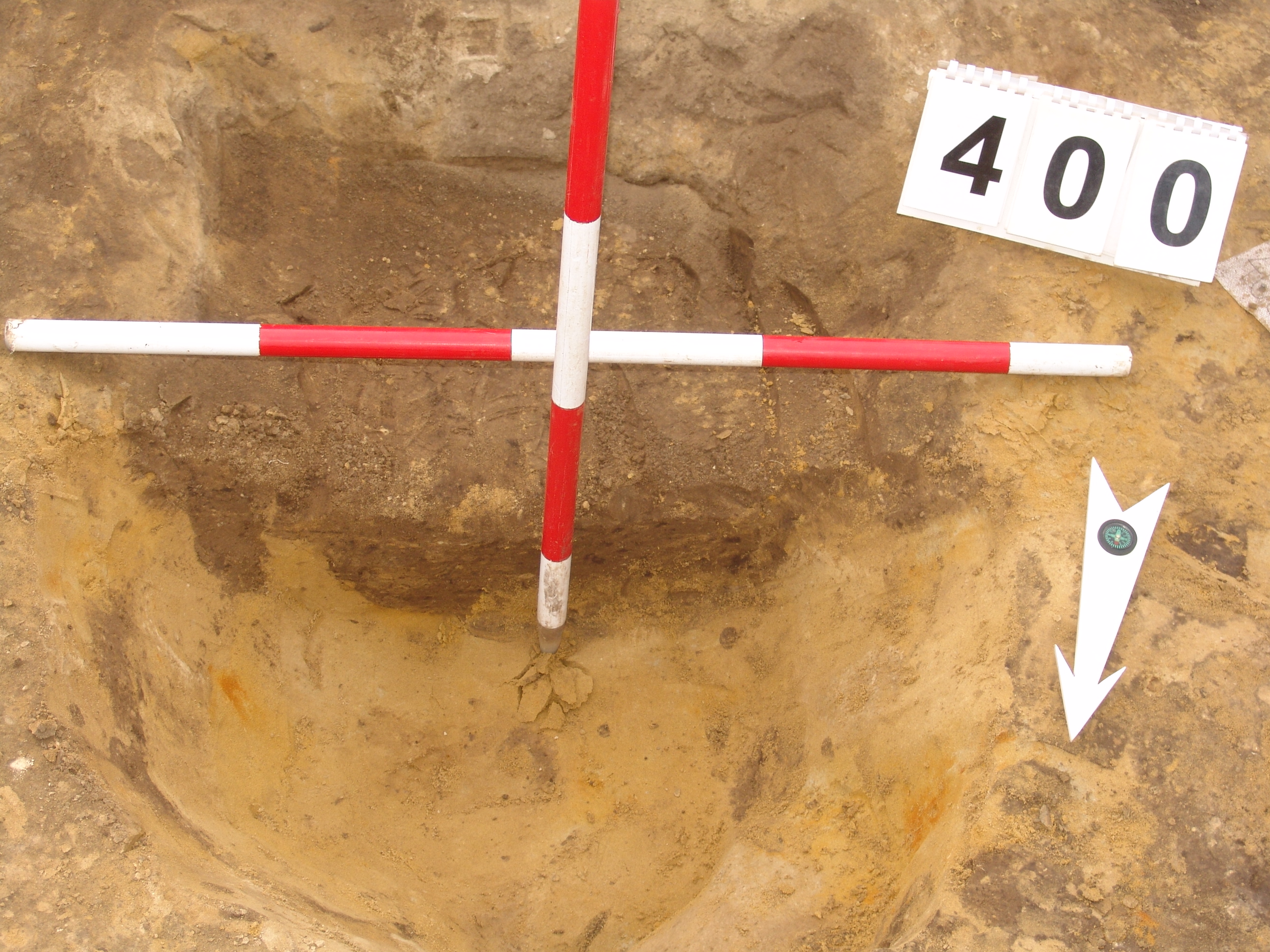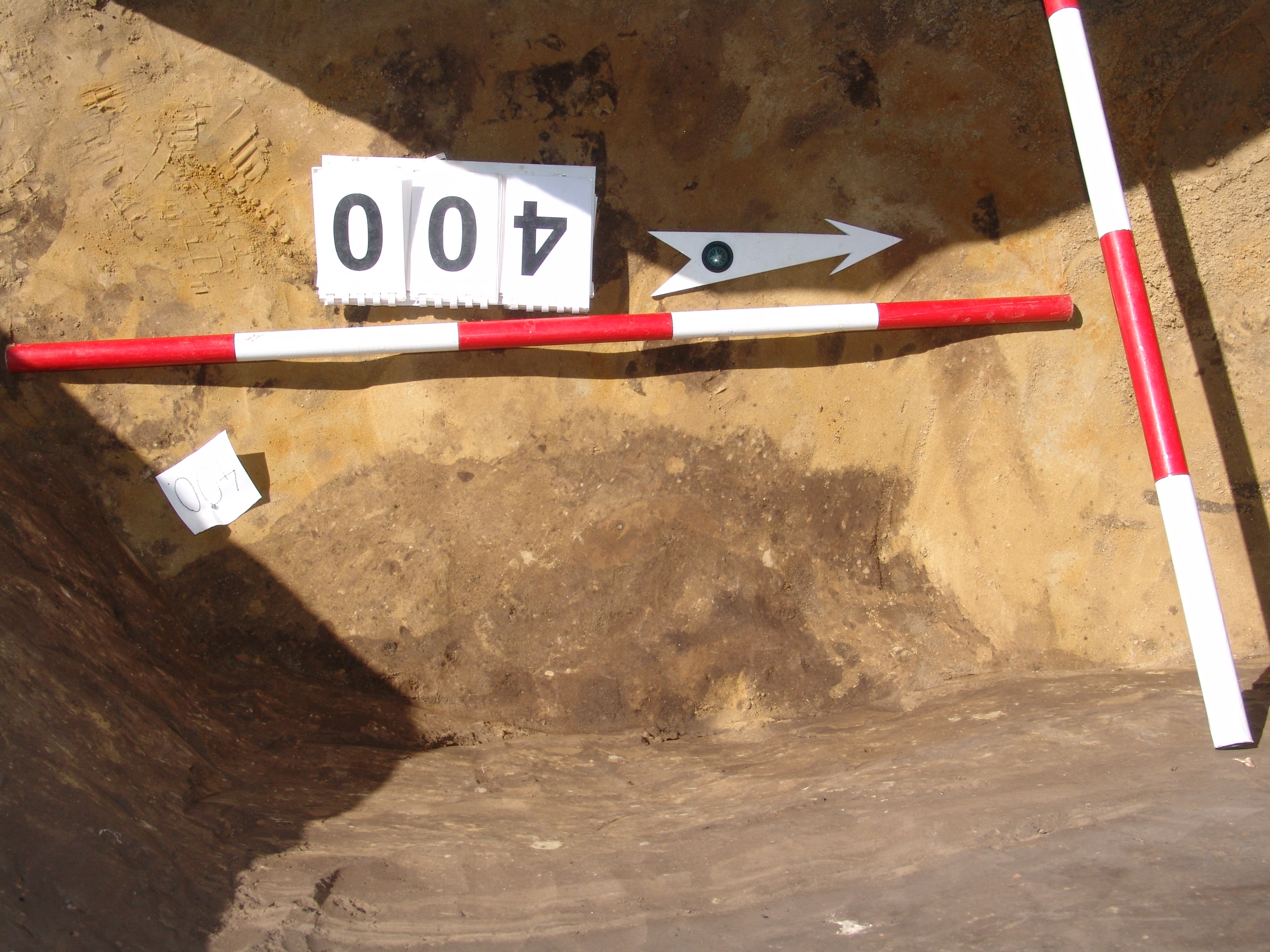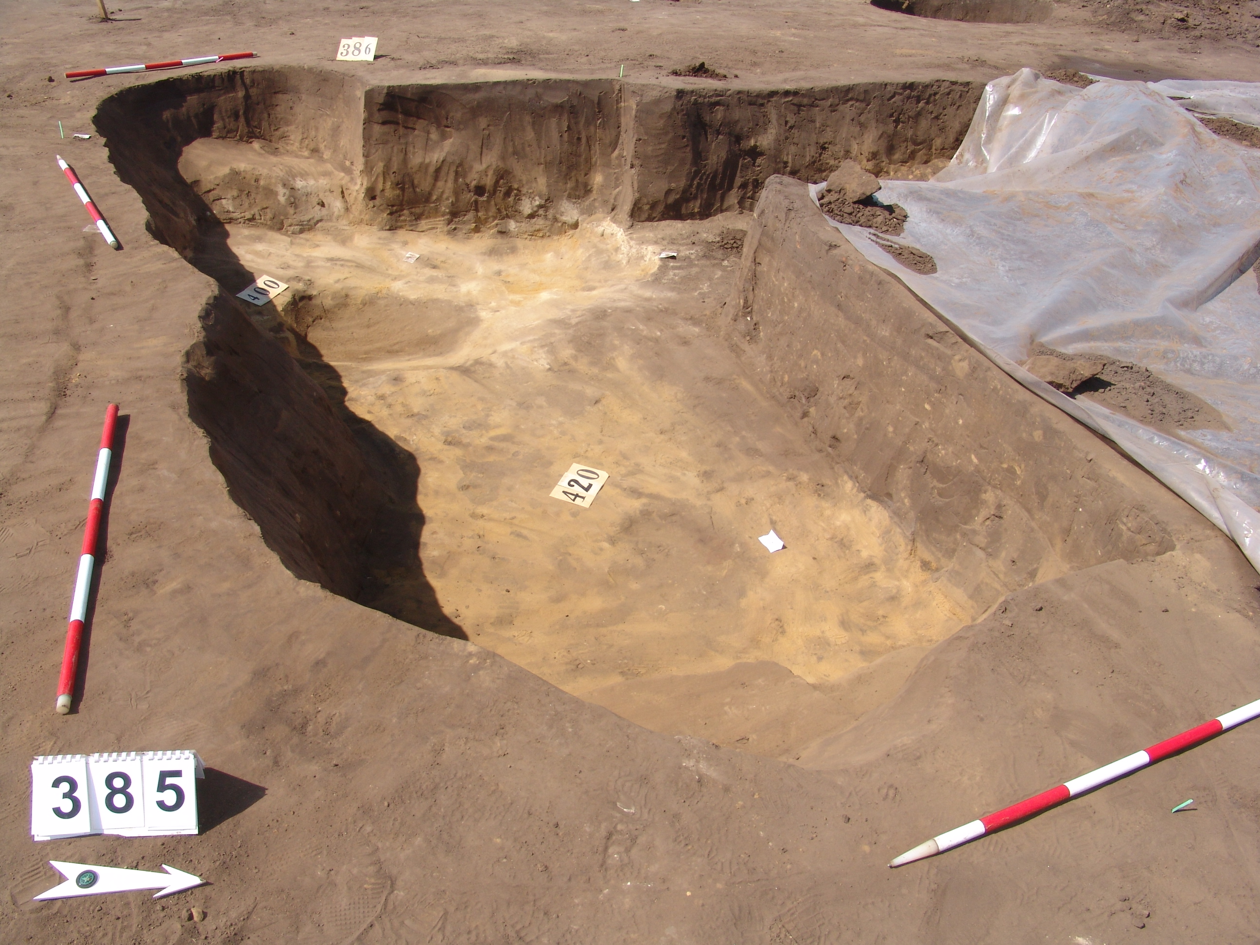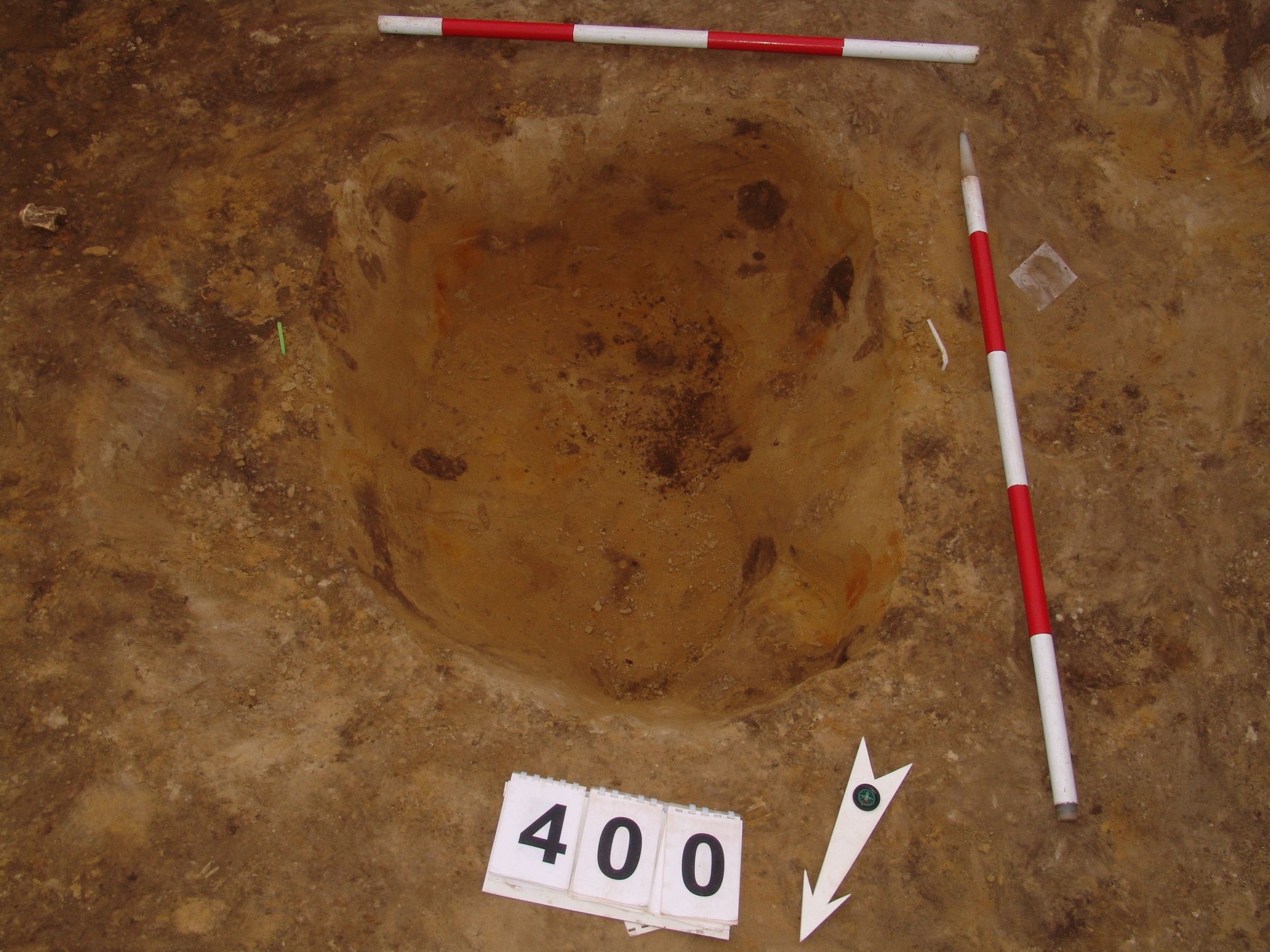 A 386-387. obj. bontásakor a 387. ház DNy-i sarka alatt kerek folttal jelentkezett. Ovális alaprajzú, meredek falú, íves aljú gödör.