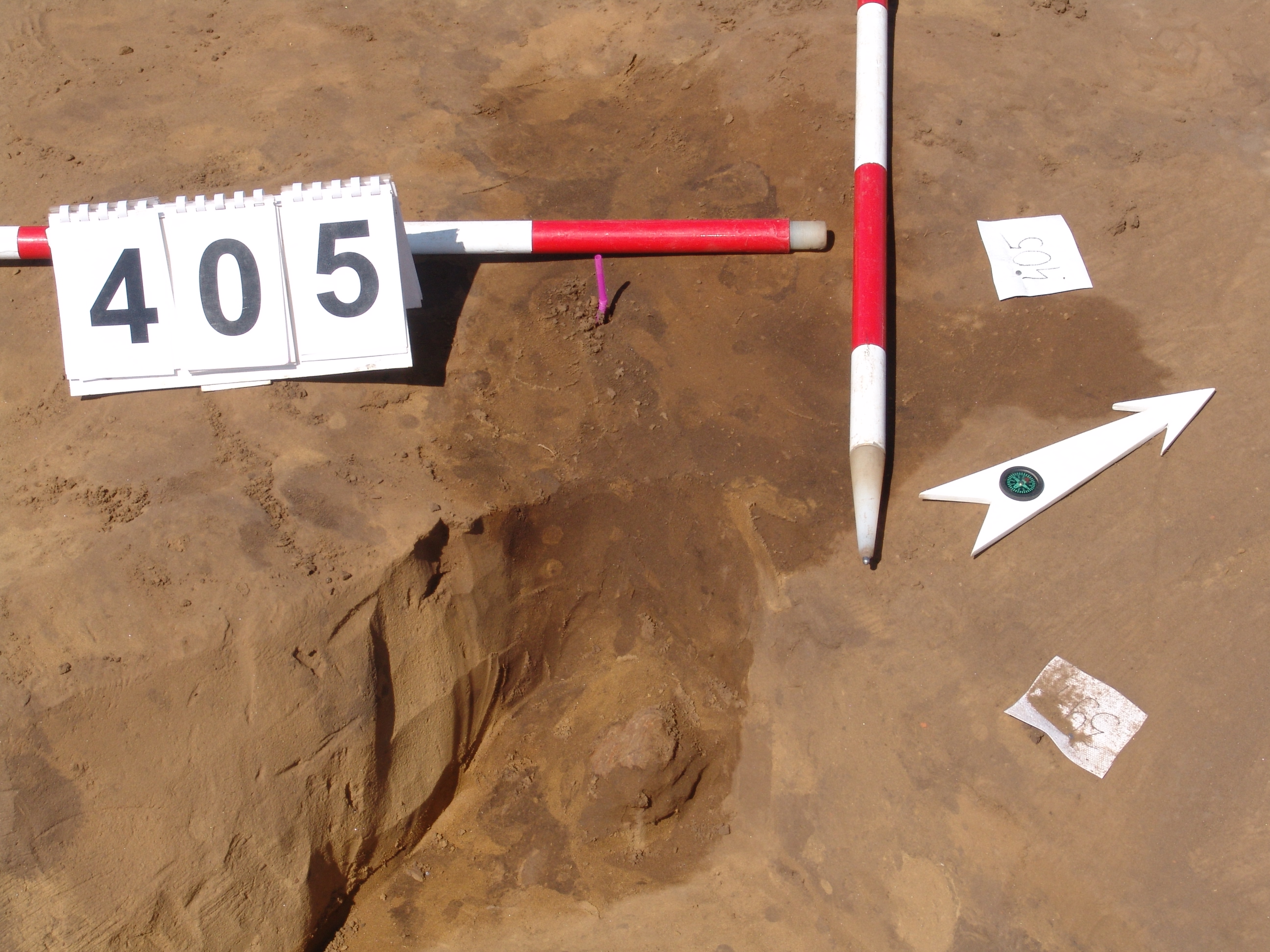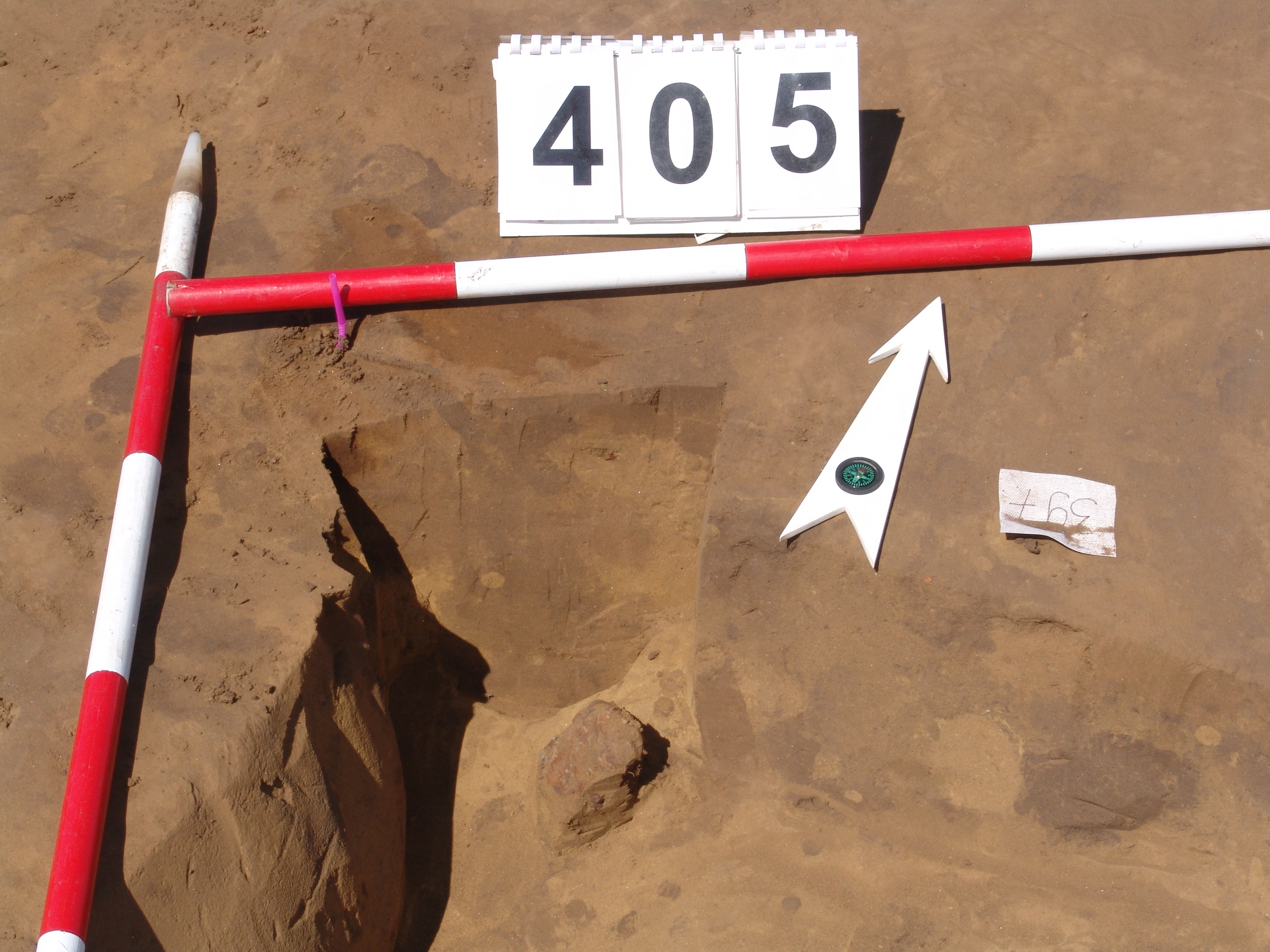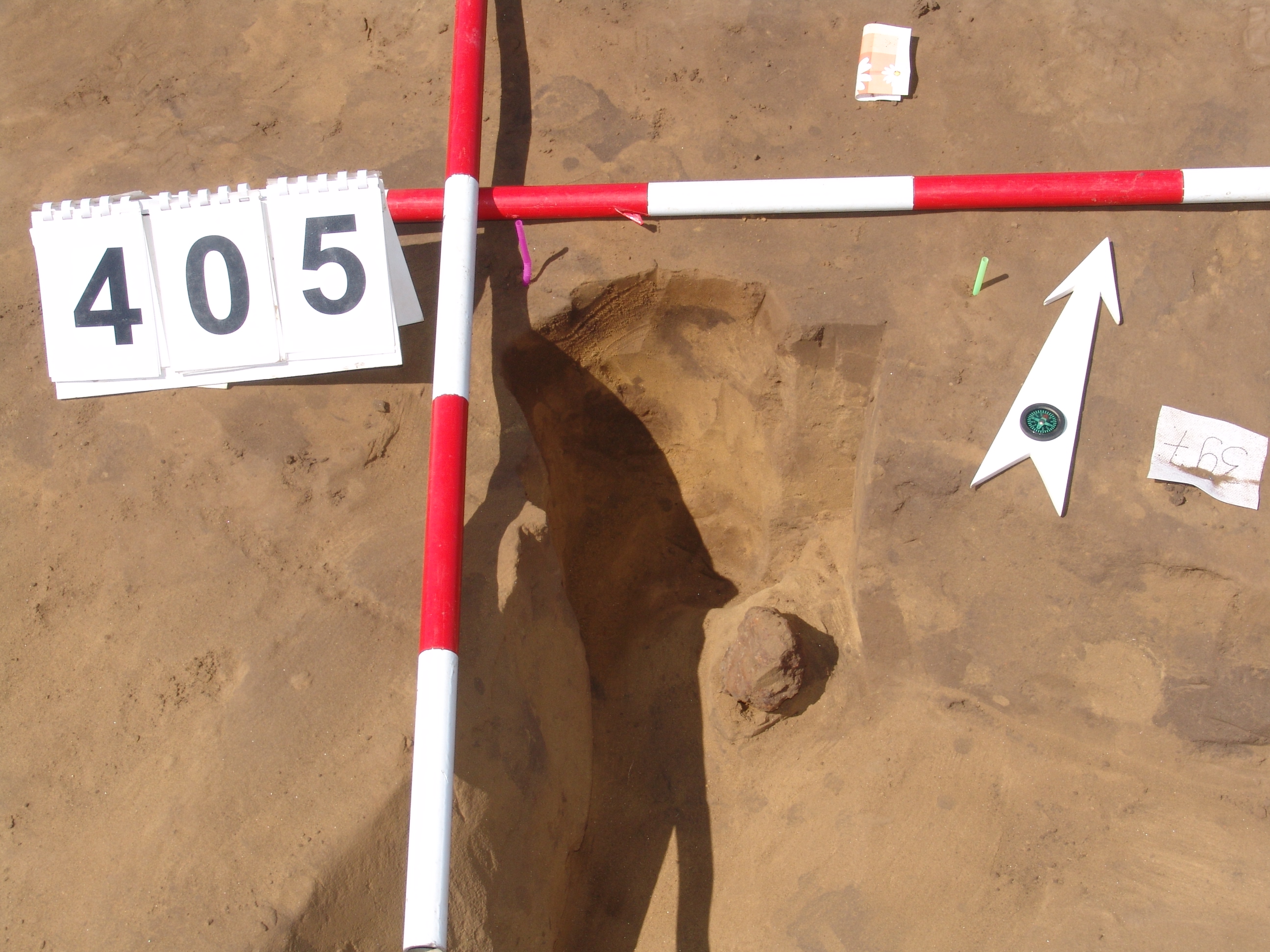 A 395. ház ÉNy-i sarkán, a sarkon kívül a kör alaprajzú folttal jelentkezett. Egynemű szürkésbarna betöltésű. Fala kissé íves, alja is íves. A cölöplyuk és a ház találkozásánál egy vasbucát bontottunk ki. Átm. 16 M: 26