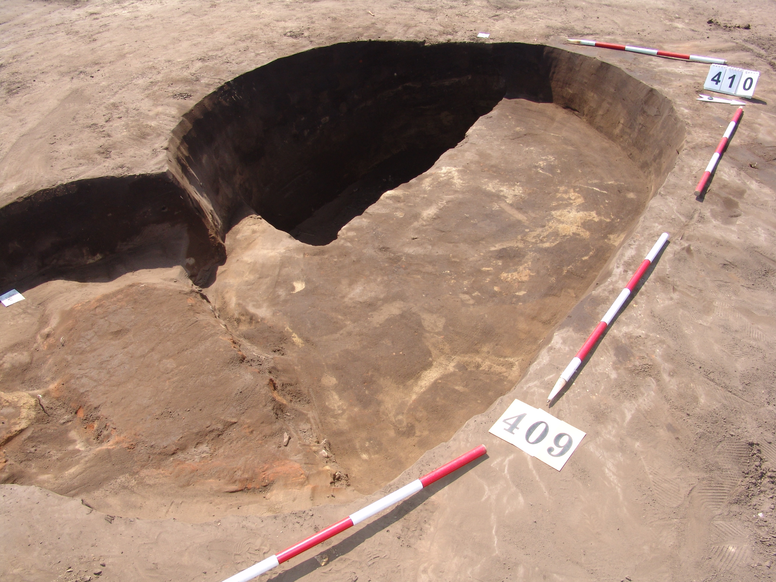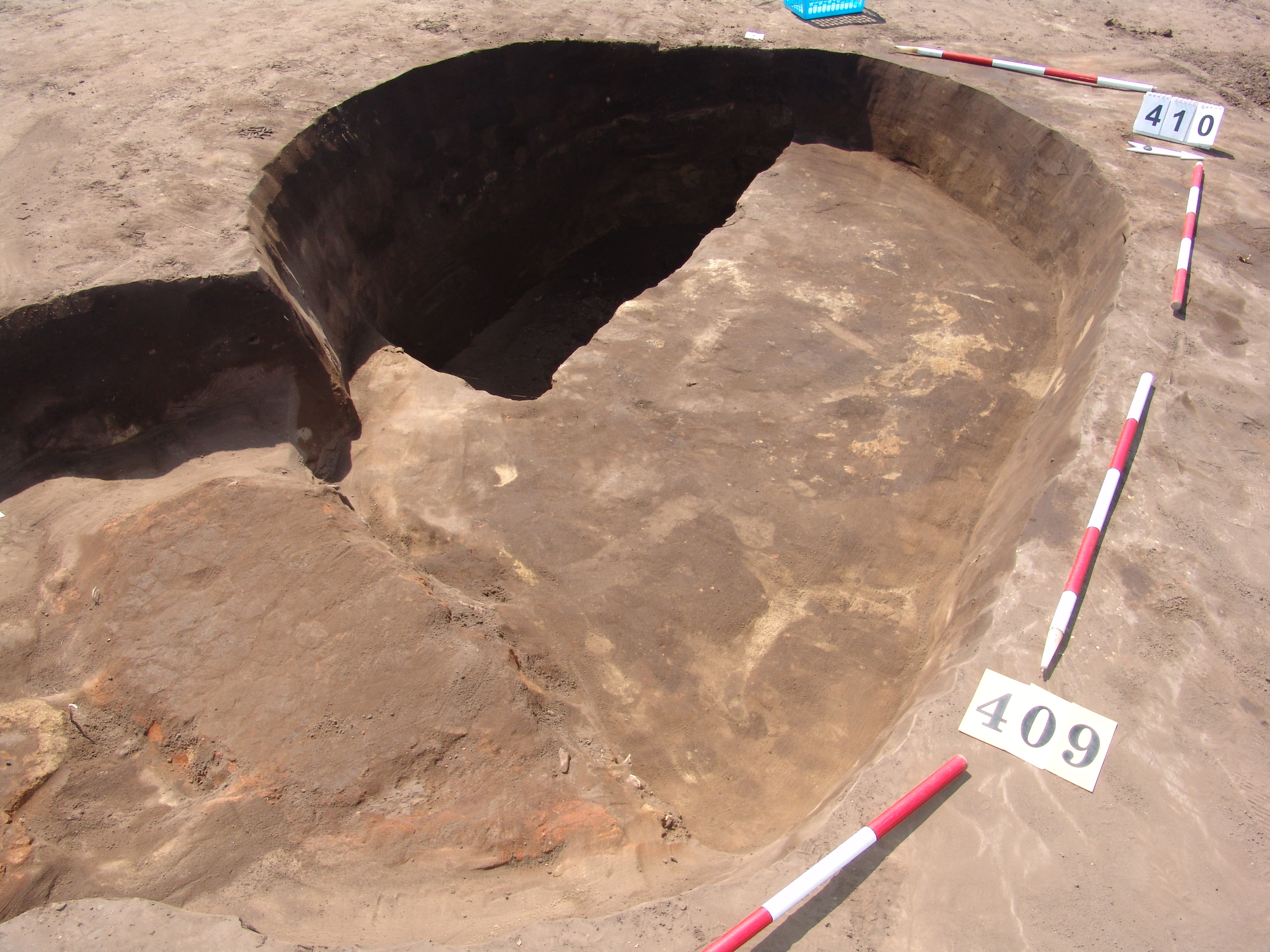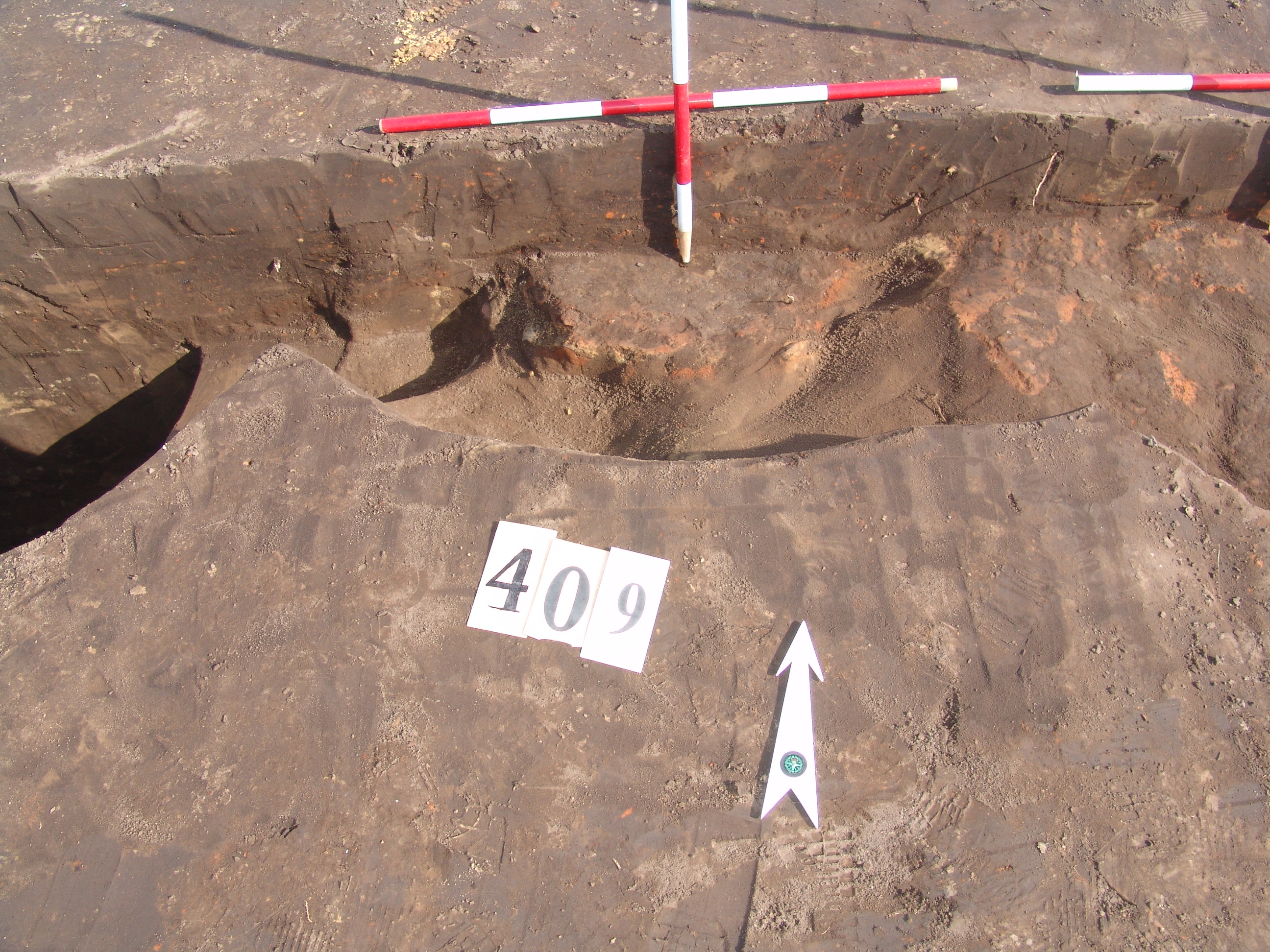 Maga a 409. gödör valószínűleg a 408. munkagödre. Betöltése: a kemence felőli oldalon erősen paticsszemcsés fekete, a Ny-i oldalán kissé réteges sötét. Rajta van a 410. objektumon. Előbb a 408. kemence gödre lehetett, majd hozzátapasztottak megújításként