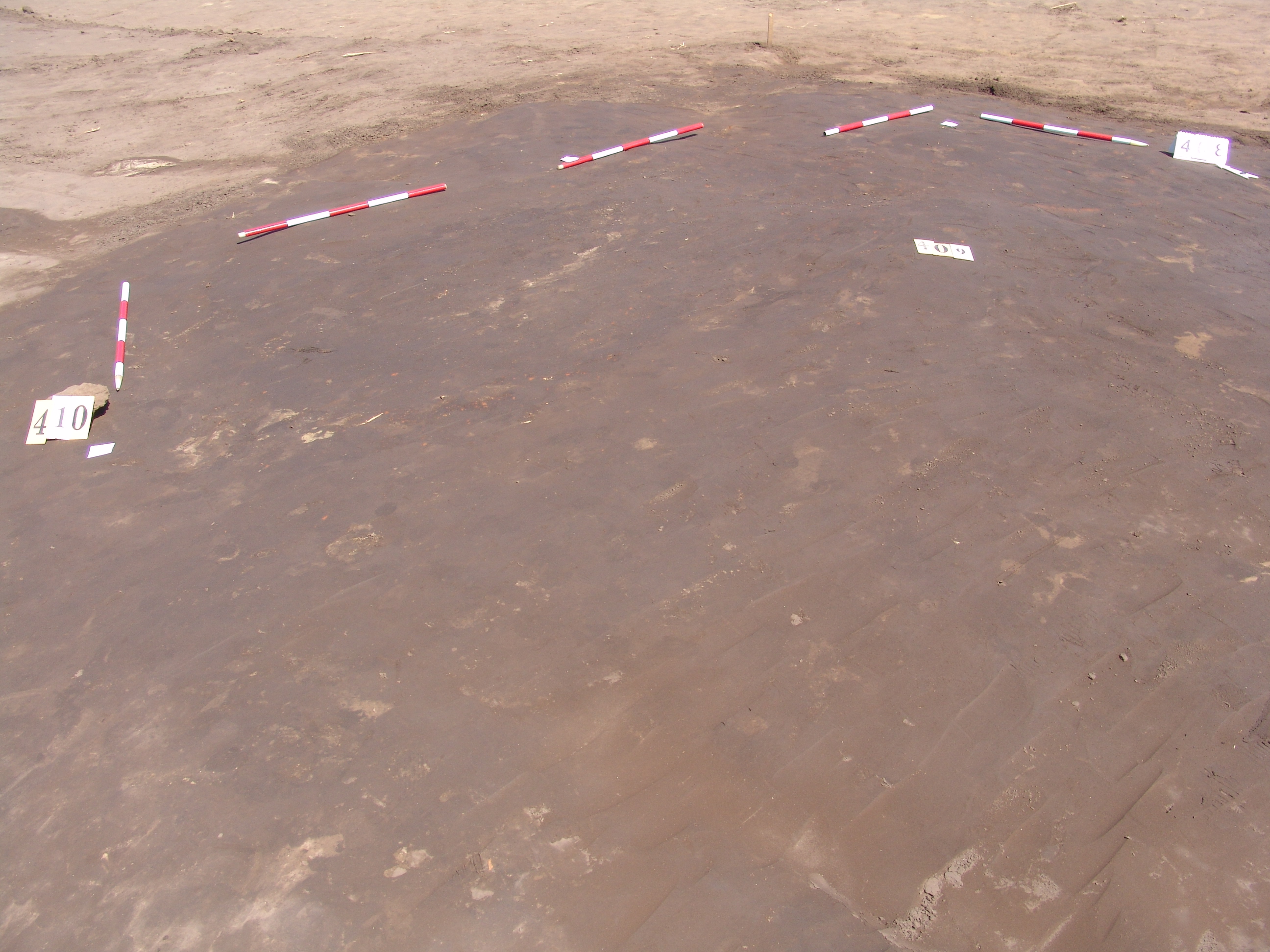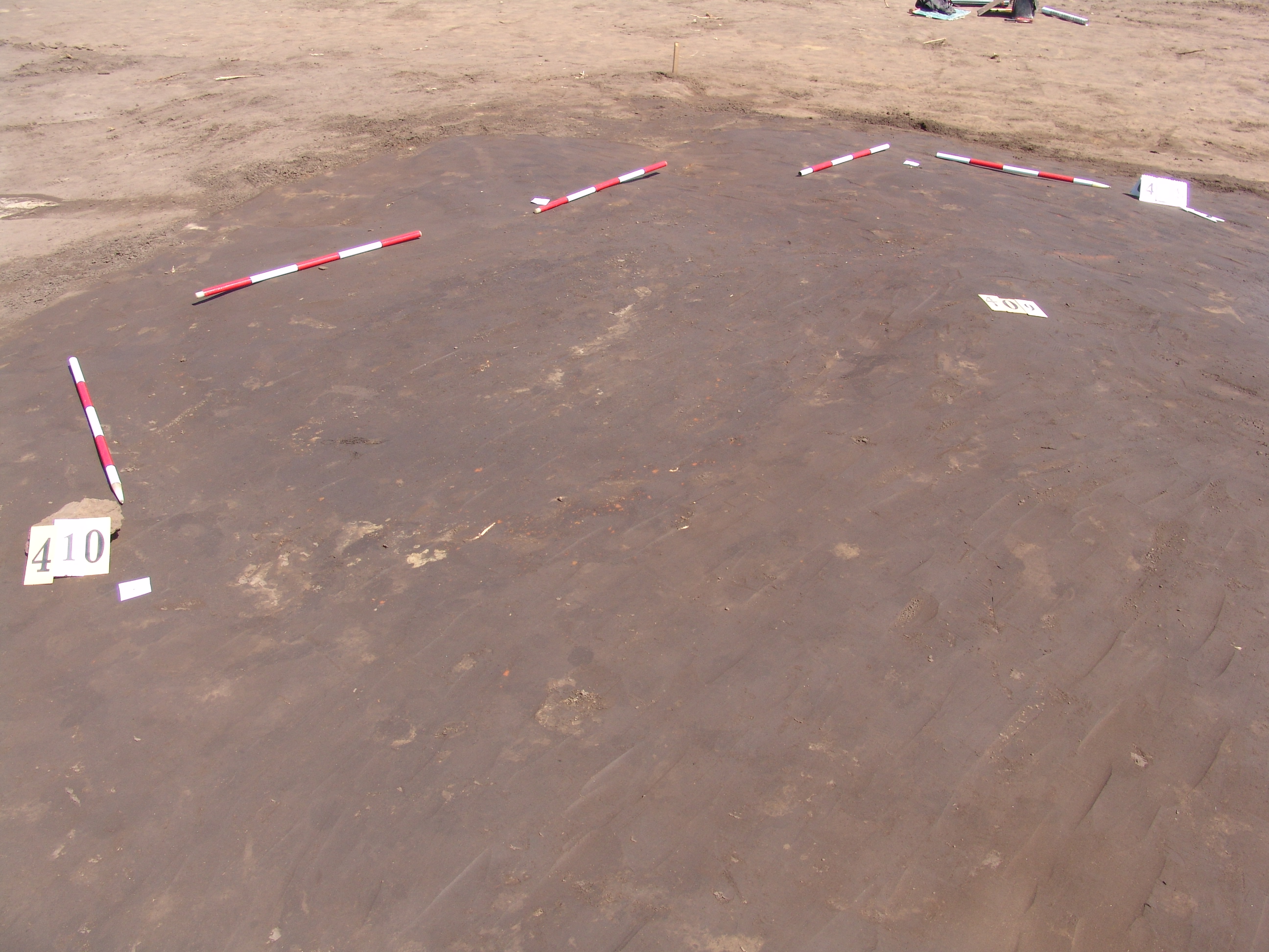 A 408. objektum tüzelőgödre lehet: attól Ny-ra. Piros szemcsés fekete folttal jelentkezett. Ny-i pereménél beleásták a 410. objektumba. A K-i oldalában a 408. kemence szintje alatt 5-6 cm-re, a nyesési szint alatt 25 cm-re egy másik kemenceplatni jelentkezett (417. obj.)