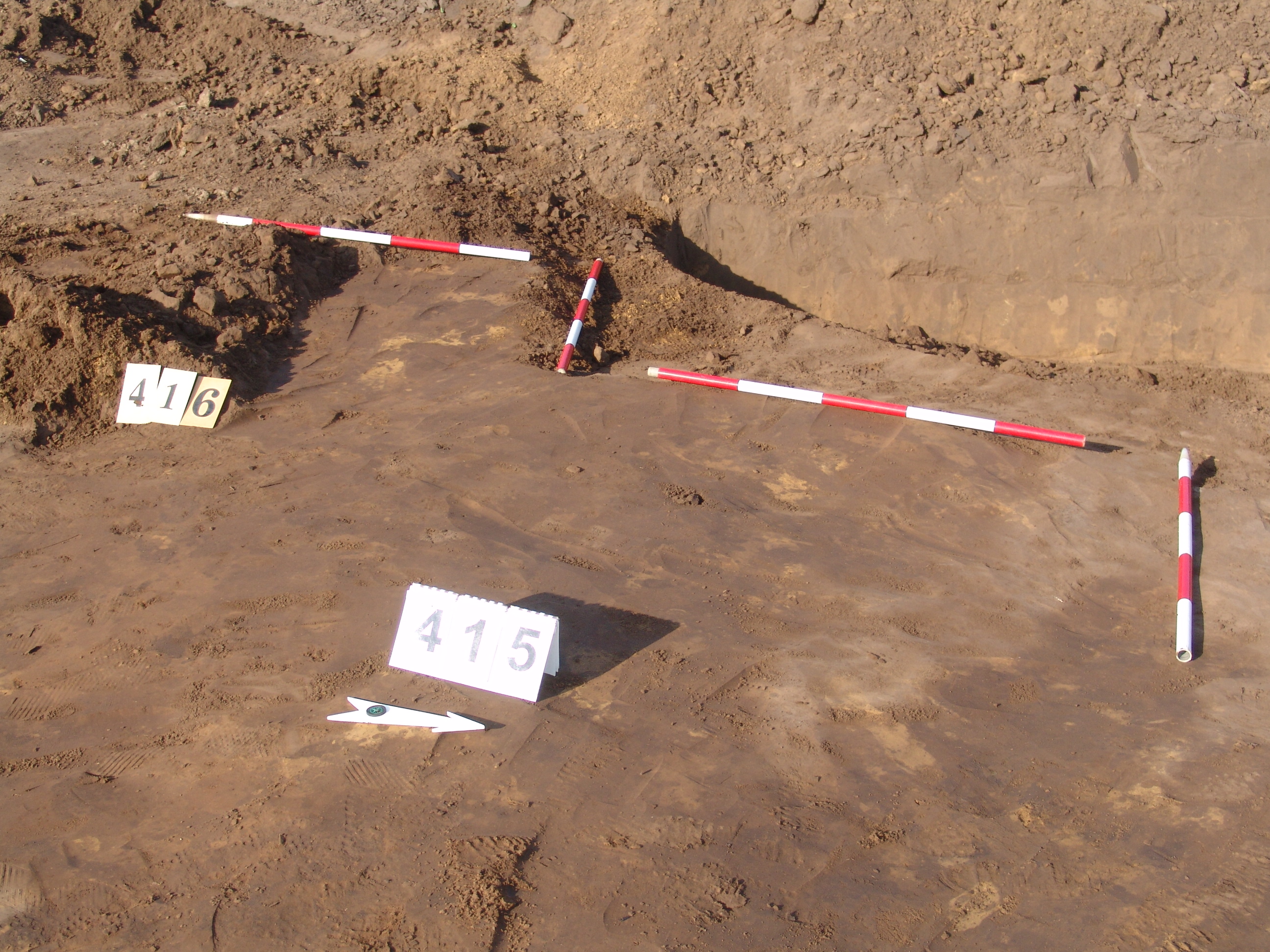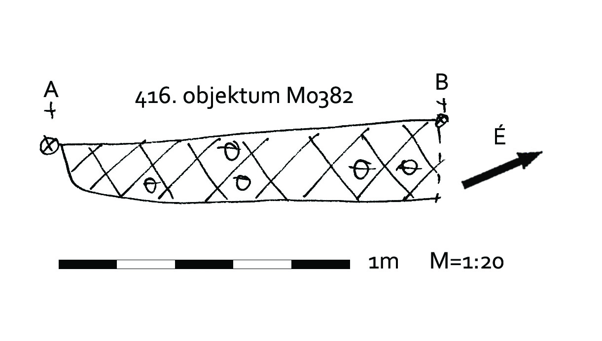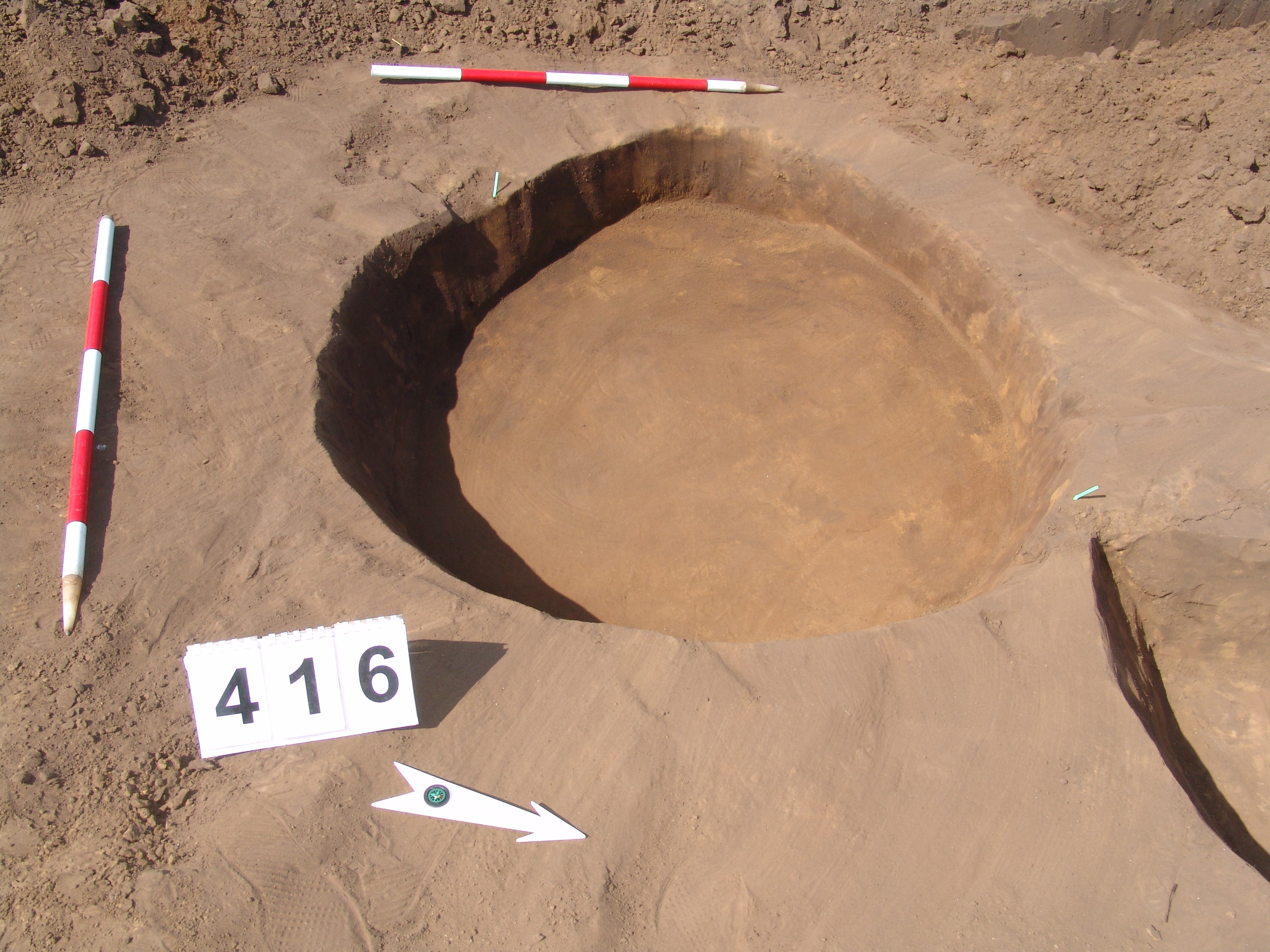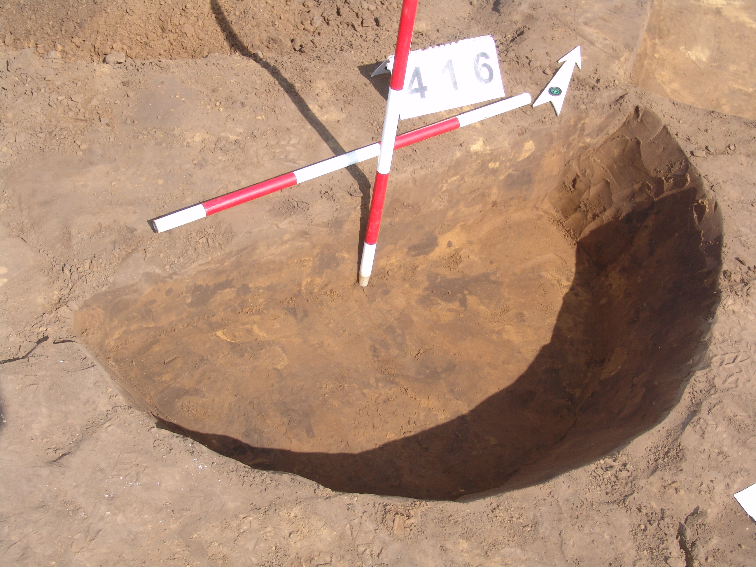 A 415. objektummal összeérő kerek folt, attól DNy-ra. Függőleges falú, egyenes aljú, kör alaprajzú gödör.