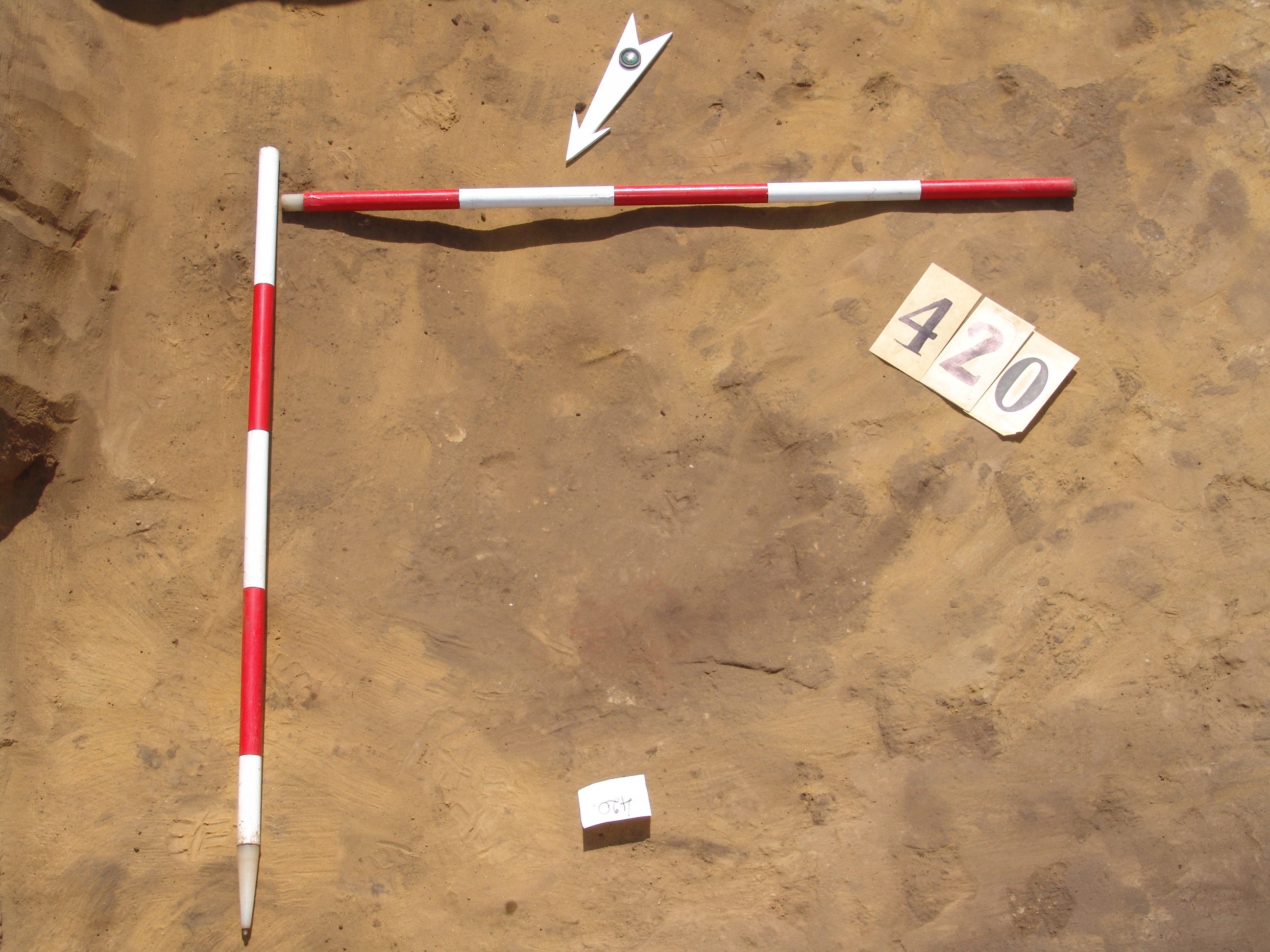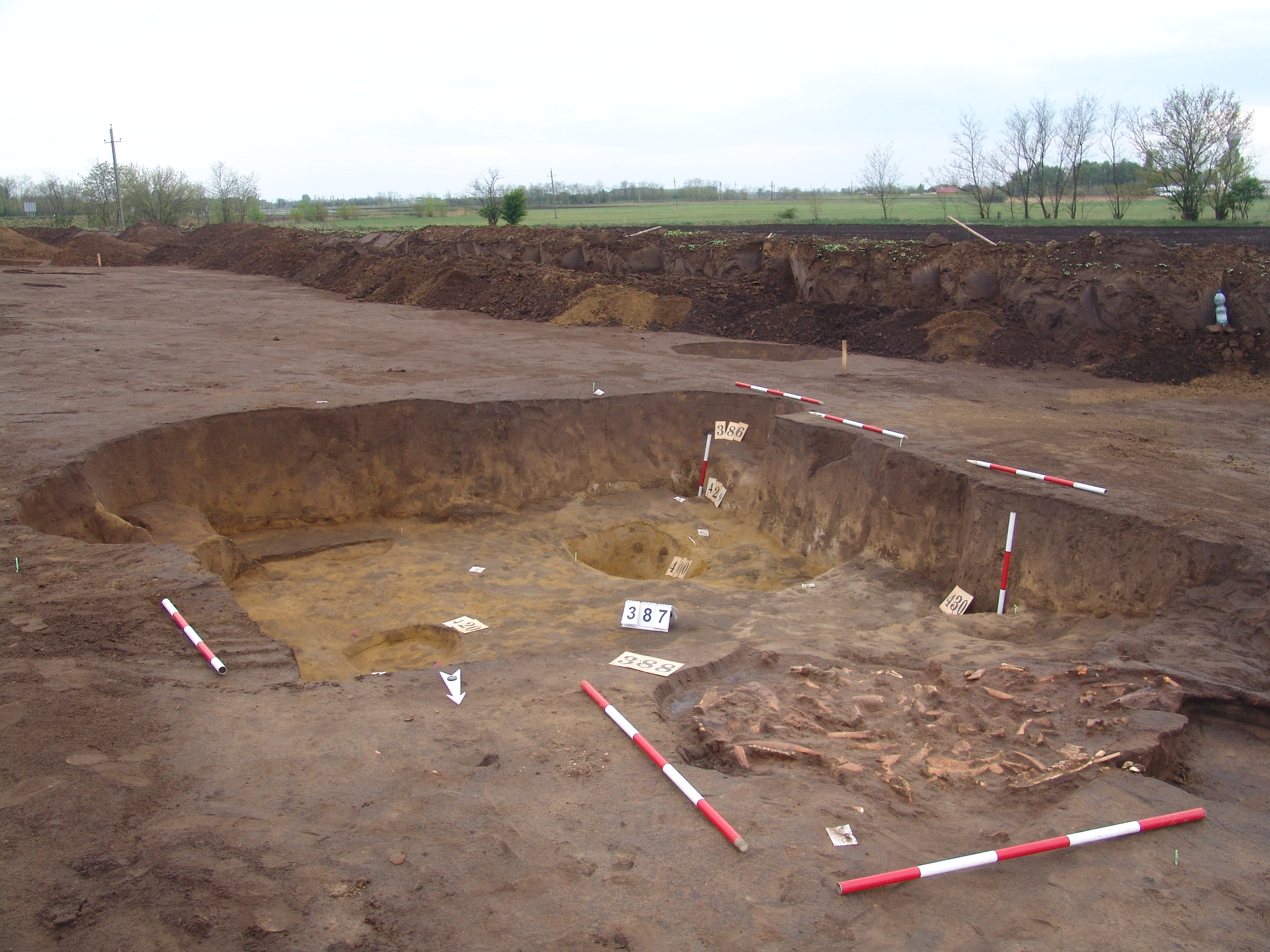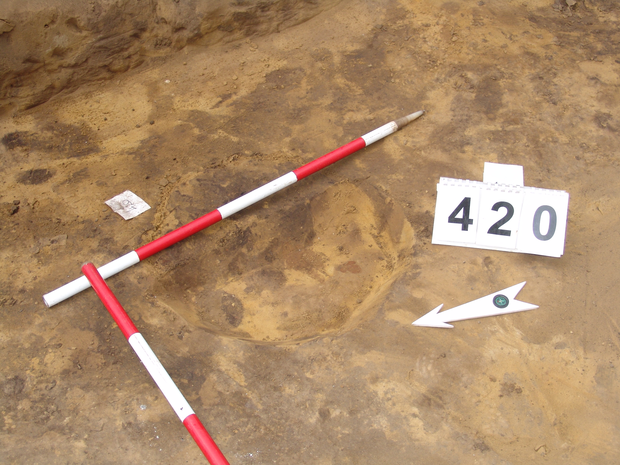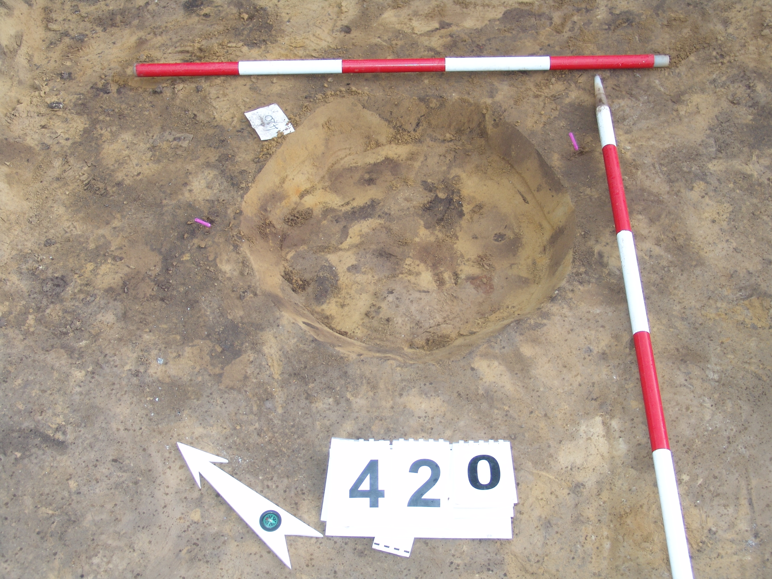 A 397. ház DK-i negyedében az alján jelentkező kerek folt. Betöltése: sötét barnásszürke egynemű. Szabályos kör alaprajzú. Átm. 55-60 cm. A ház padlójától M: 10 cm Fala meredek, alja egyenes