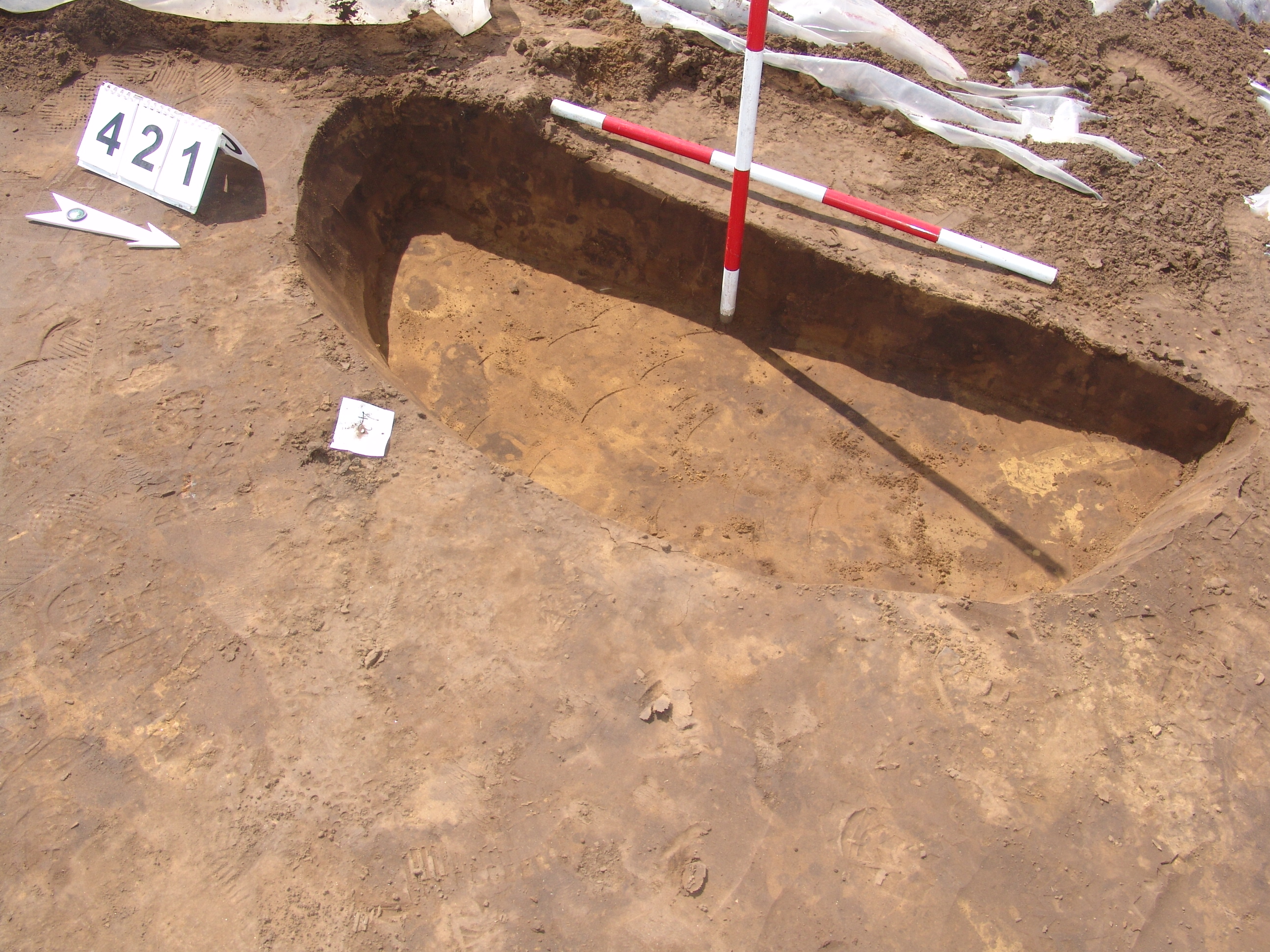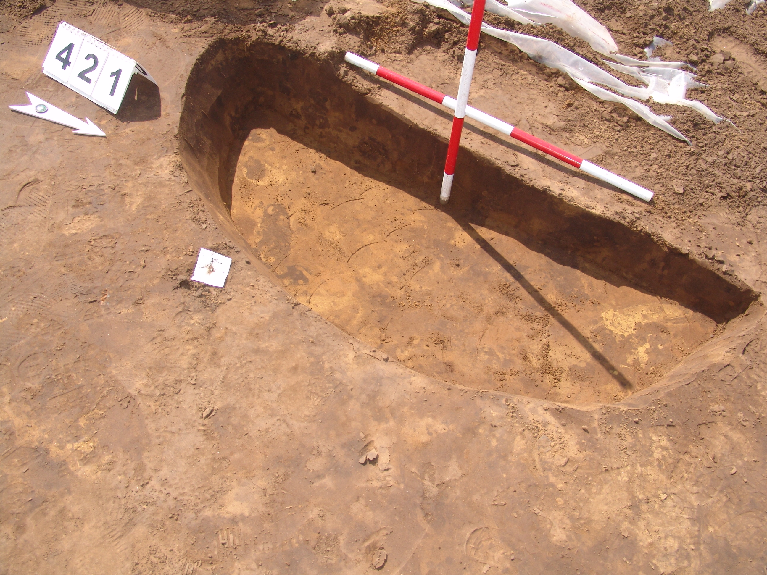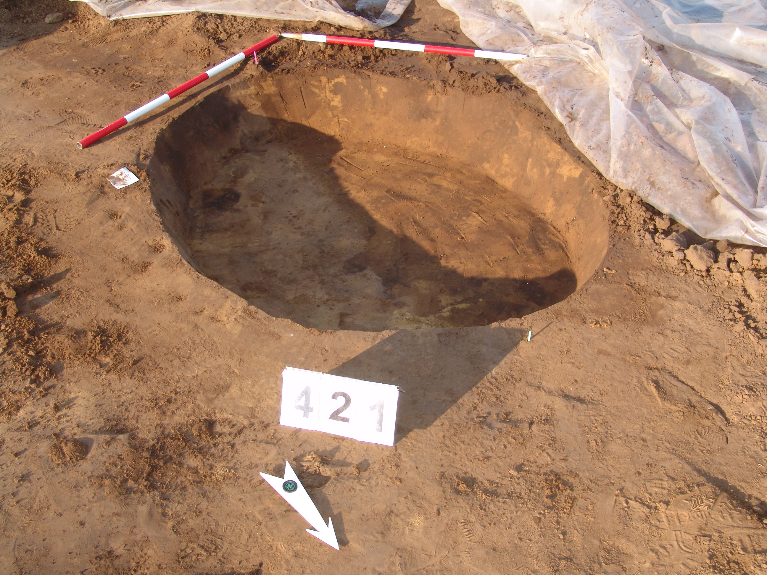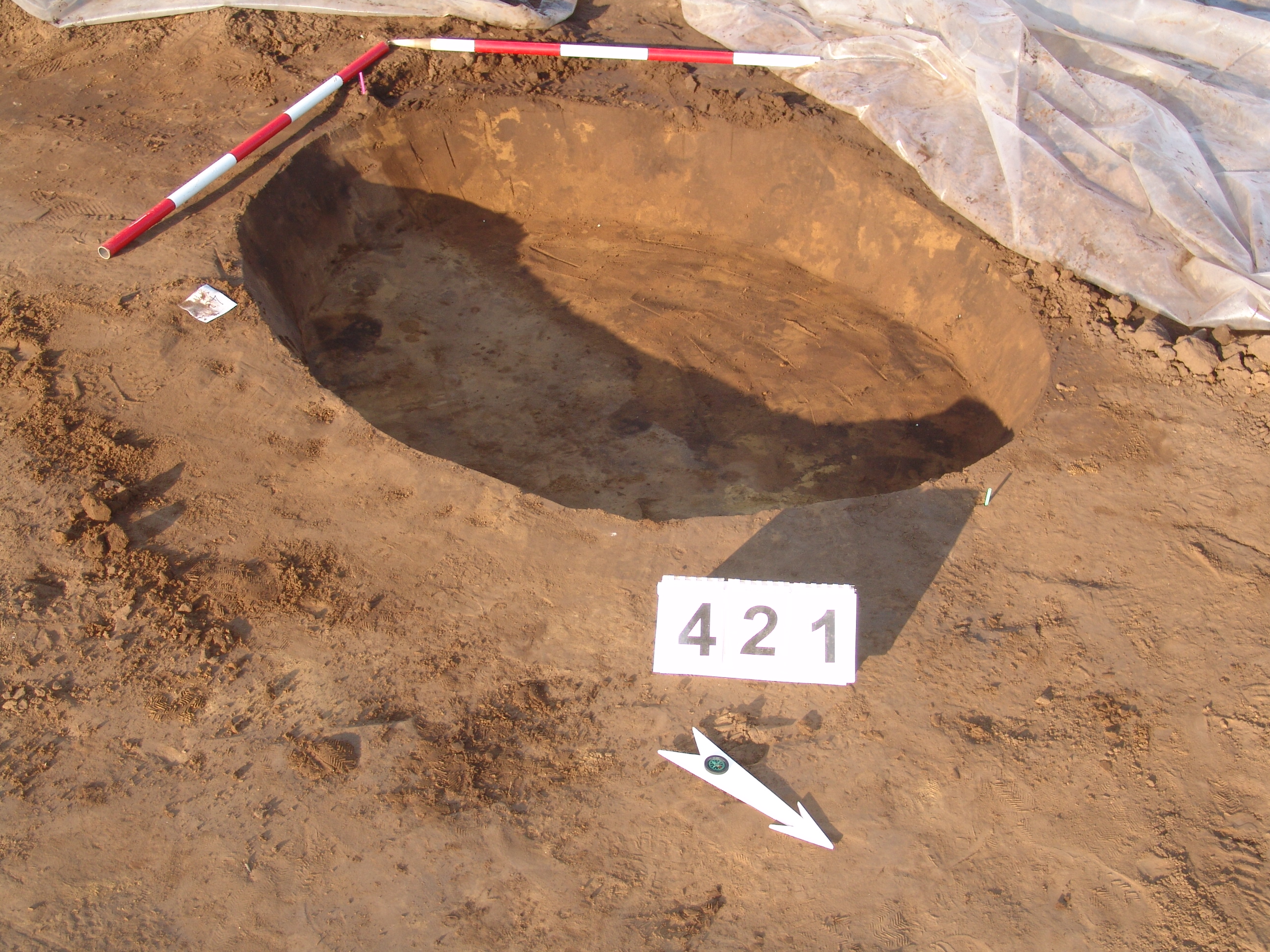 A 373. objektumtól DDNy-ra kisebb kerek folttal jelentkezett. Kör alaprajzú, meredek falú, egyenes aljú gödör. Betöltése: egynemű barnásszürke.