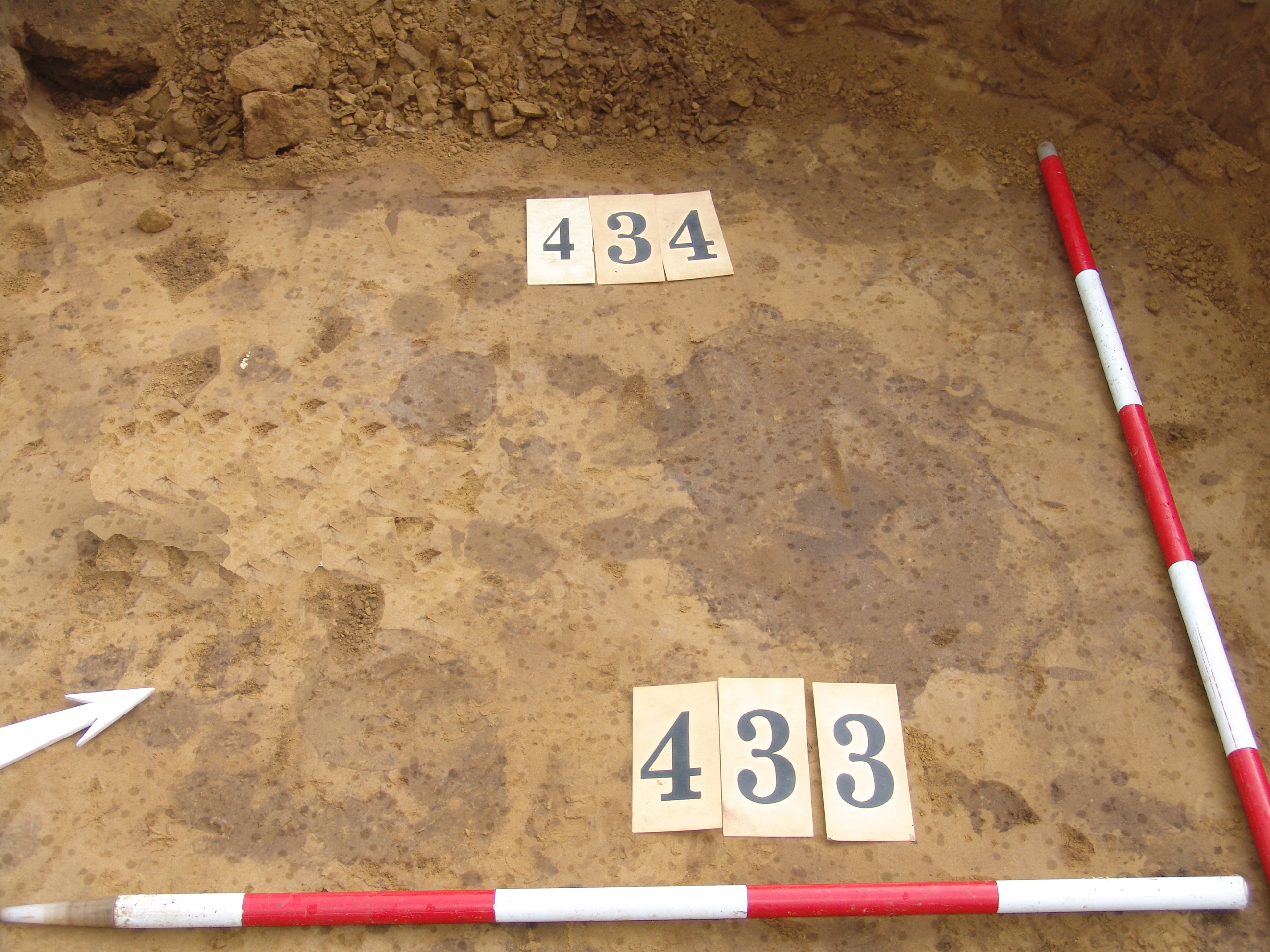 A 369. ház ÉNy-i sarkánál 2 kerek folt jelentkezett, közülük az É-ibb a 434. A bontáskor állatjáratnak bizonyult.